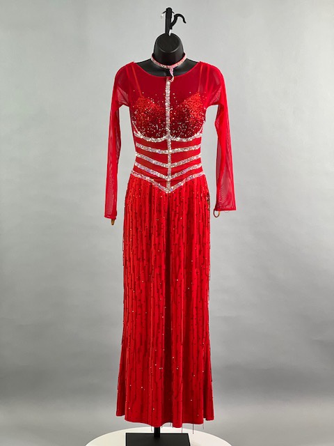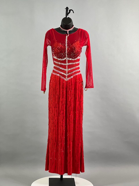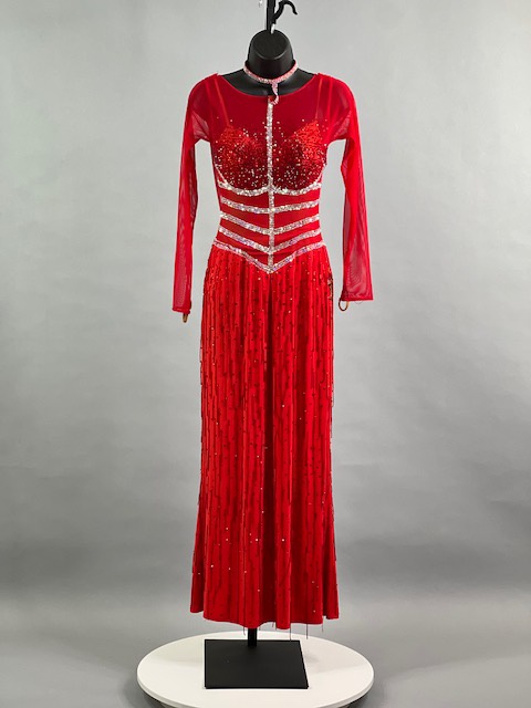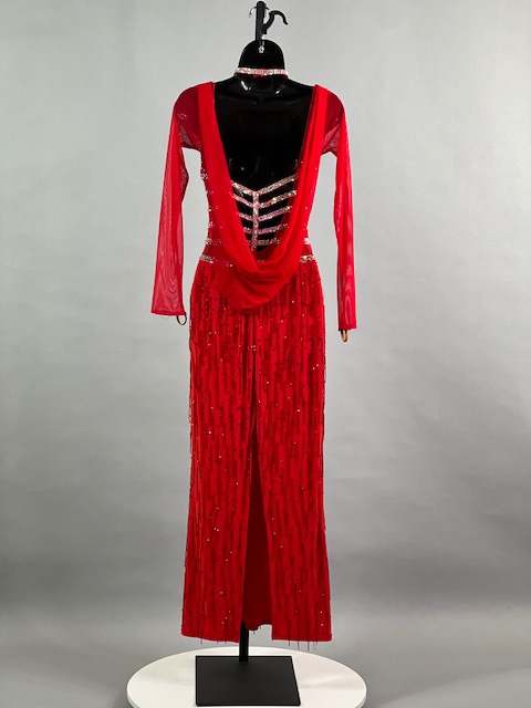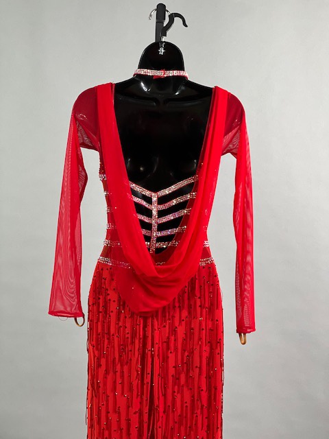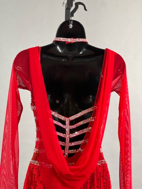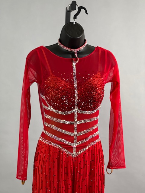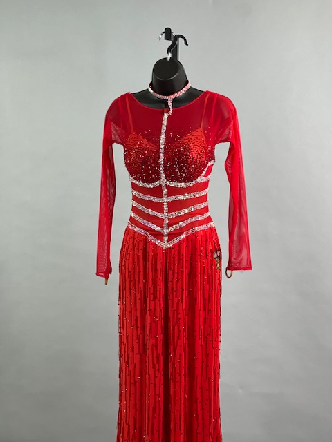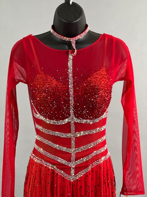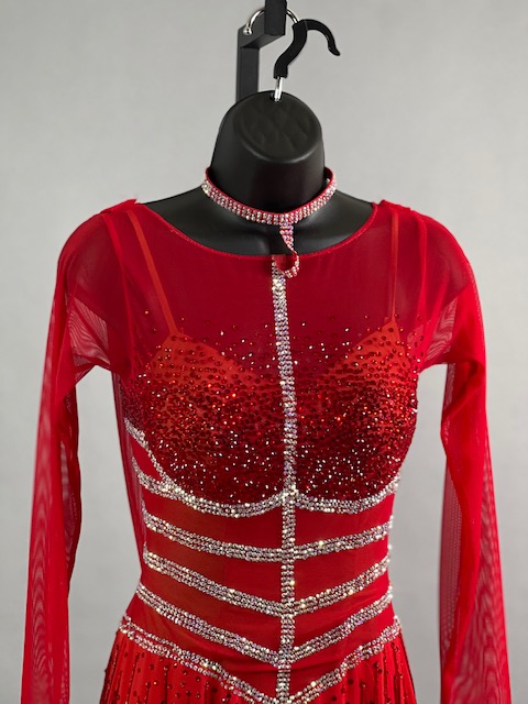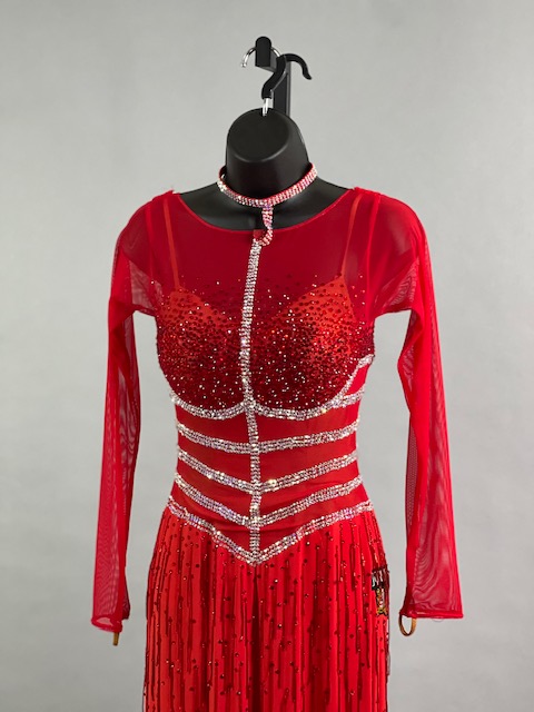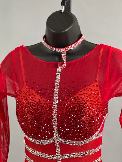 This is a beautiful red Rhythm/Latin Dress designed by Jordy! It moves amazing on the dance floor. Great for all around competition. Trimmed with Austrian Crystals.