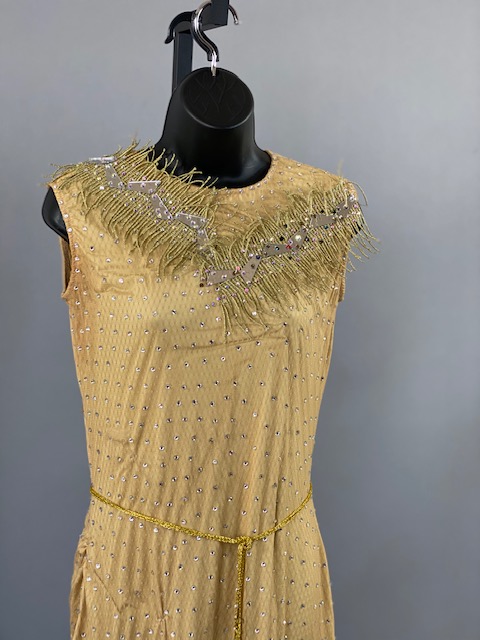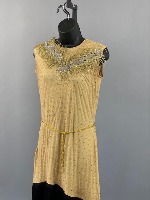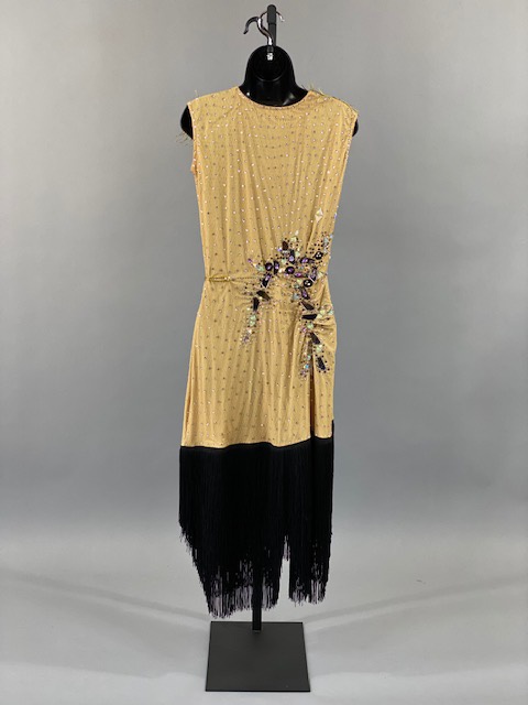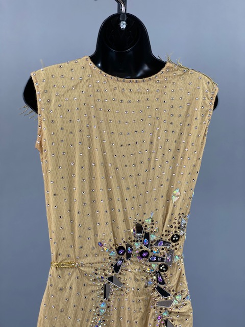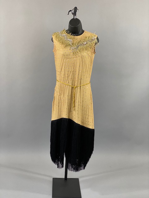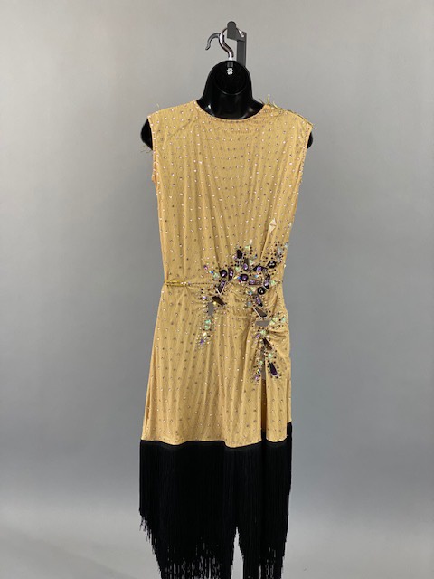 This is a beautiful beige dress with black fringes, great for your next competition or showcase. Fringes creates a great effect on the dance floor. This dress is stoned with Austrian Crystals.