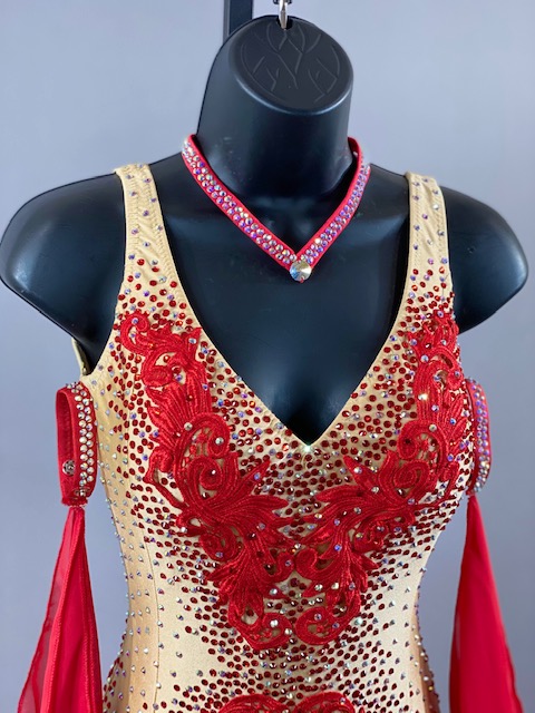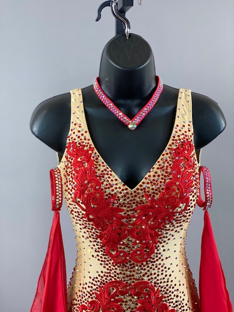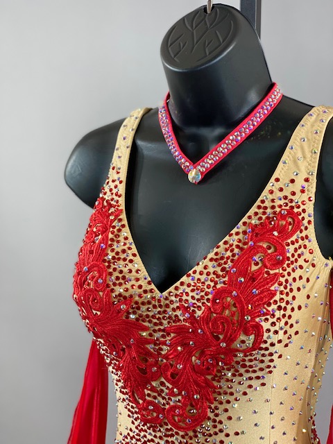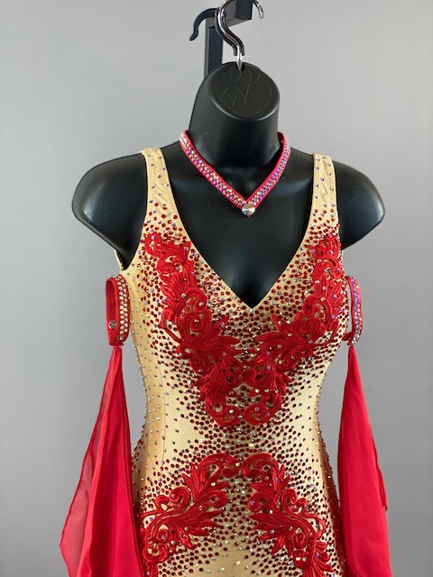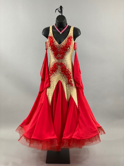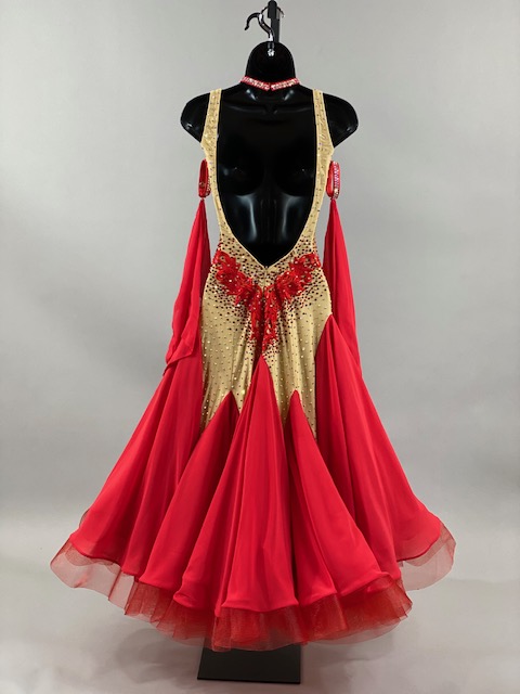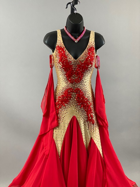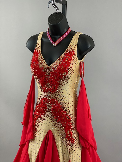 This is an fantastic beige and red standard dress. Skirt creates a great effect on the dance floor. Trimmed with Austrian Crystals.