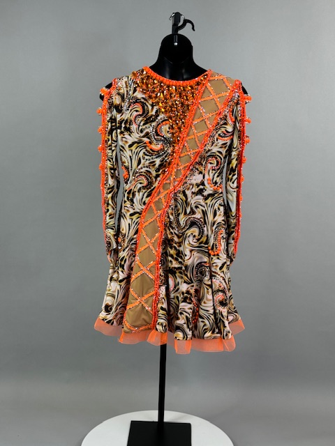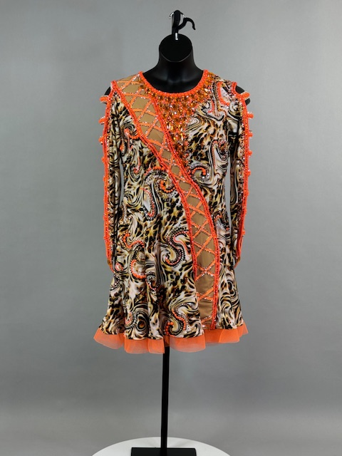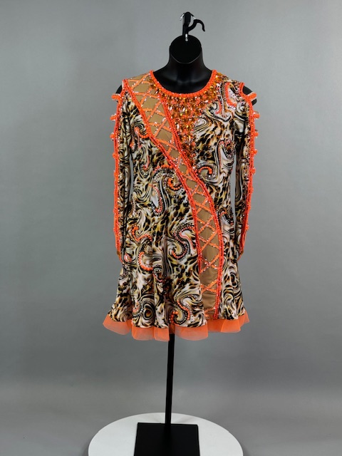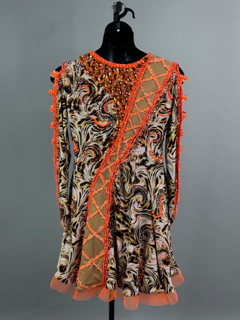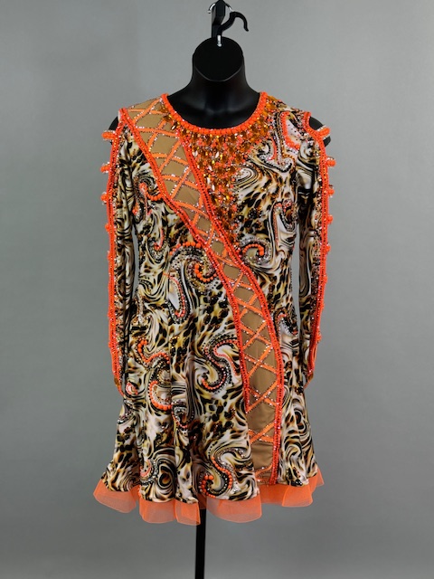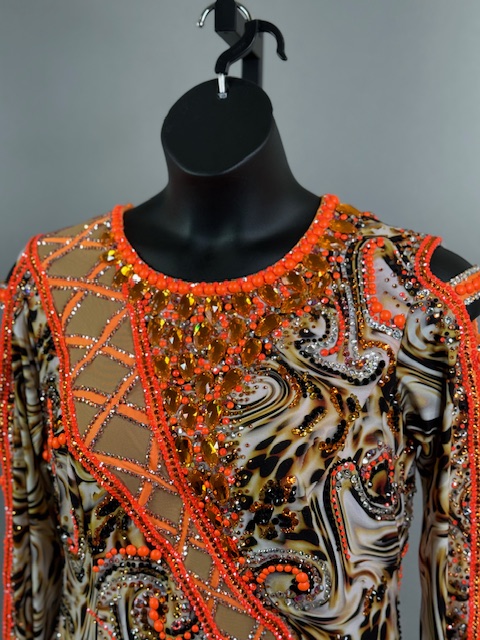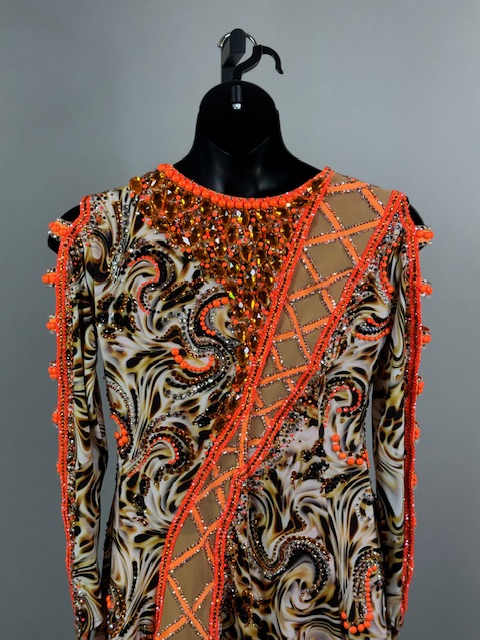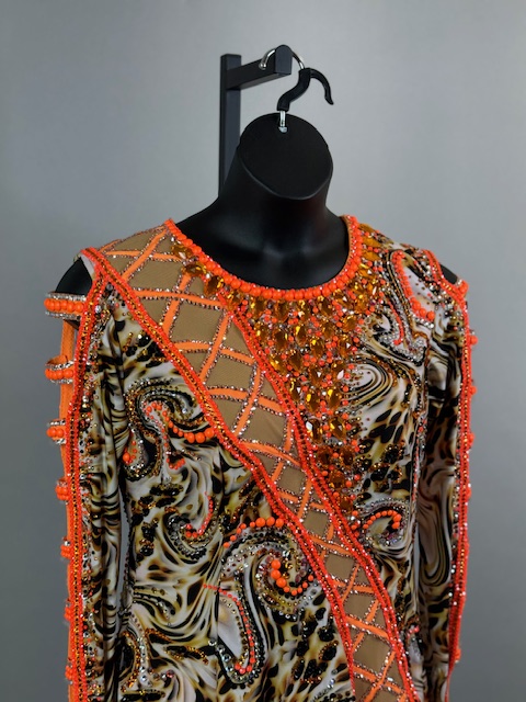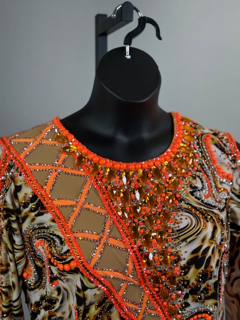 This is a beautiful leopard print combined with bright orange stones Rhythm/Latin dress designed by Artistry in Motion! It’s a bright unique style, an eye catcher on the dance floor. Trimmed with Austrian Crystals.