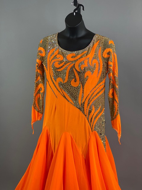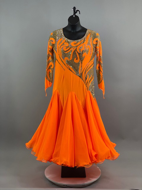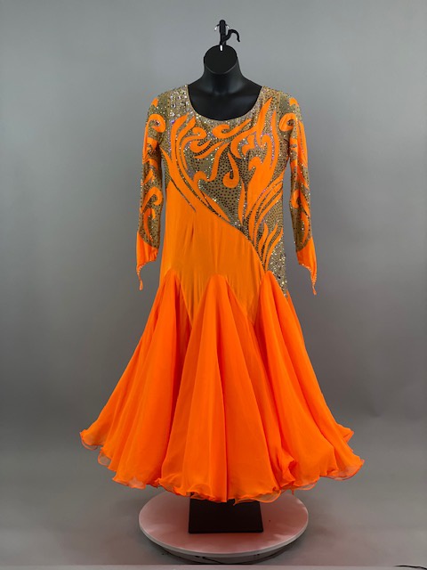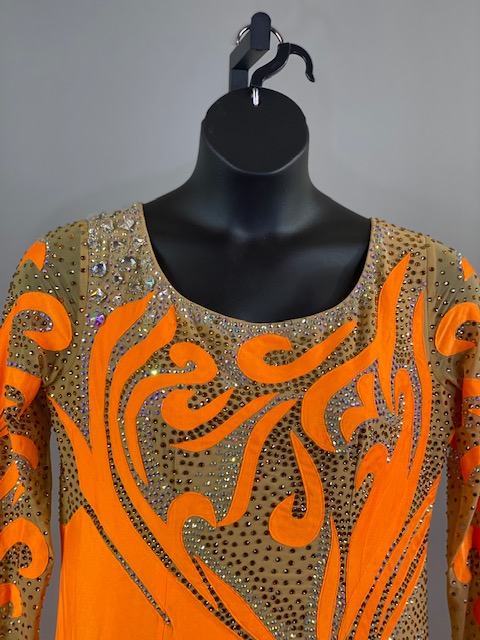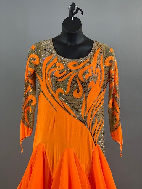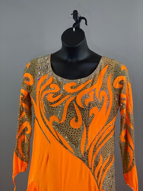 This is a beautiful tangerine smooth/standard dress! This dress moves amazing on the dance floor! Great for competition! Trimmed with Preciosa Crystals.