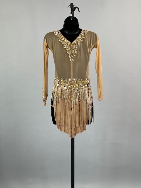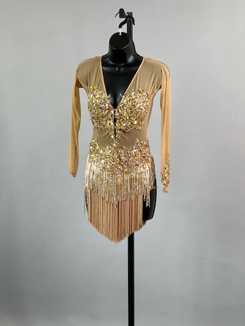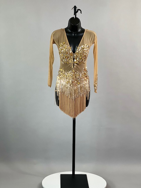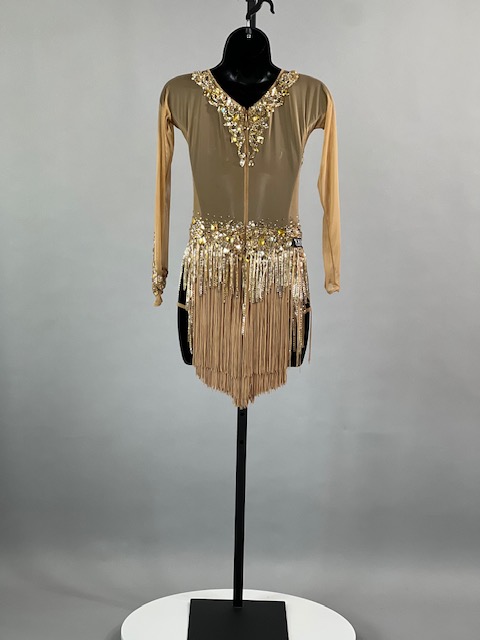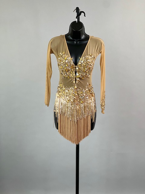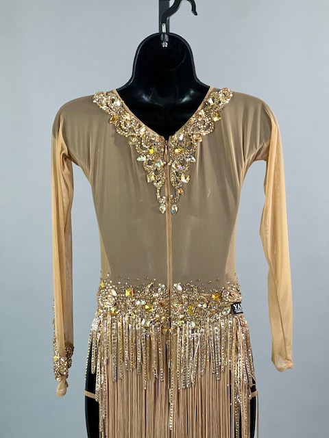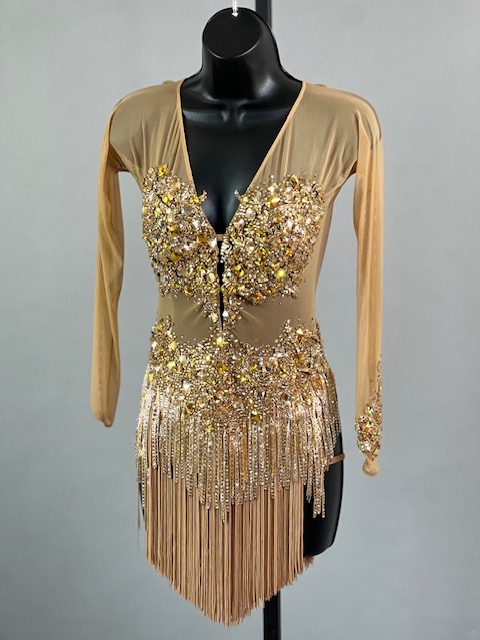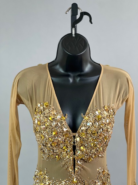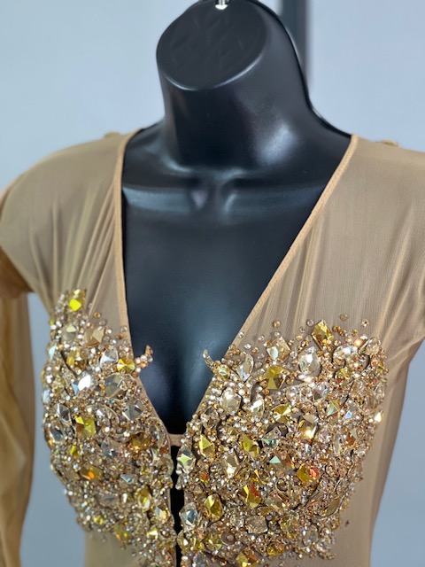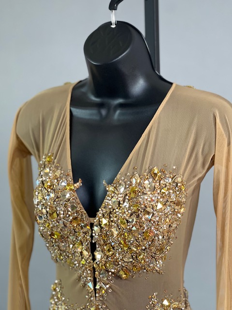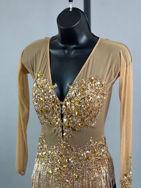 This is a beautiful gold Rhythm/Latin dress! It moves amazing on the dance floor. Trimmed with Austrian Crystals!