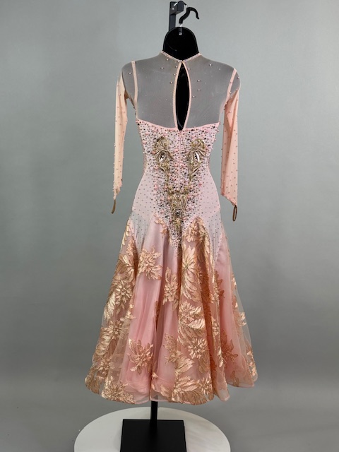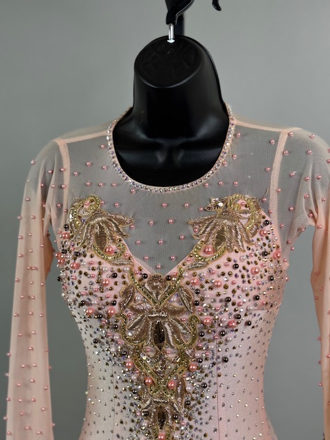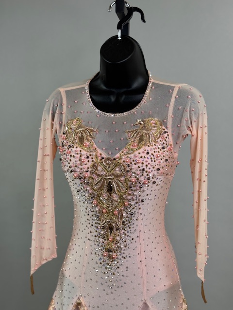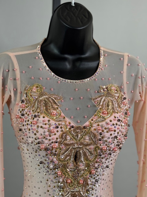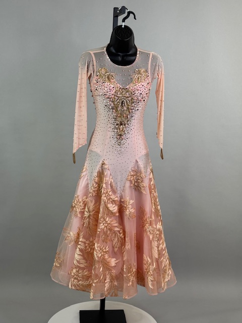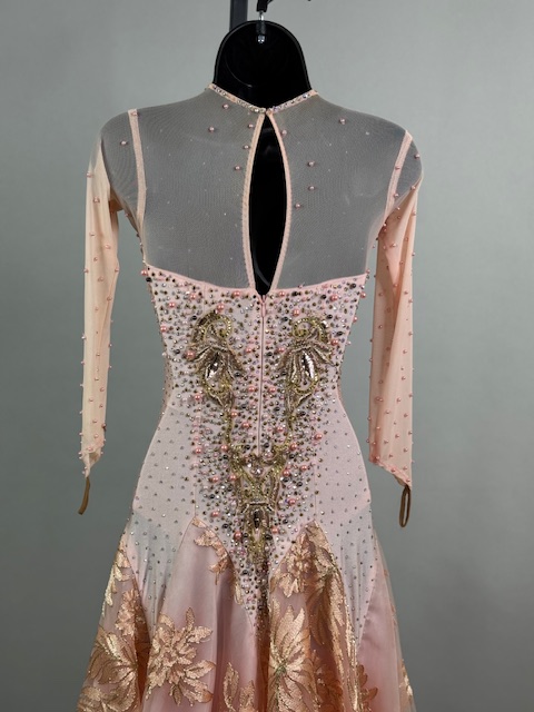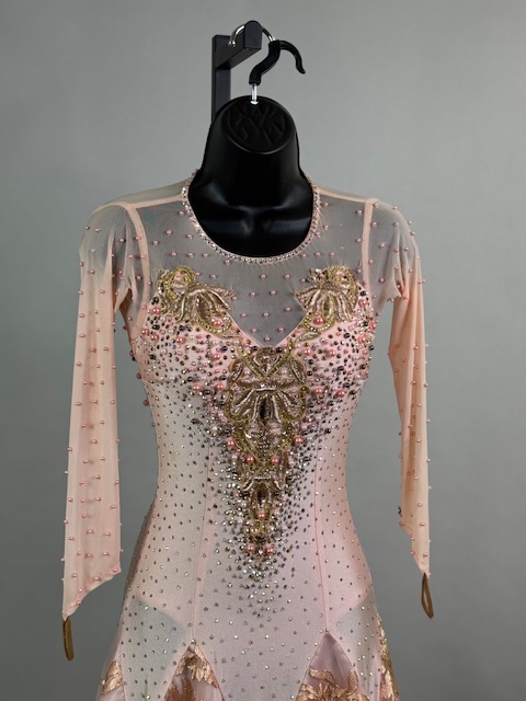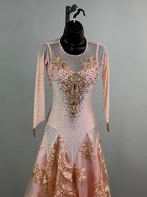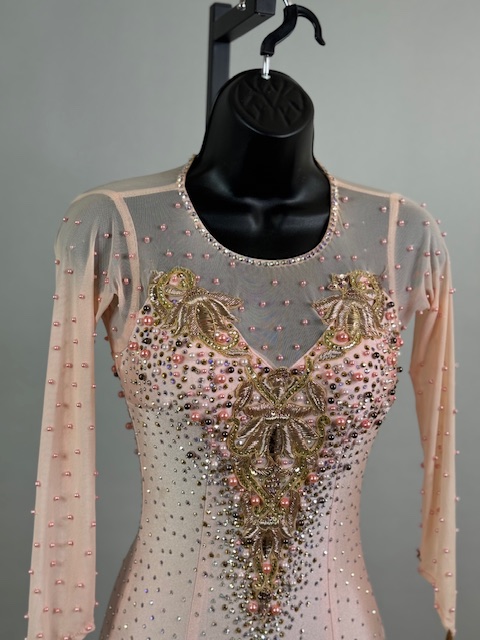 This is a beautiful peach smooth/standard dress designed by Cashay! It moves amazing on the dance floor. Trimmed with Austrian Crystals.