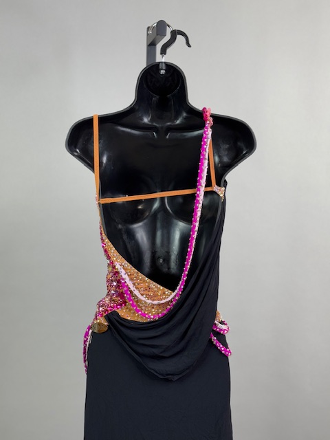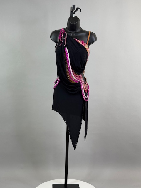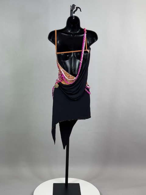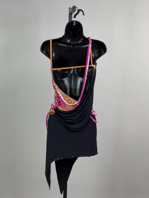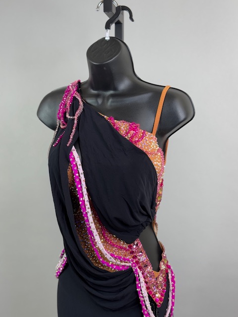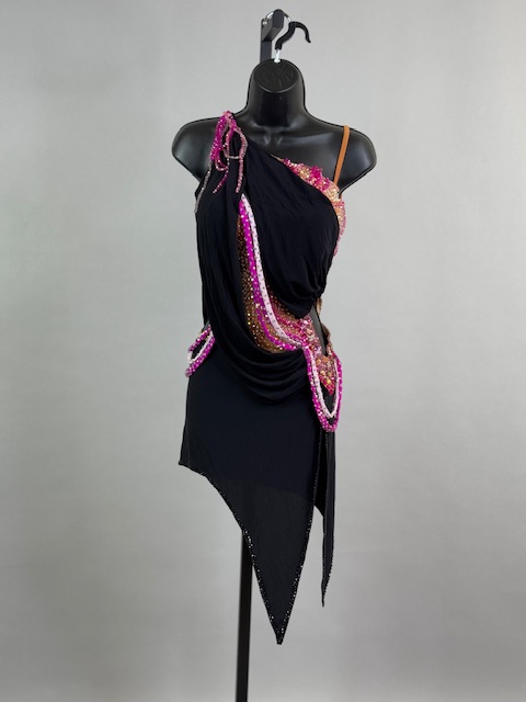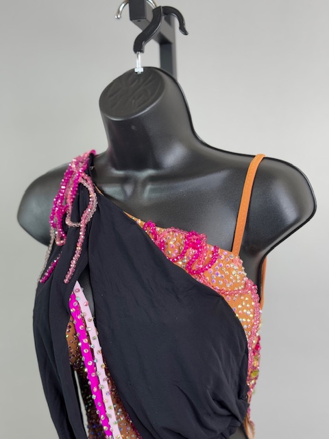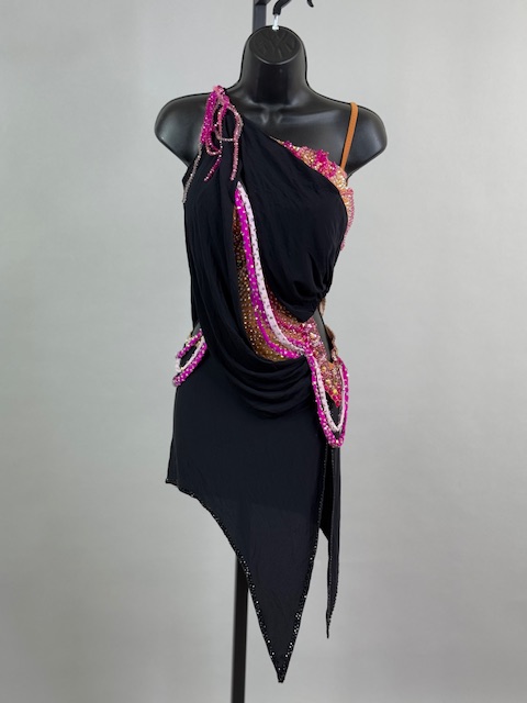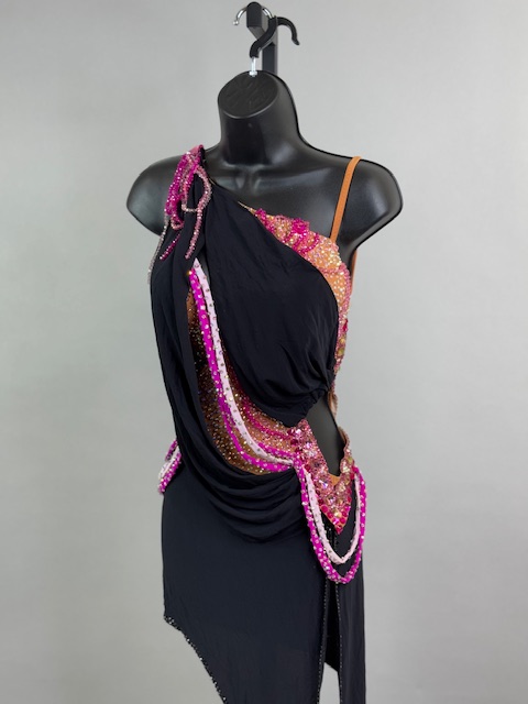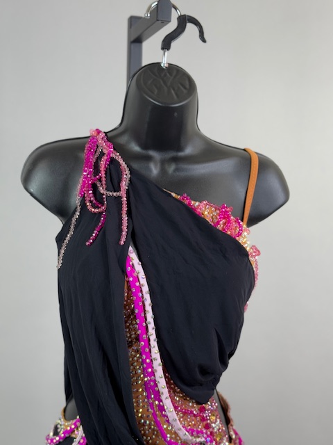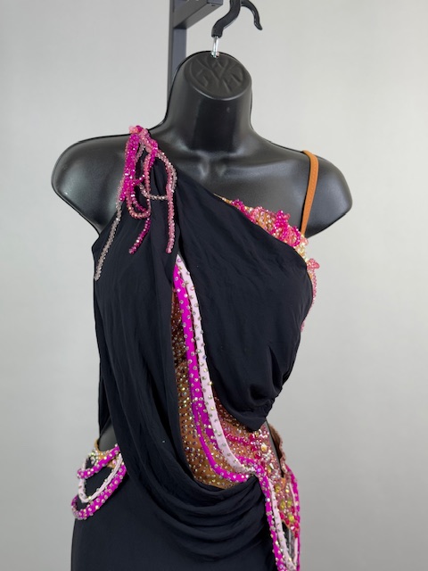 This is a beautiful black and pink beads Rhythm/Latin dress. Gorgeous style on the dance floor. Trimmed with Austrian Crystals.