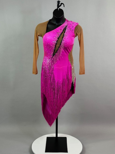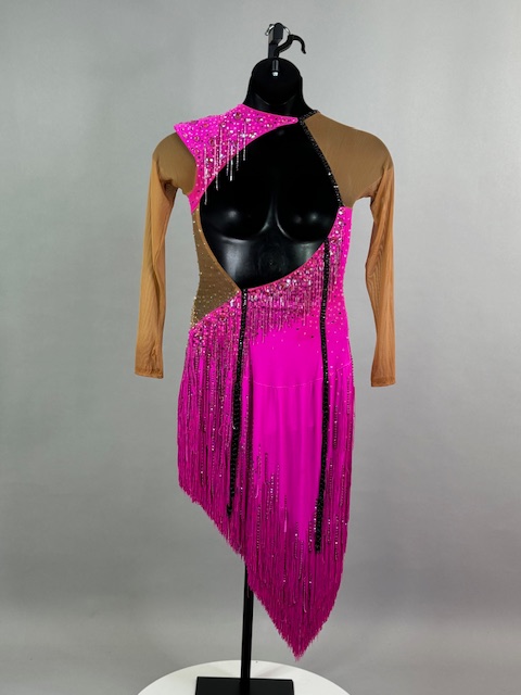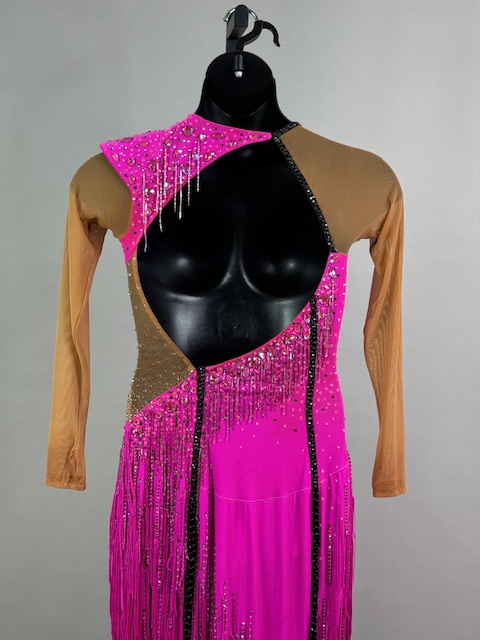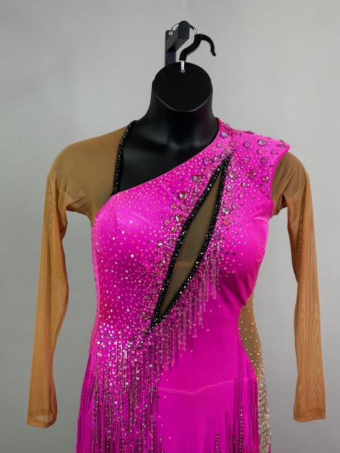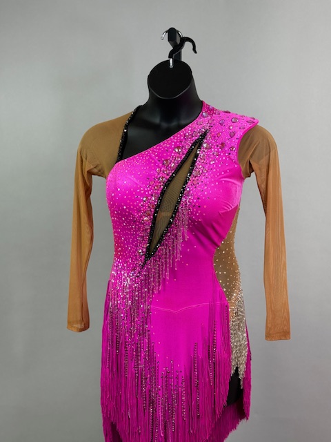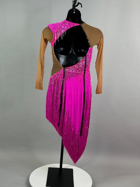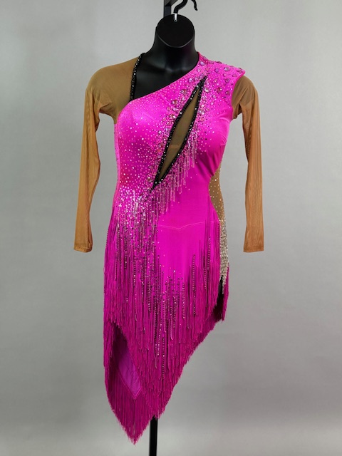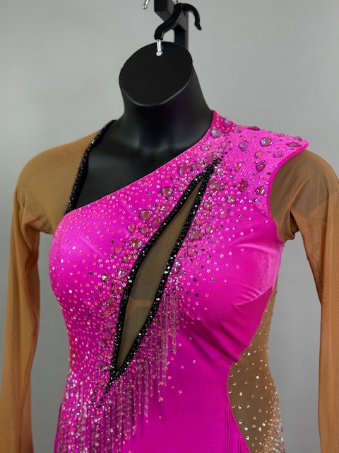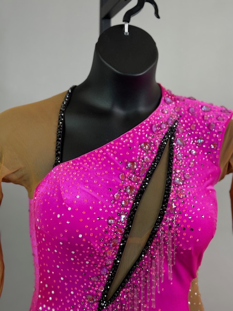 This is a beautiful bright pink Rhythm/Latin dress! It moves amazing on the dance floor, unique style. Trimmed with Austrian Crystals.