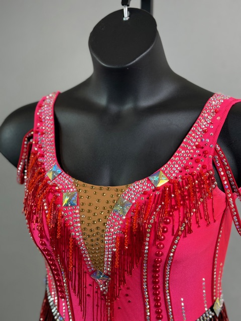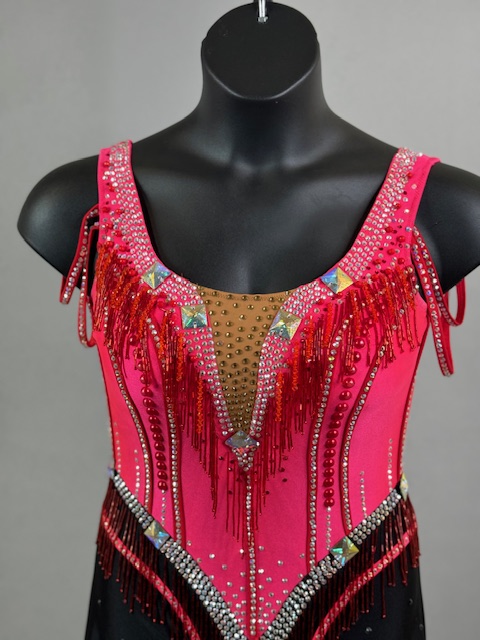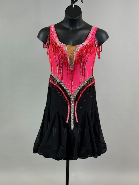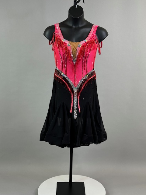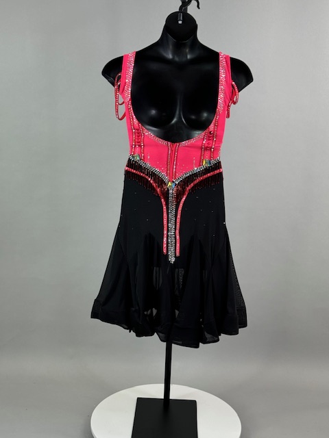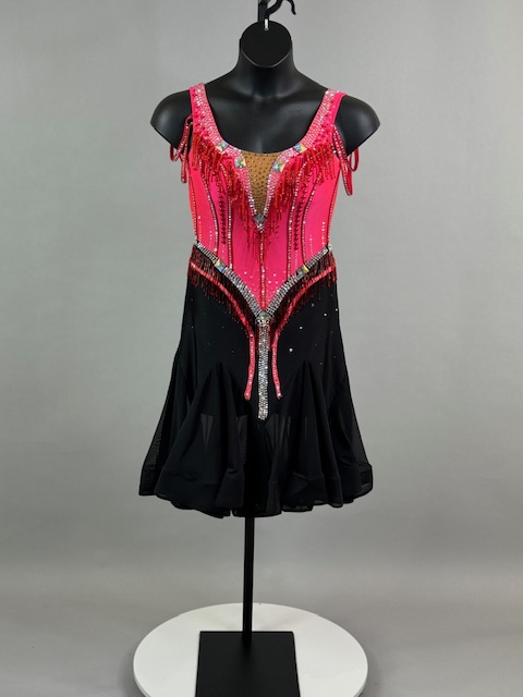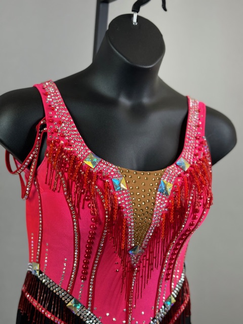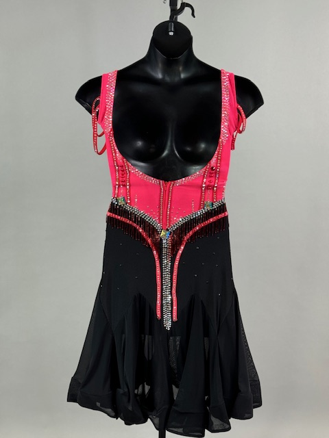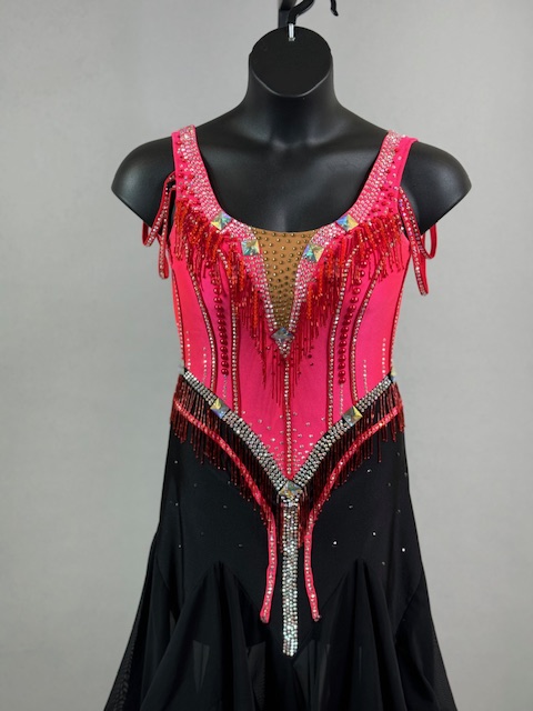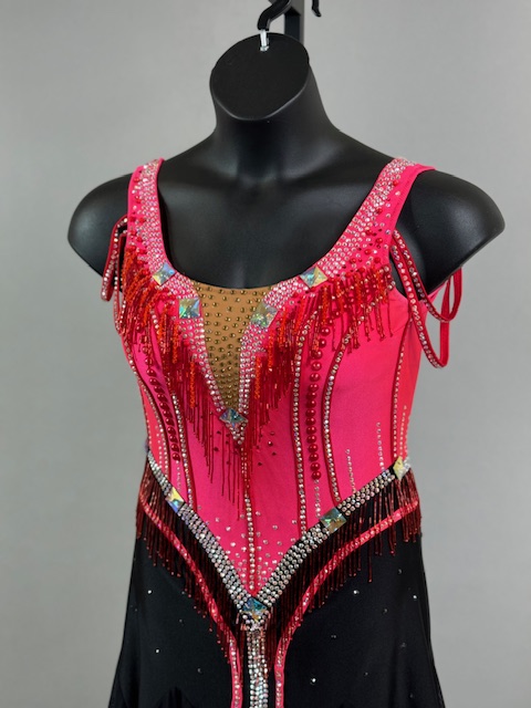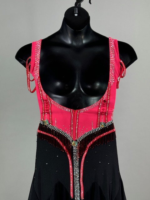 This is a beautiful black and salmon pink Rhythm/Latin! It moves amazing on the dance floor. Trimmed with Korean and Preciosa crystals.