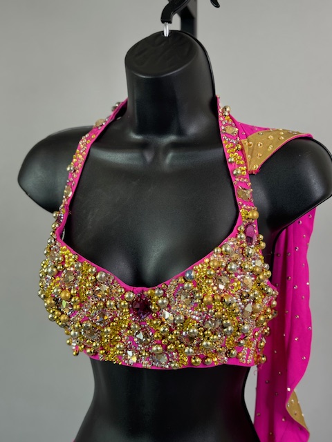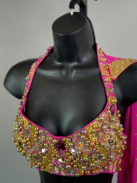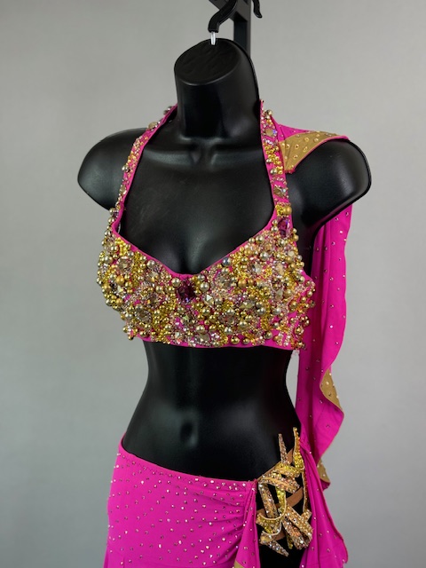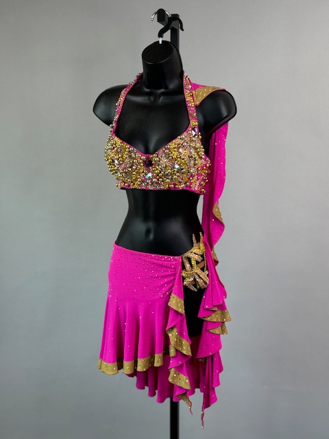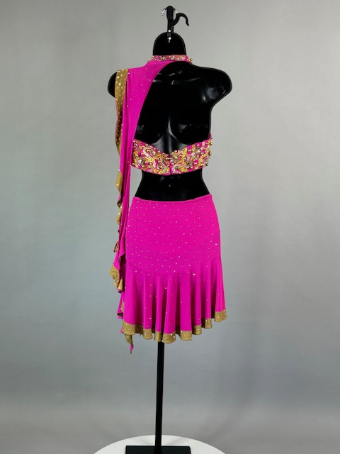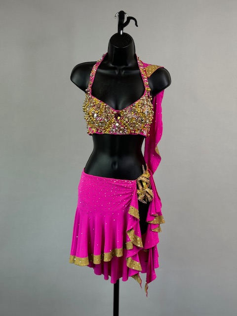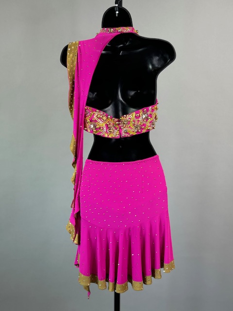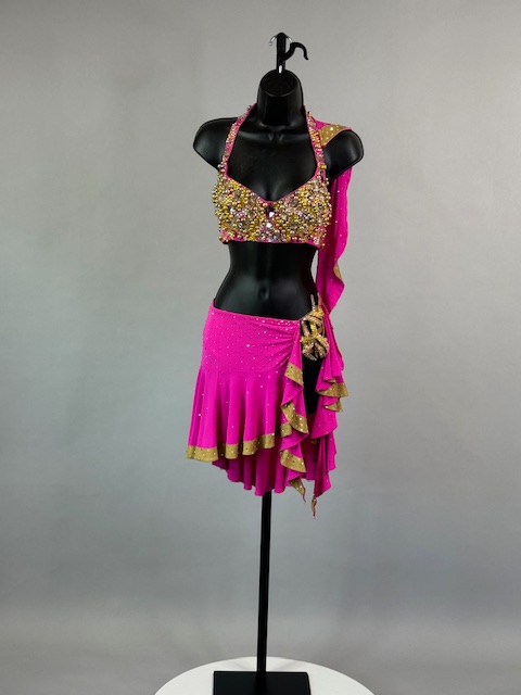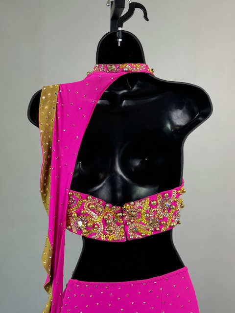 This is a beautiful two piece bright pink and gold Rhythm/Latin dress! It’s a great style for solo, competition or showcase. Trimmed with Preciosa Crystals.