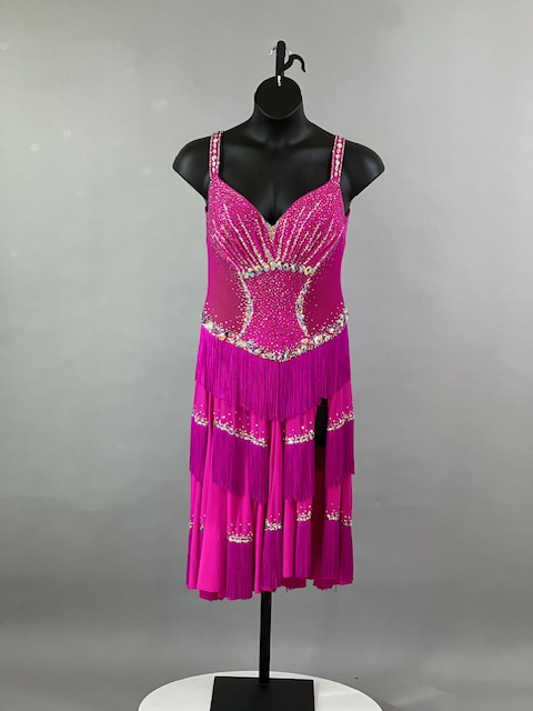 This bright pink Rhythm/ Latin Dress is an absolutely beauty! Very unique dress, skirt creates a great effect on the dance floor. Dress designed by Artistry in Motion by Julia Gorchakova. Trimmed with Austrian Crystals.