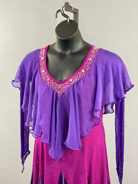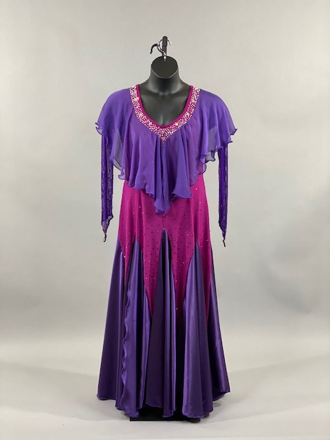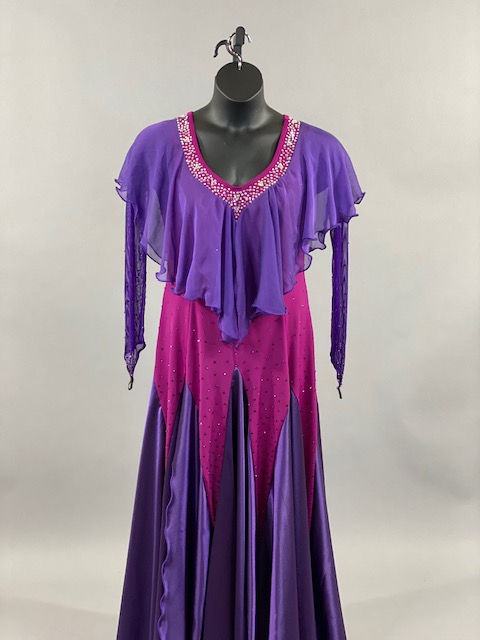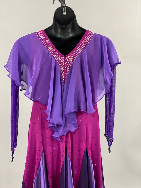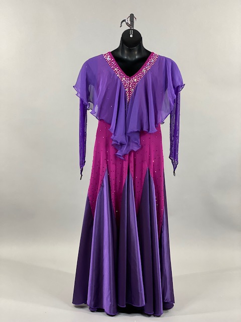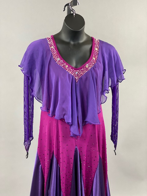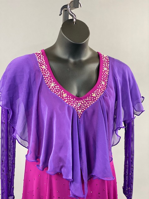 This purple and bright pink smooth dress is a true beauty! Skirt creates a great effect on the dance floor. This dress is stoned with Austrian Crystals.