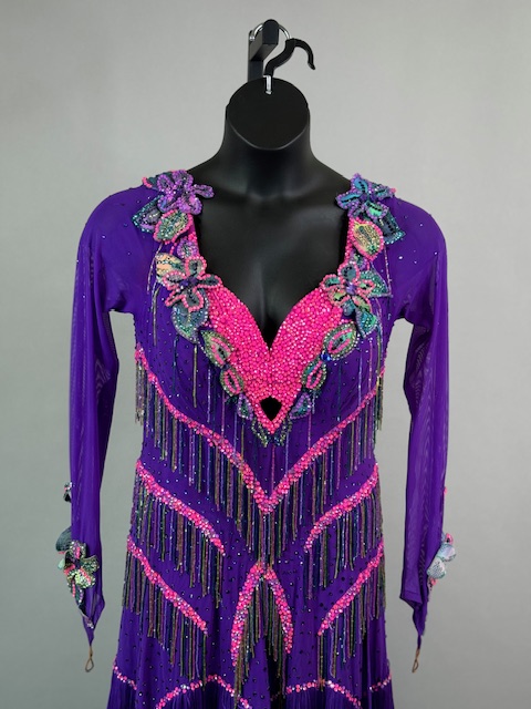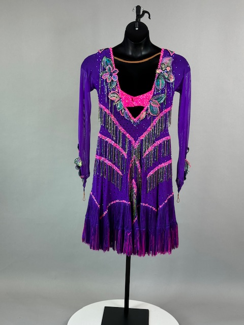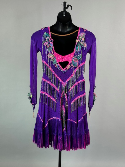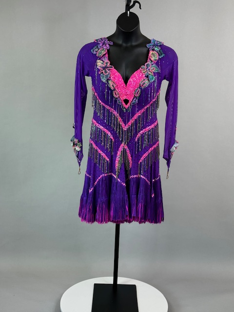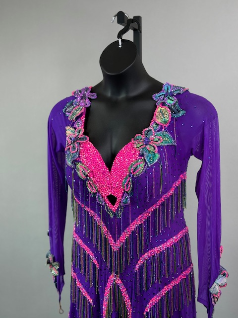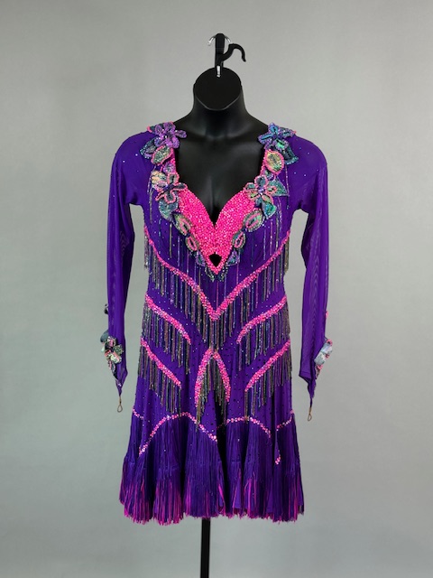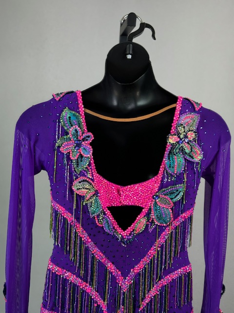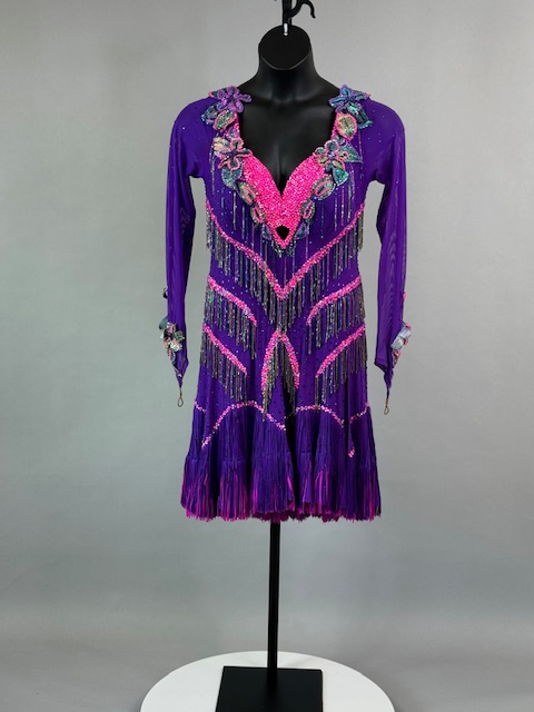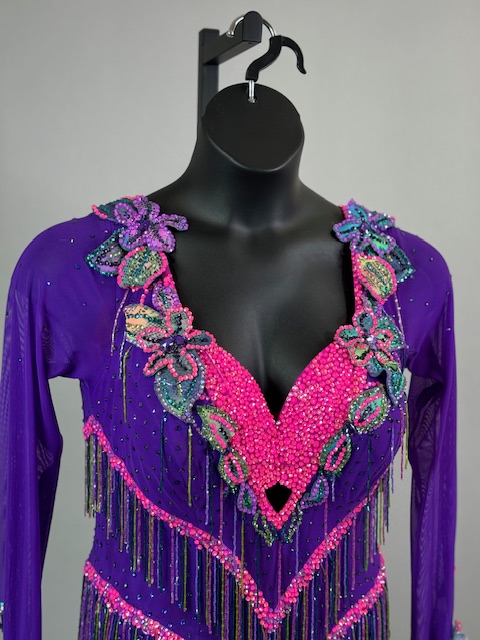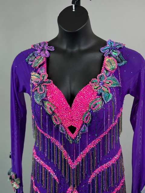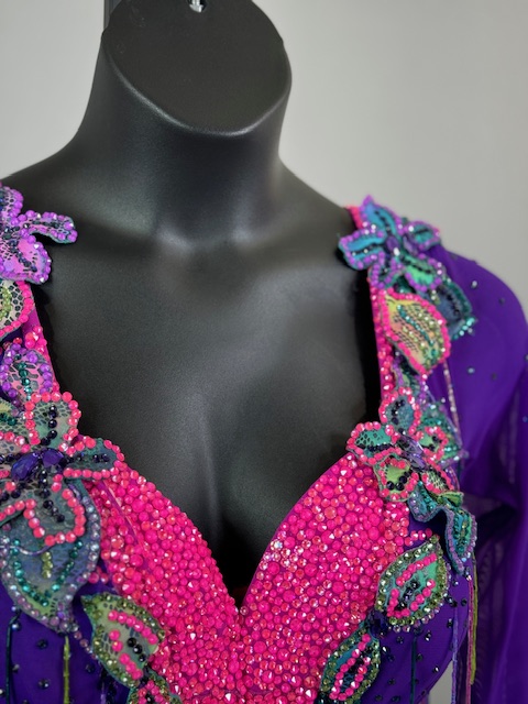 This is a stunning bright colorful purple Rhythm/Latin dress designed by Dore Designs! It’s a unique style and moves amazing on a dance floor. Trimmed with Austrian Crystals.