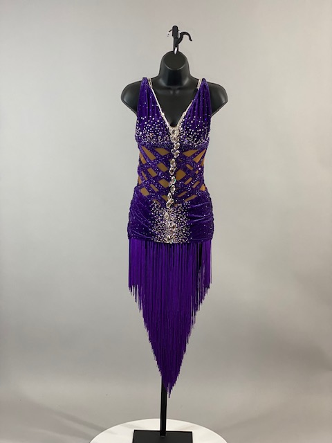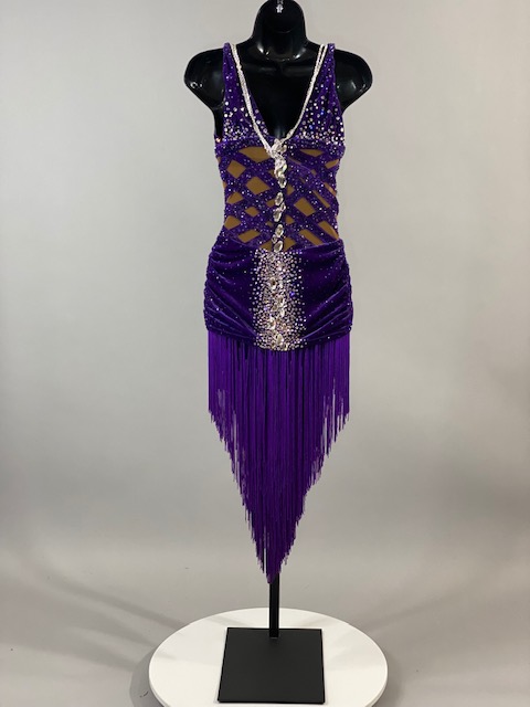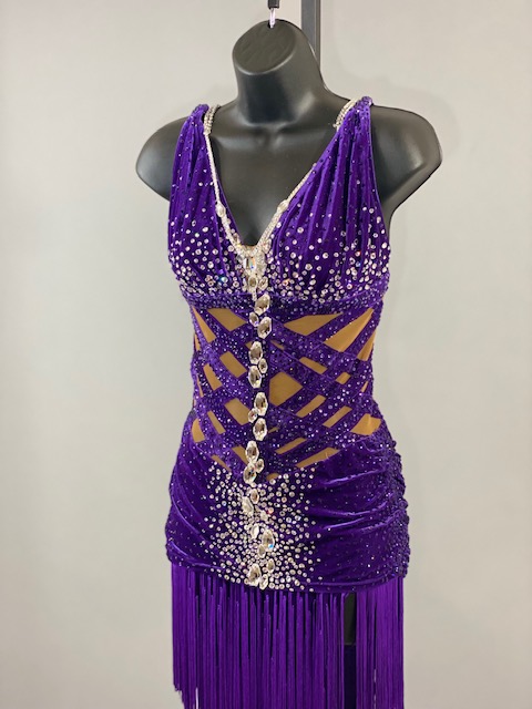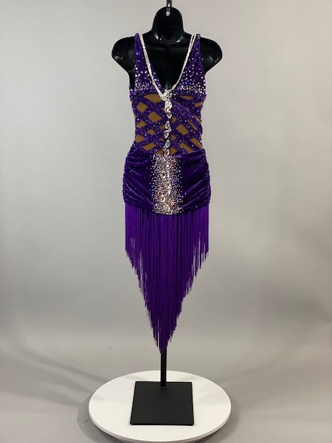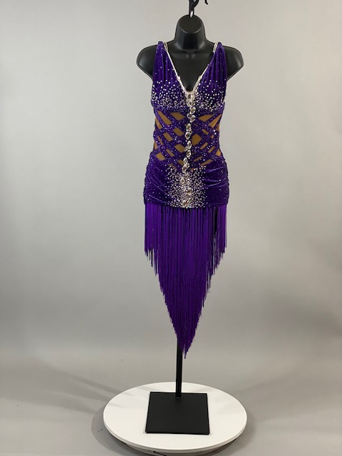 This is a gorgeous purple Rhythm/Latin Dress! It’s an absolute stunning dress on the dance floor. Very unique style! Trimmed with Austrian crystals.