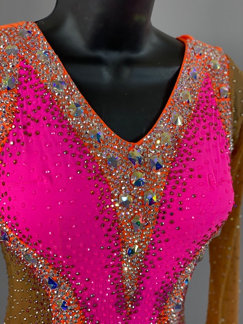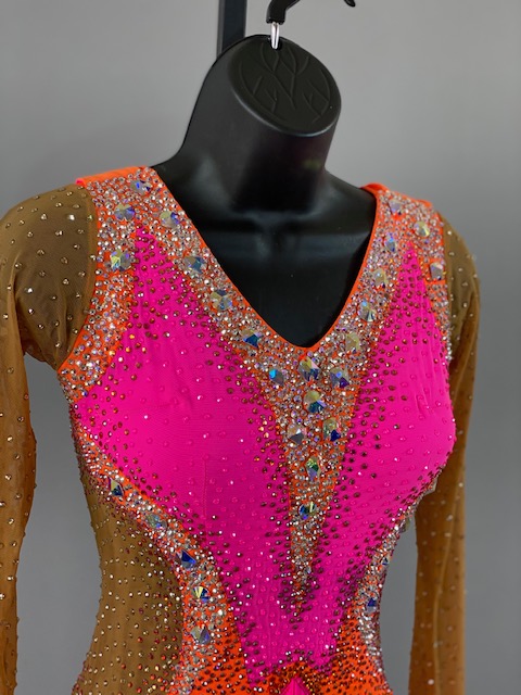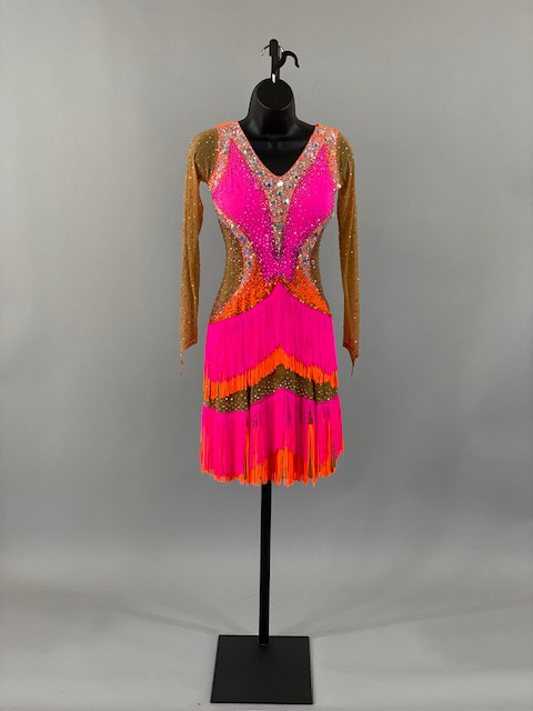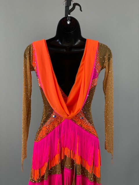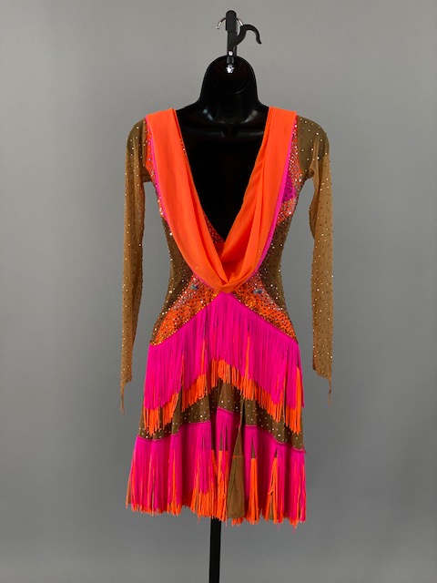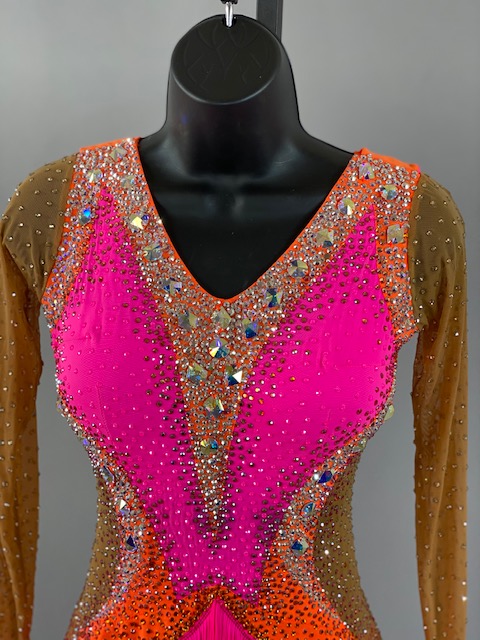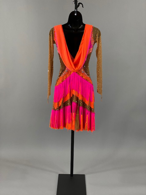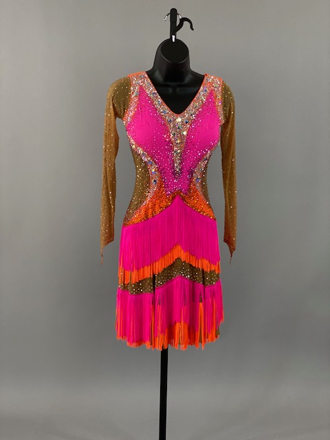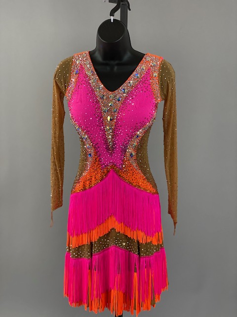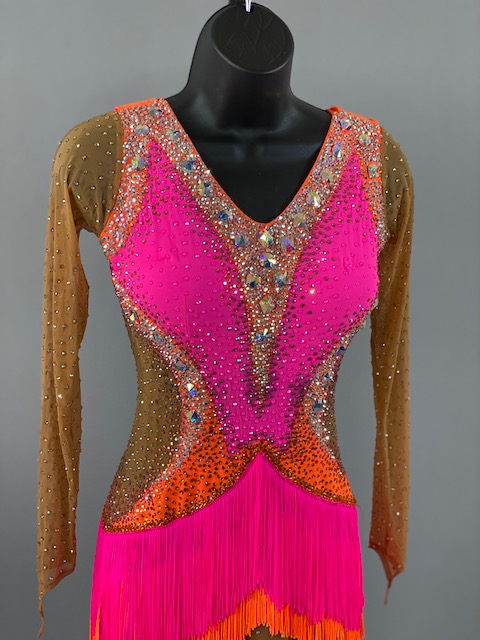 This is a stunning Rhythm/Latin dress. Fringes moves amazing on the dance floor. This would be a great dress for your next showcase event or competition. Trimmed with Austrian crystals.