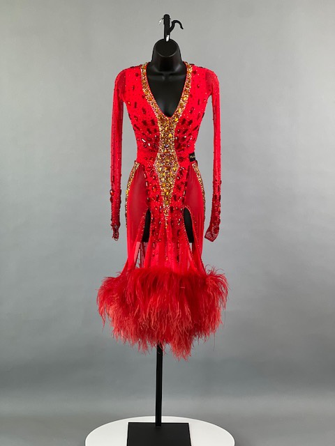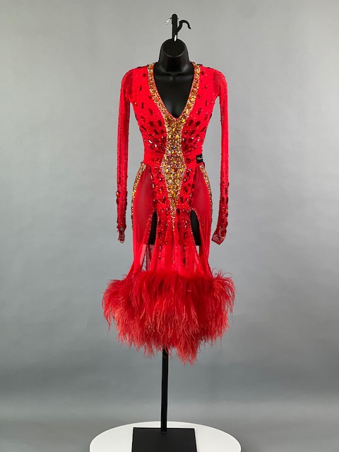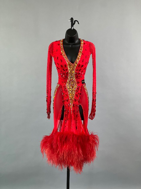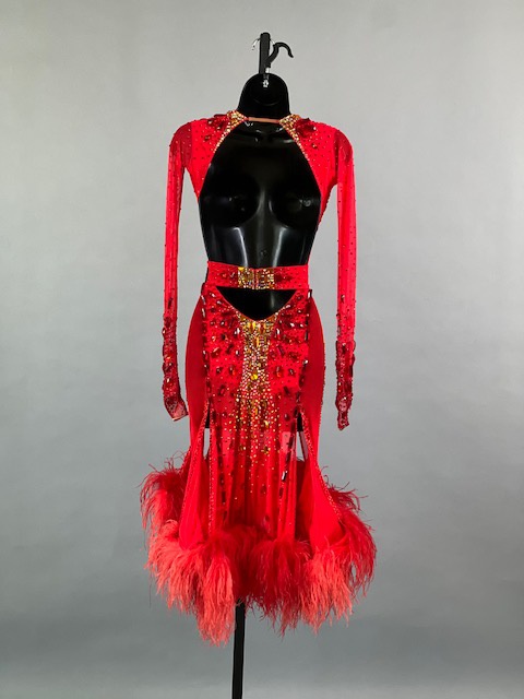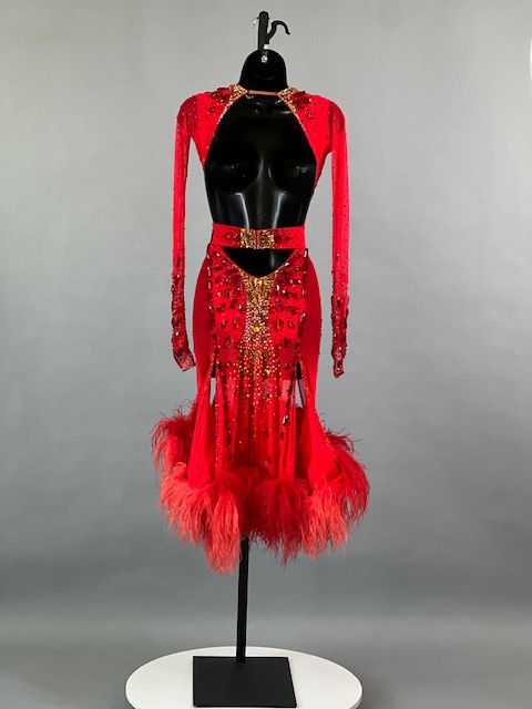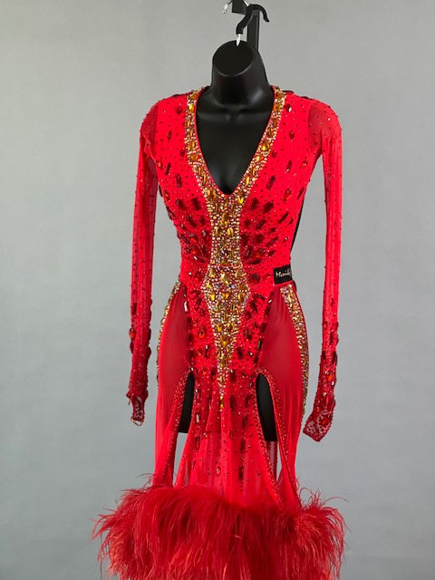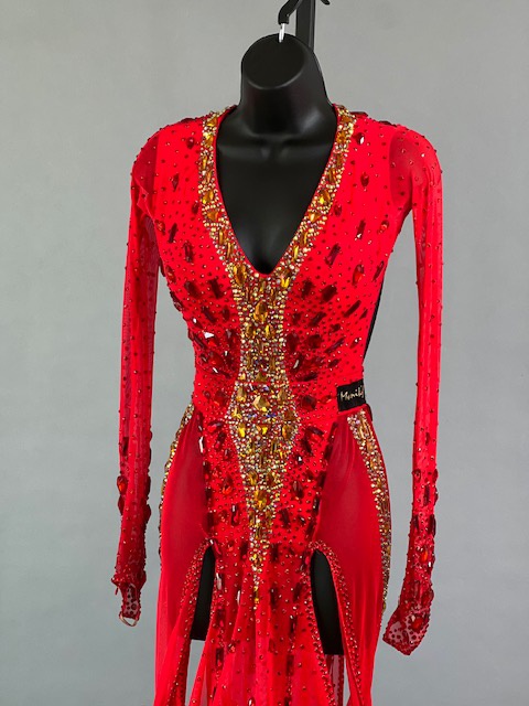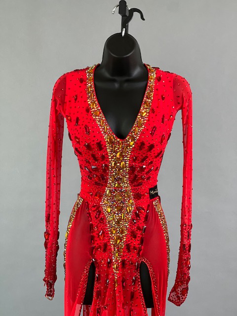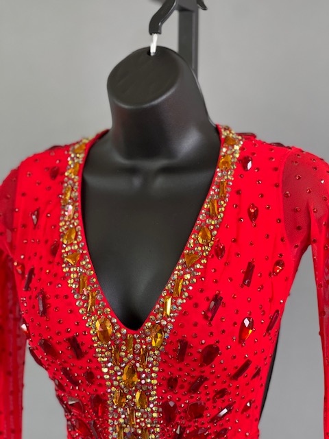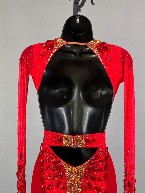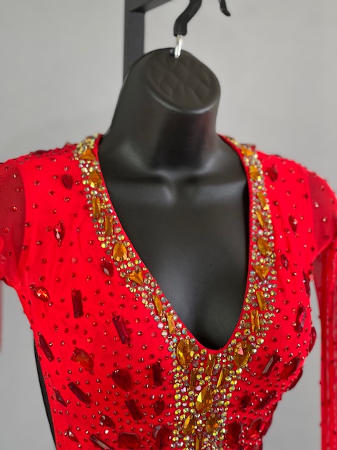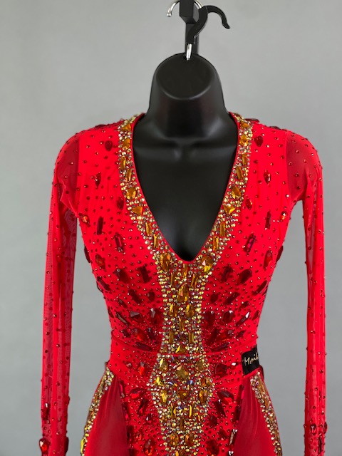 This a beautiful bright coral red Rhythm/Latin dress designed by Melnikoff’s! It moves amazing, a true beauty! Trimmed with Austrian crystals.