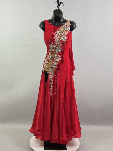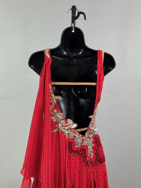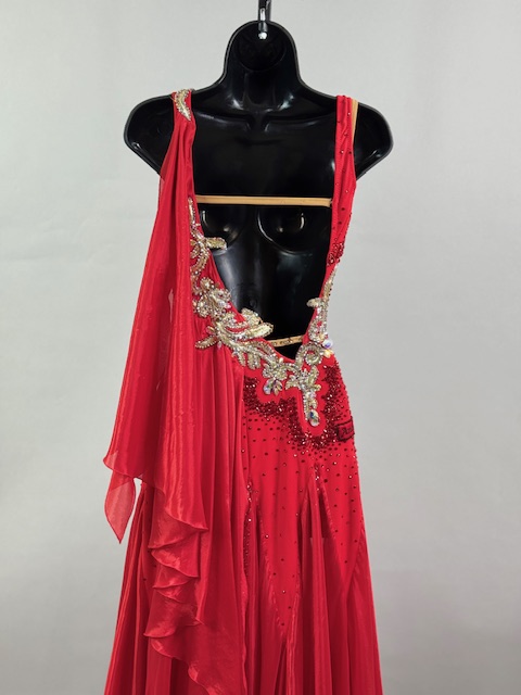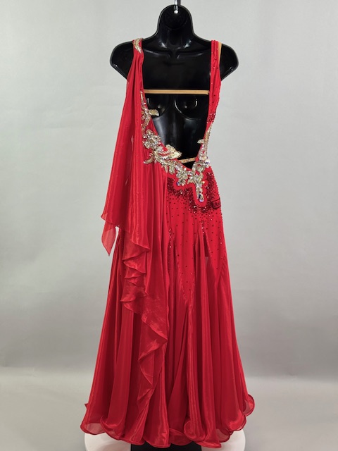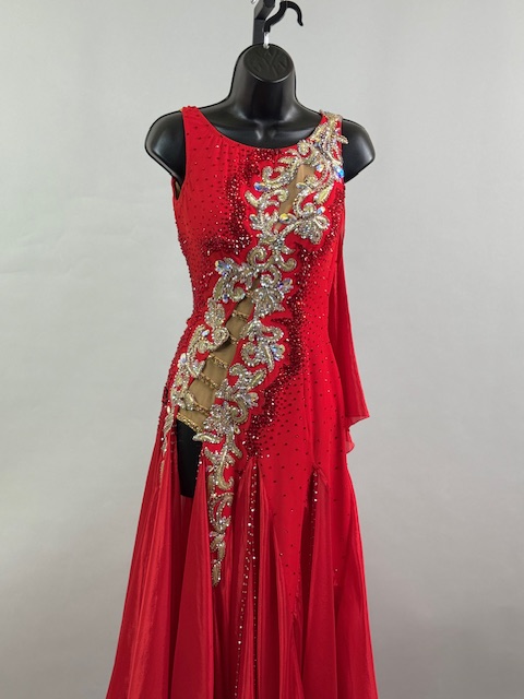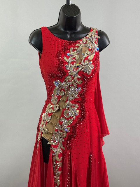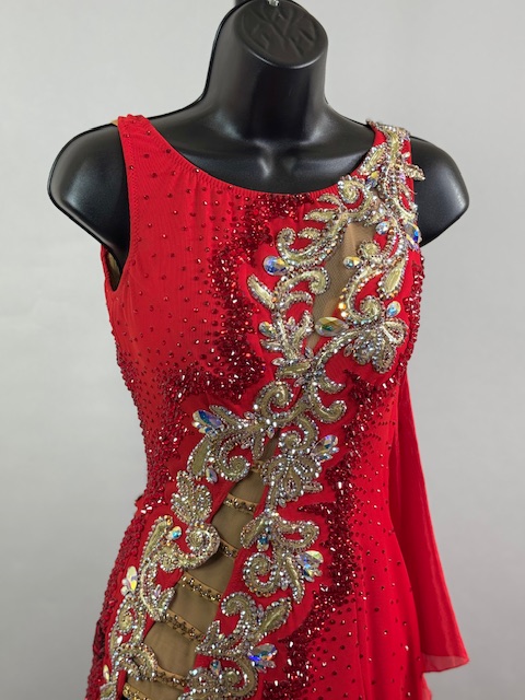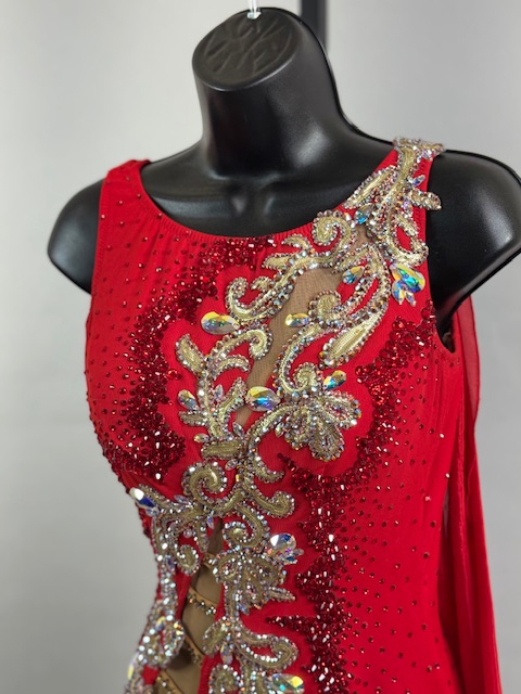 This is a stunning red and gold smooth dress designed by Anabell’s Designs! Skirt moves amazing on the dance floor, a true beauty! It’s Trimmed with Austrian crystals.