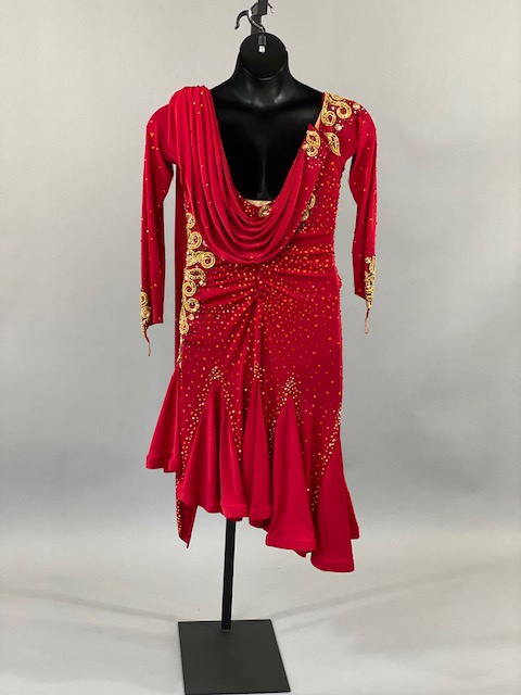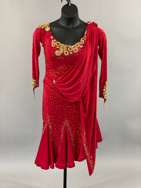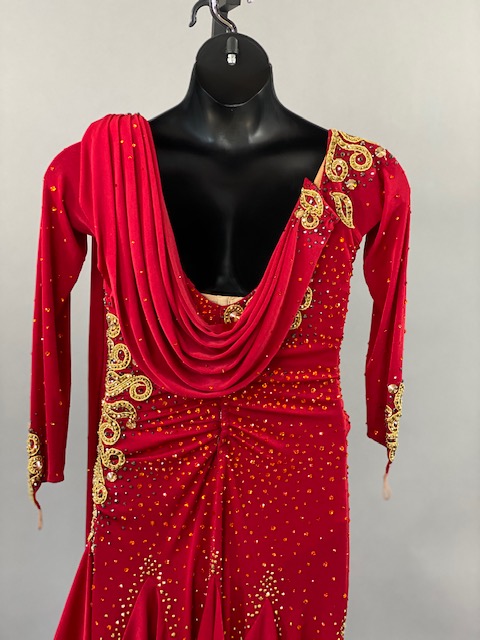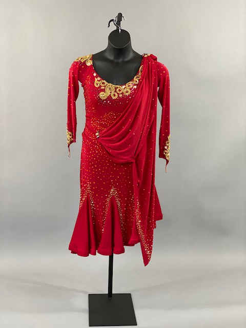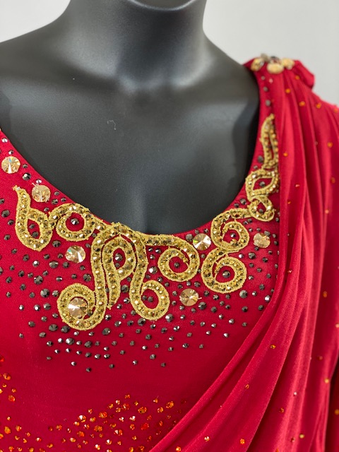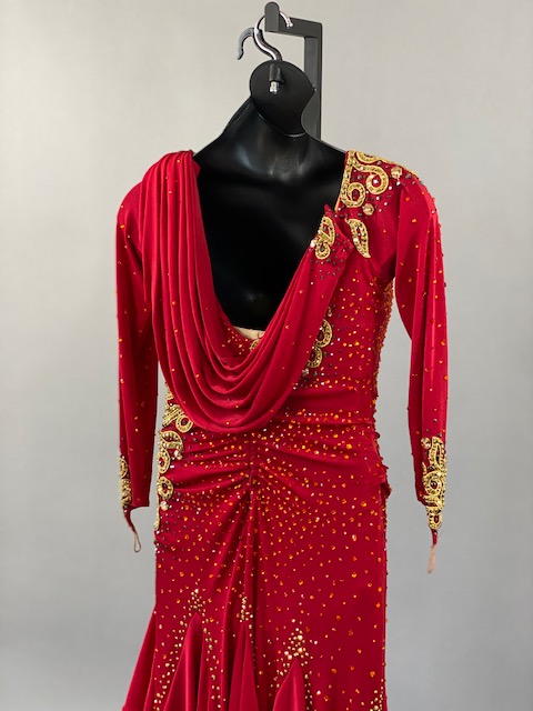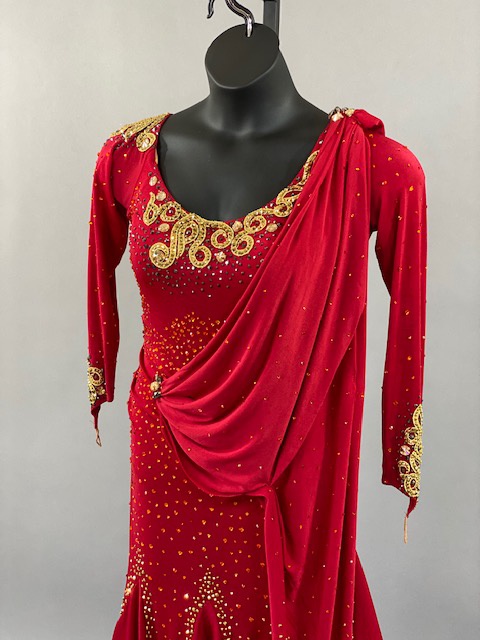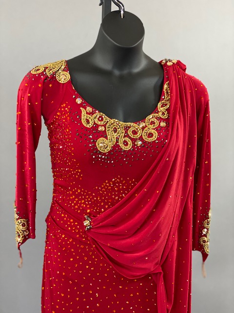 This red and gold rhythm/Latin dress is an absolutely beauty! Beautiful lines, skirt creates a great effect on the dance floor. Dress designed by Artistry in Motion by Julia Gorchakova. This dress is stoned with Austrian Crystals.