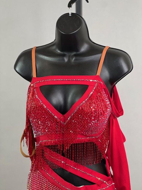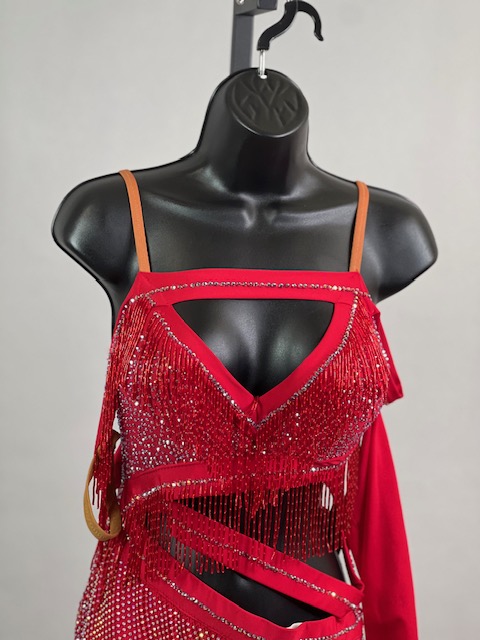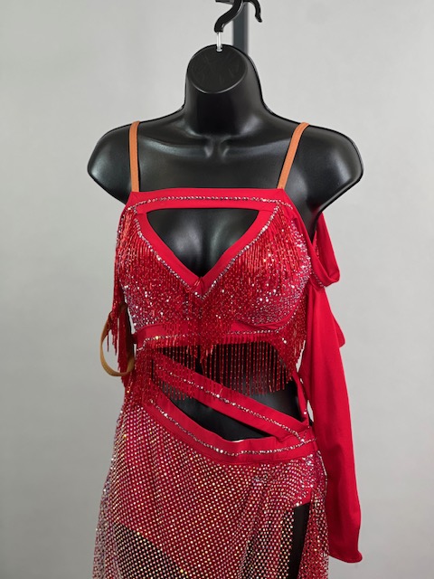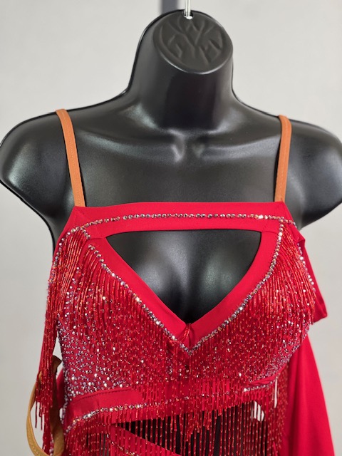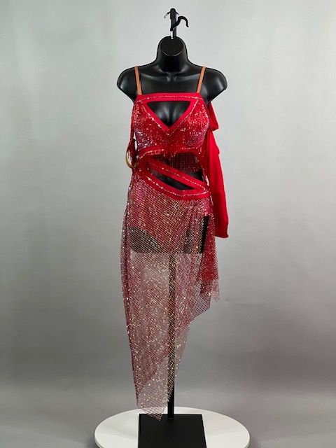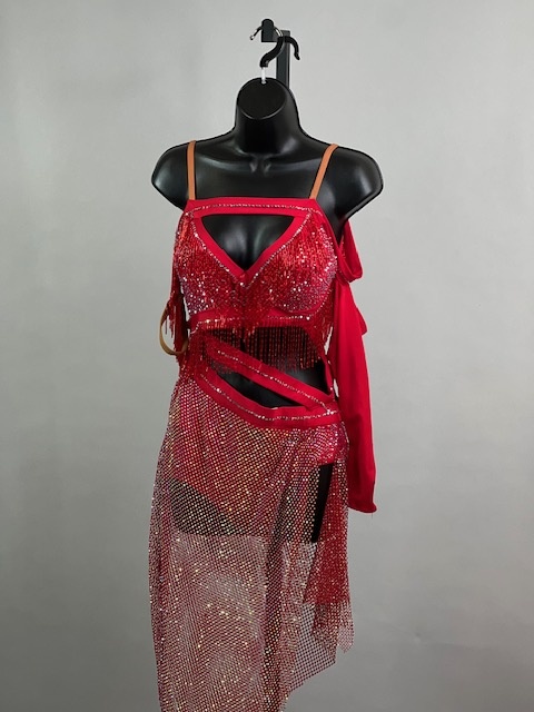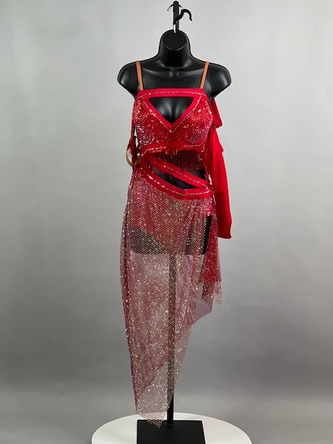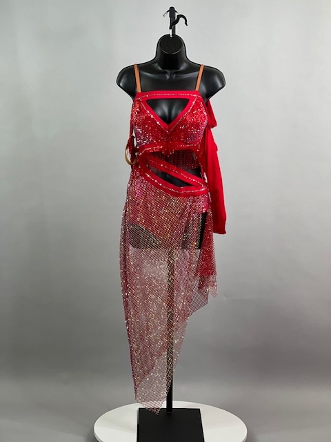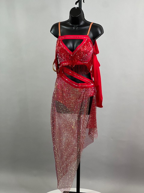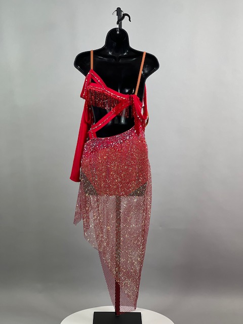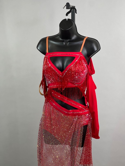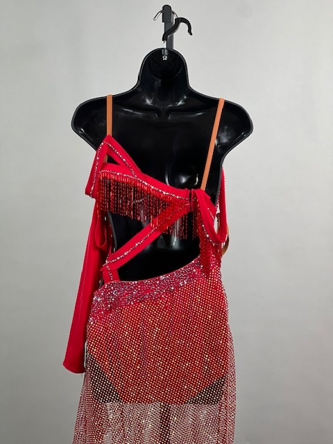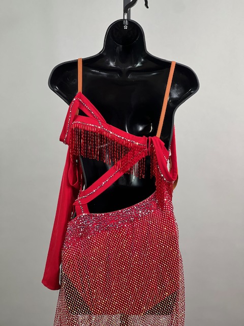 This is a stunning bright red mesh Rhythm/Latin dress! Style shows amazing on the dance floor, a unique style! Trimmed with Austrian crystals.