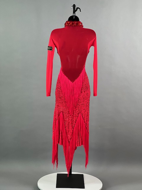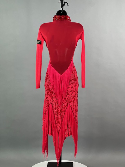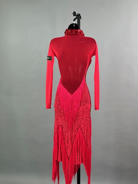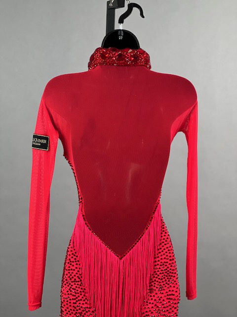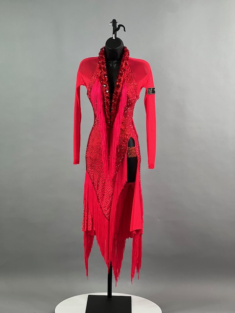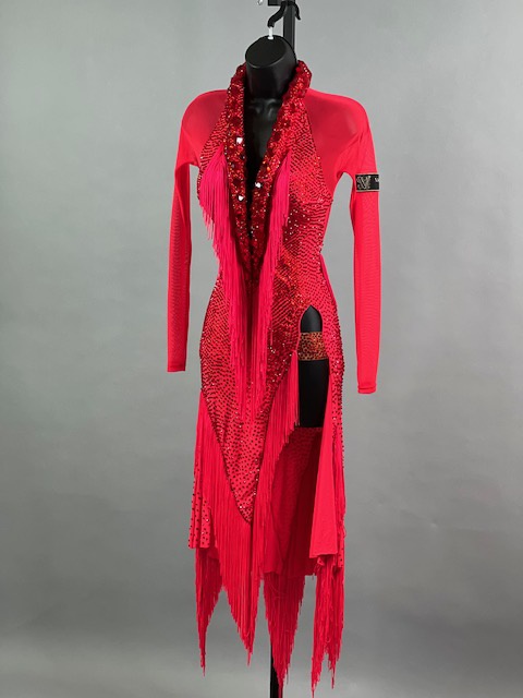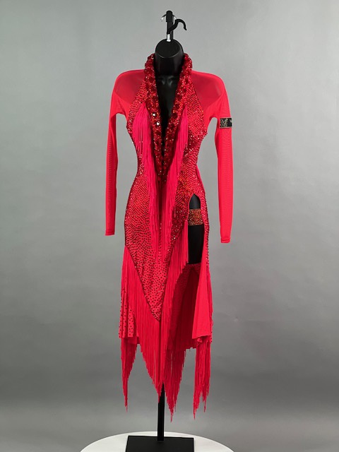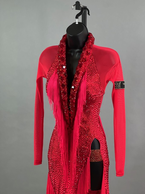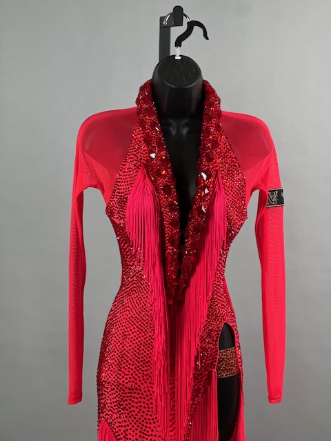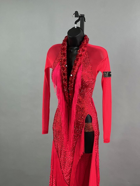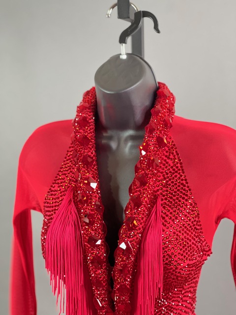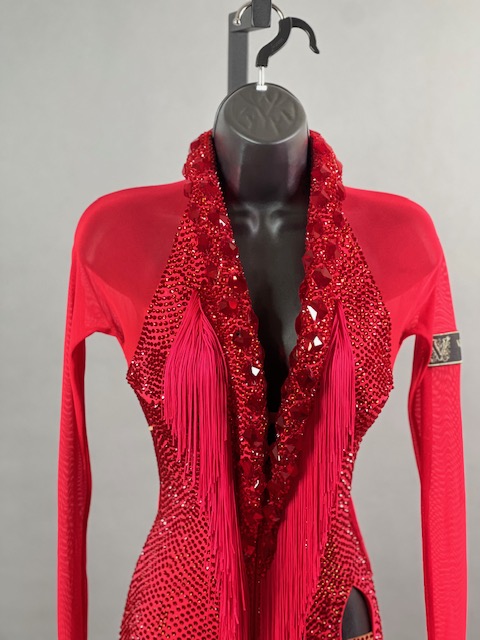 This is a beautiful bright red Rhythm/Latin Dress designed by Vakhner Designs! It’s an absolute beauty, very unique style! Skirt moves amazing on the dance floor. Trimmed with Luxury European Crystals.