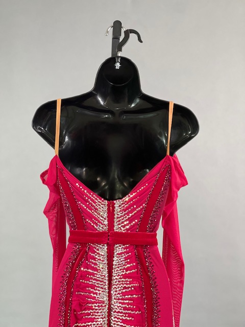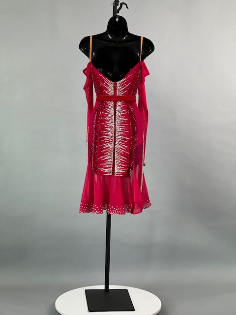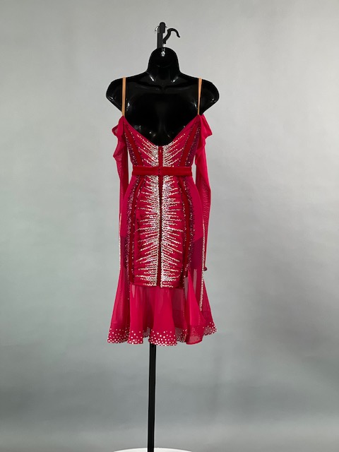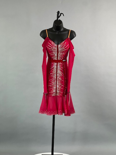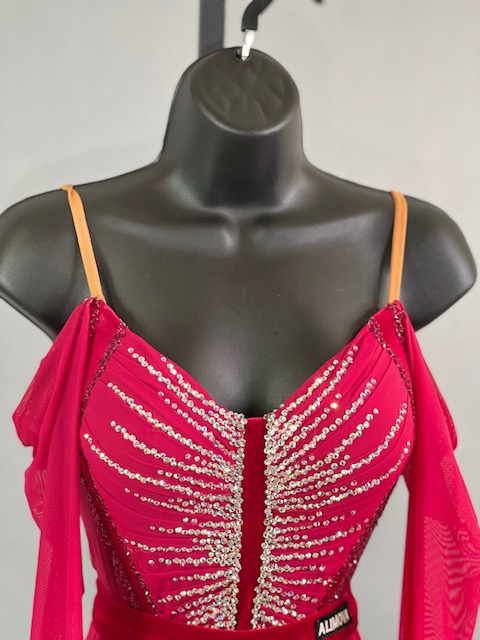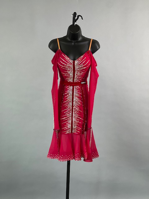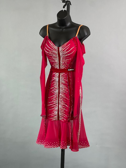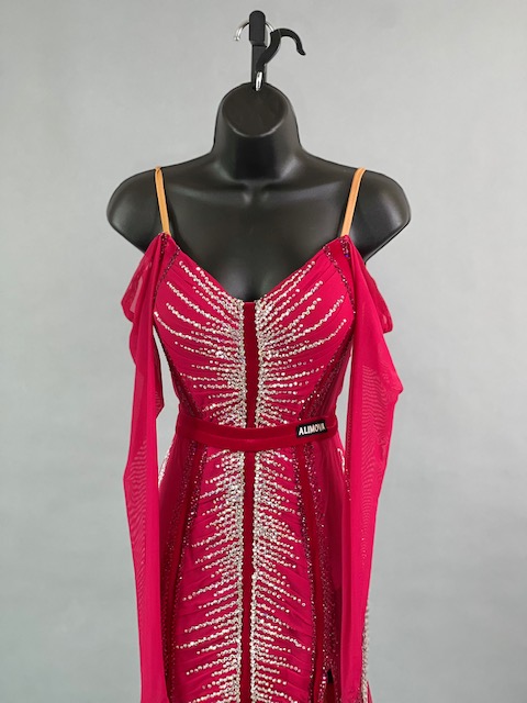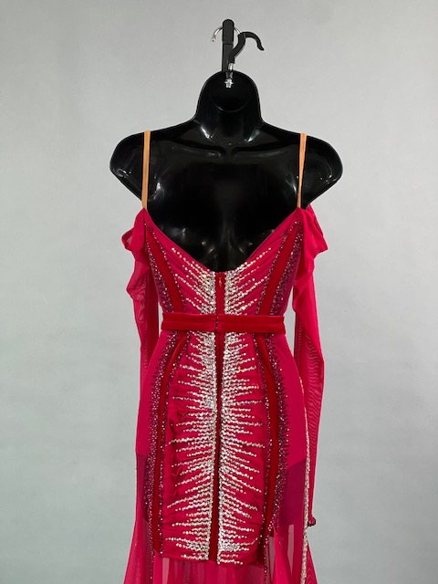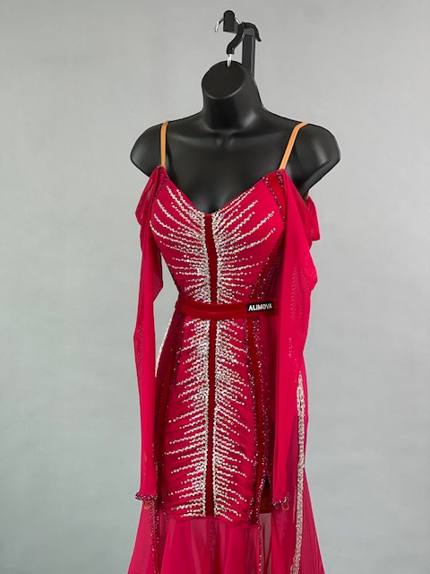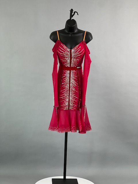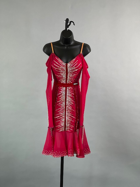 This a beautiful red wine Rhythm/Latin dress! It moves amazing, a true beauty! Trimmed with Austrian crystals.