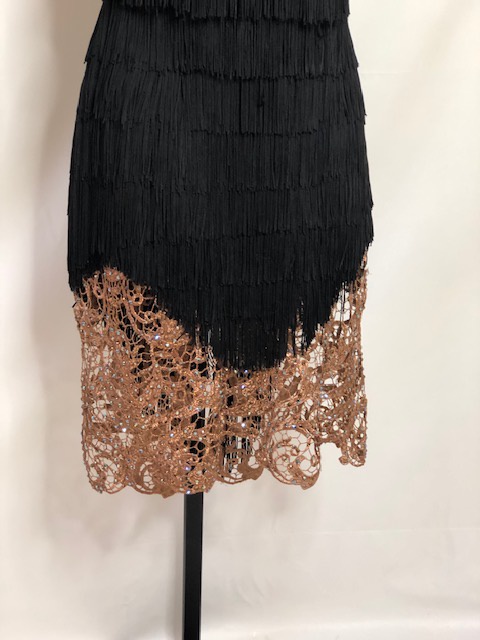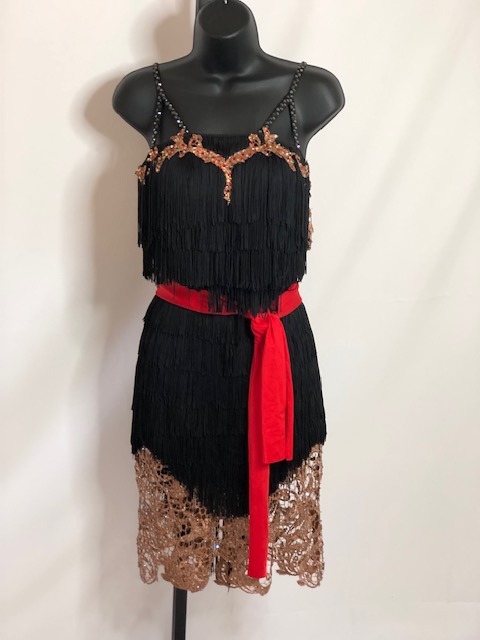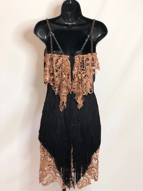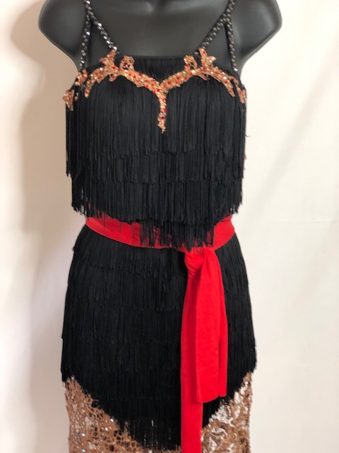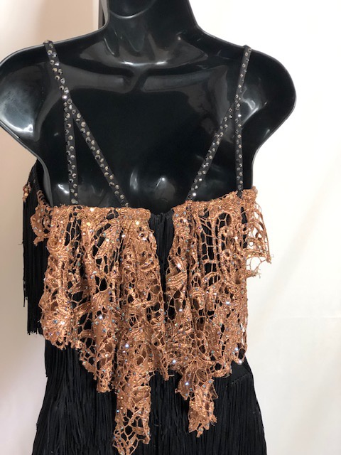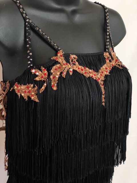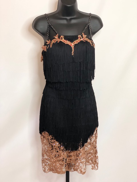This black rhythm/latin dress shows amazing on dance floor. Size S/M can fit a size 4-6 USA.