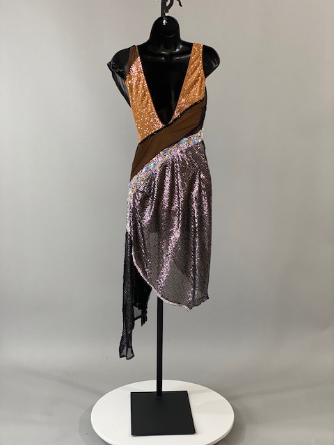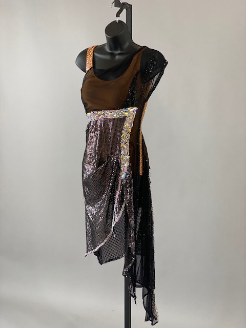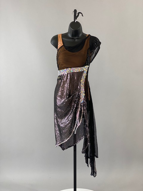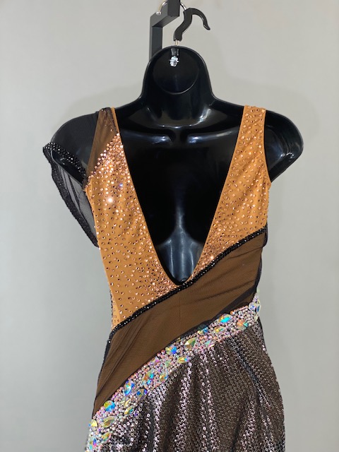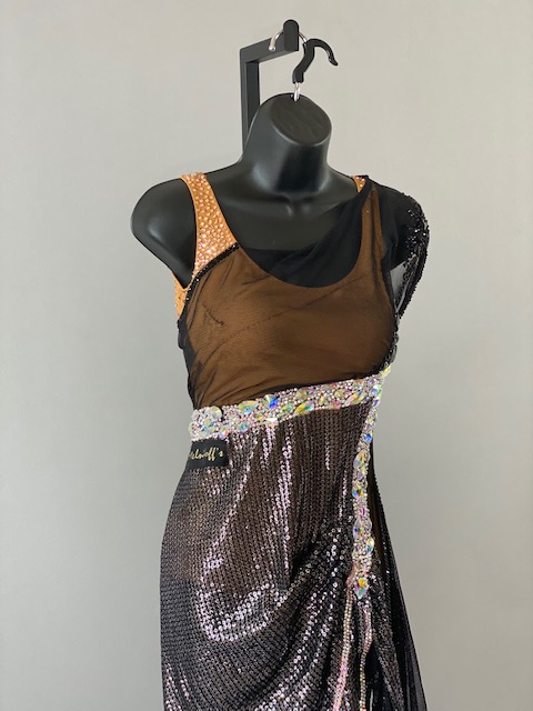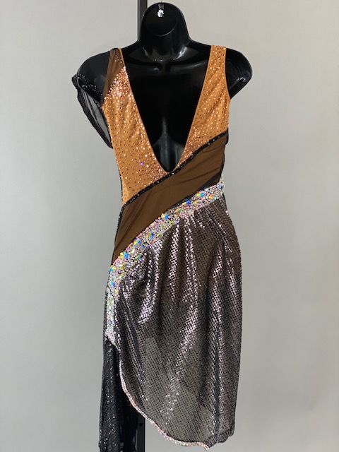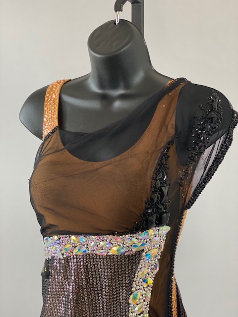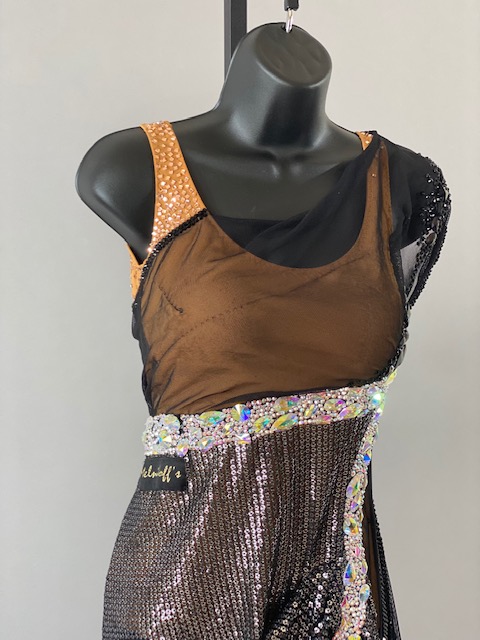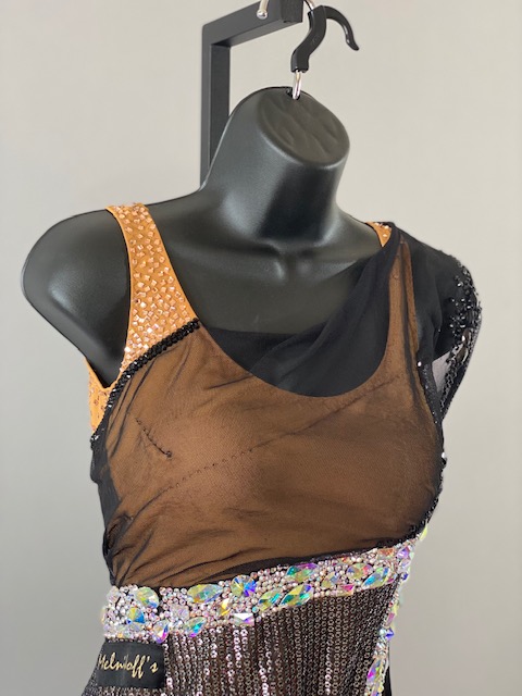 This is a stunning black/beige Rhythm/Latin Dress, very unique style. It moves amazing on the dance floor, will definitively stand out. Trimmed with beautiful Austrian crystals. Designed by Melnikoff’s.