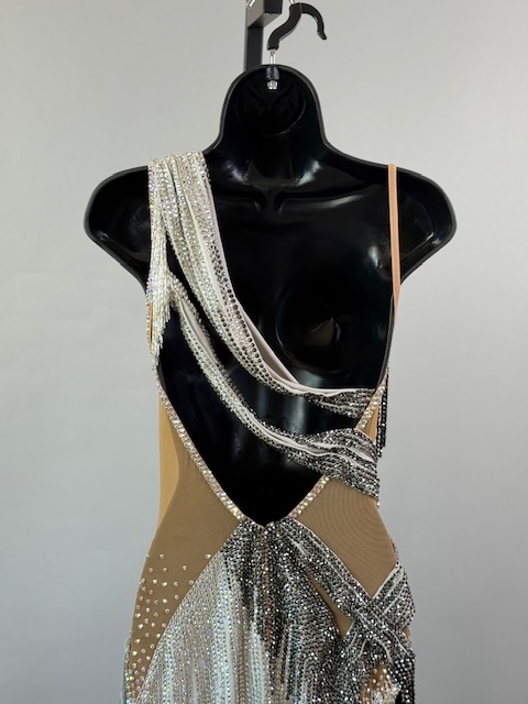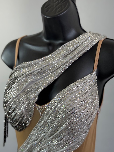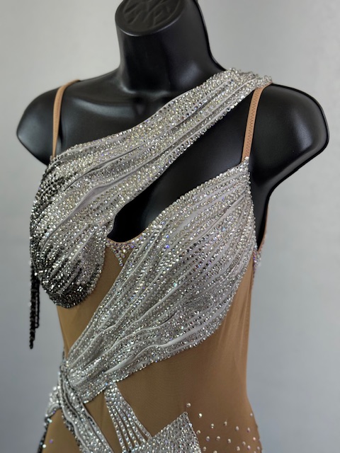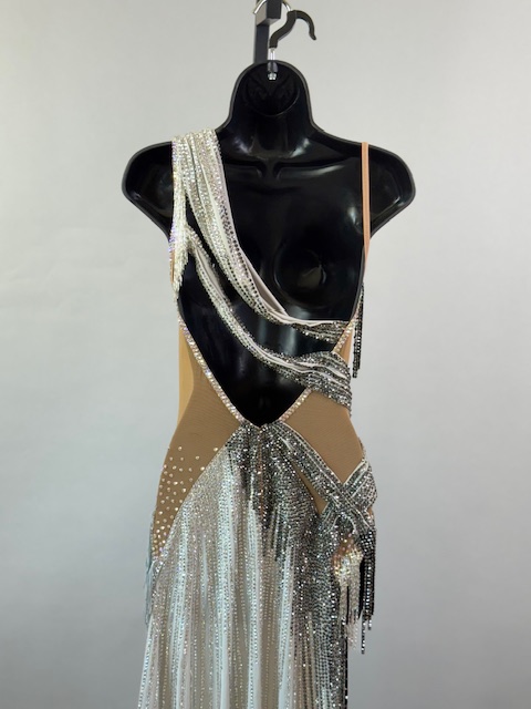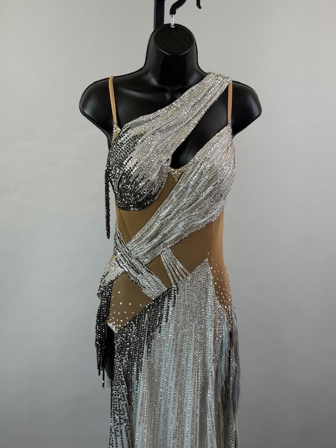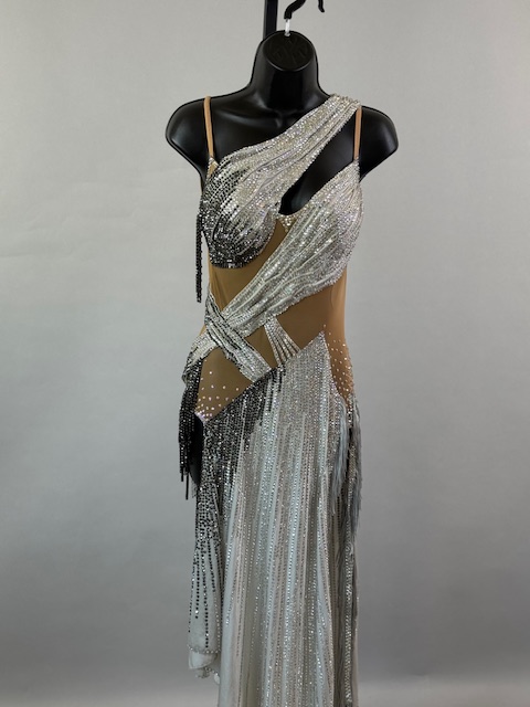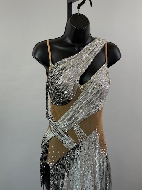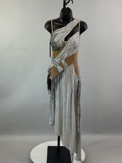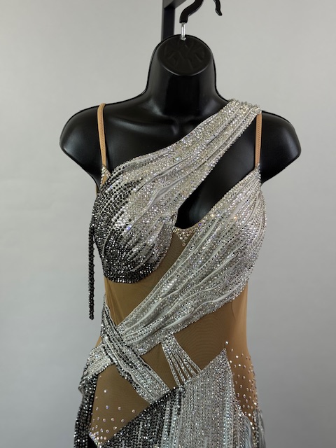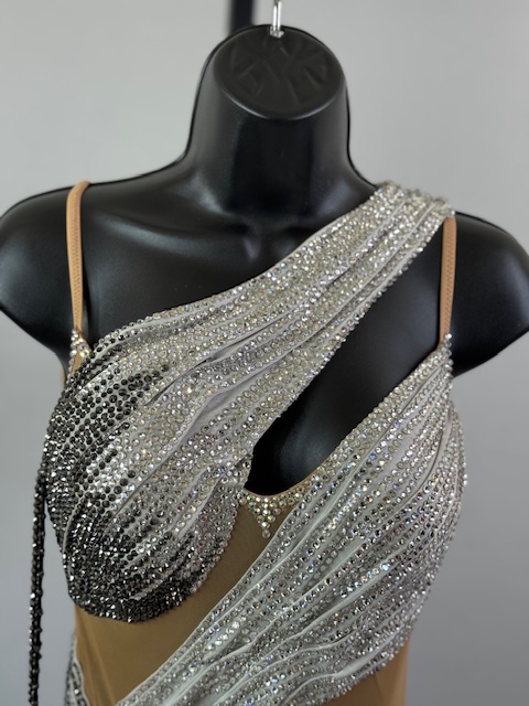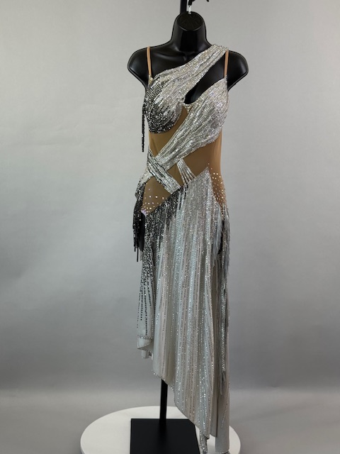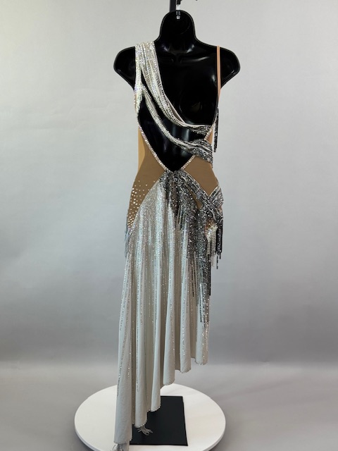 This is a stunning silver Rhythm/Latin dress designed by ARTI Designs! Unique style, true beauty! Trimmed with Austrian crystals.