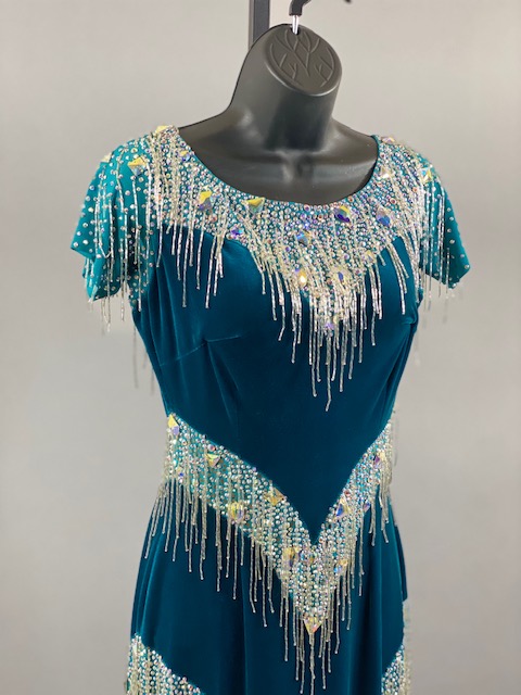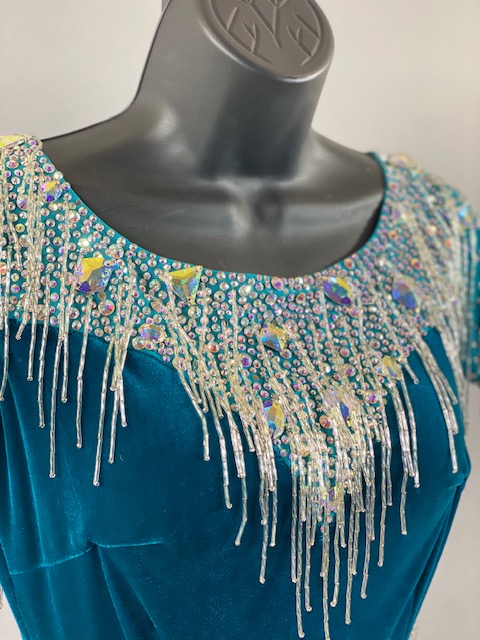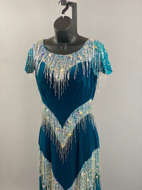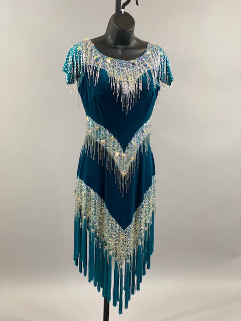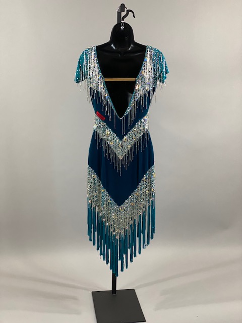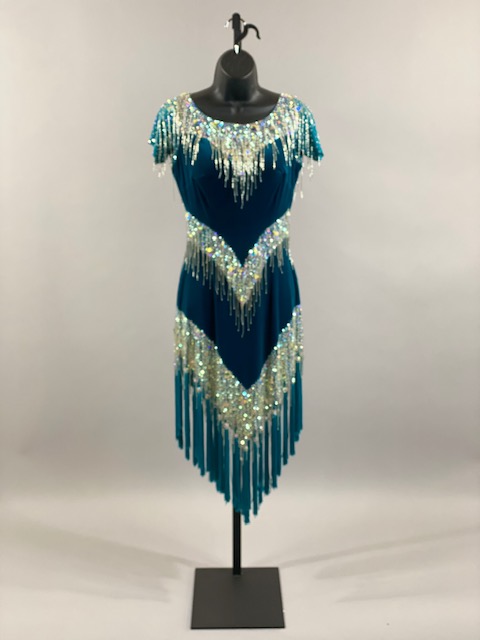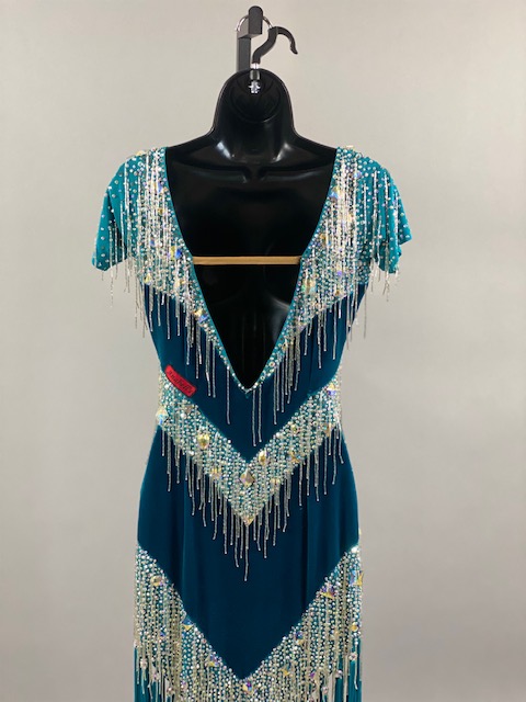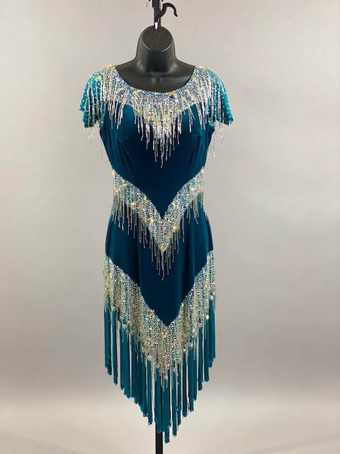 This turquoise silver rhythm/latin dress is very unique! Triangle fringes cut makes your leg line longer. Great for your next competition, “all-around” or showcase. Designed by Tatiana, Anabell’s Dancewear.