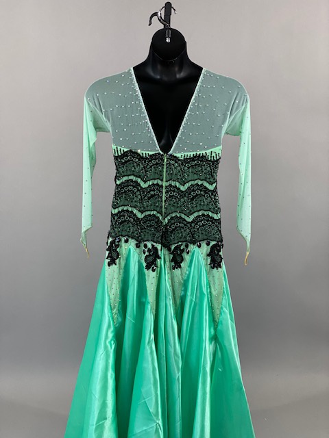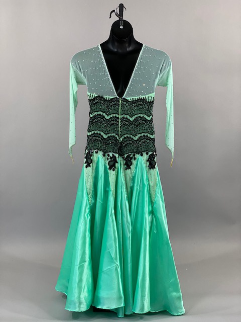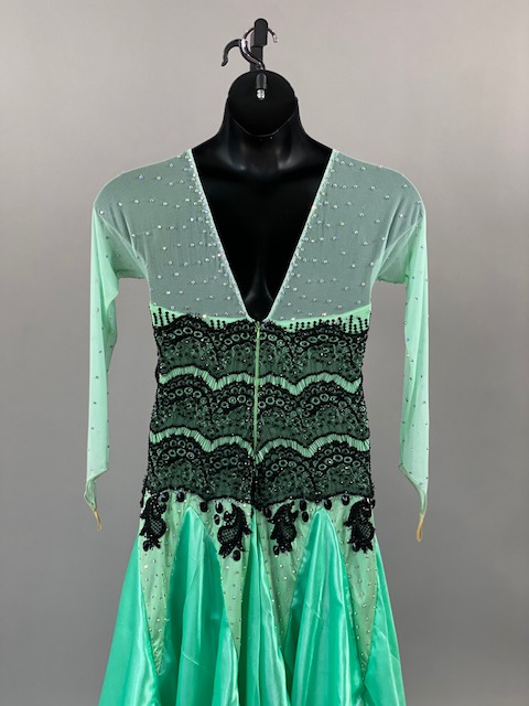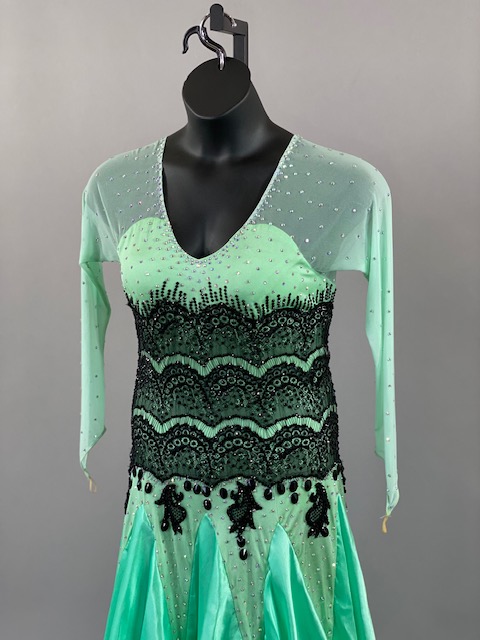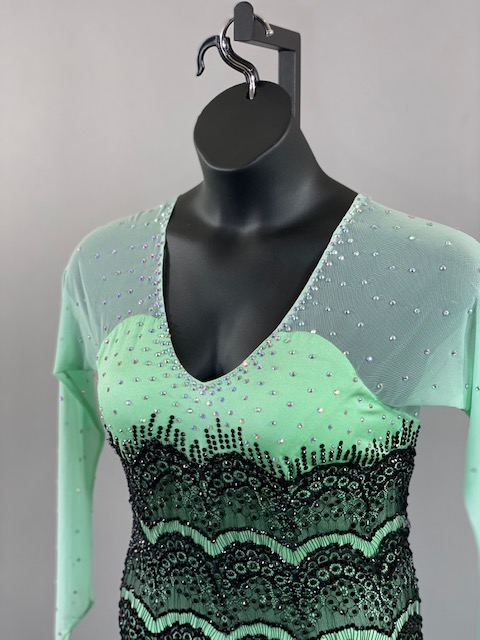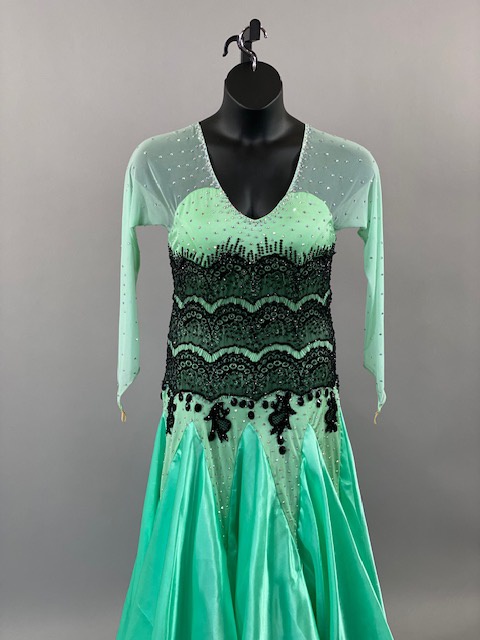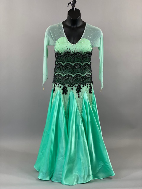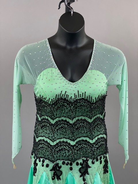 This is a beautiful mint and black smooth dress. Skirt creates a great effect on the dance floor. Trimmed with Preciosa Crystals.