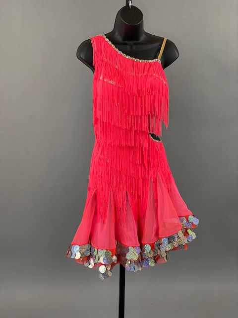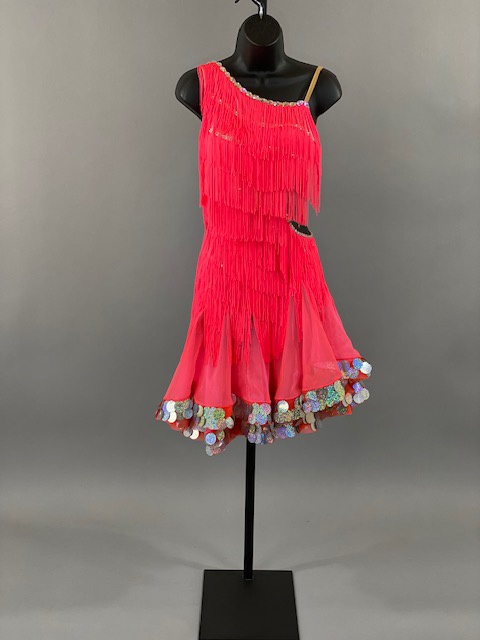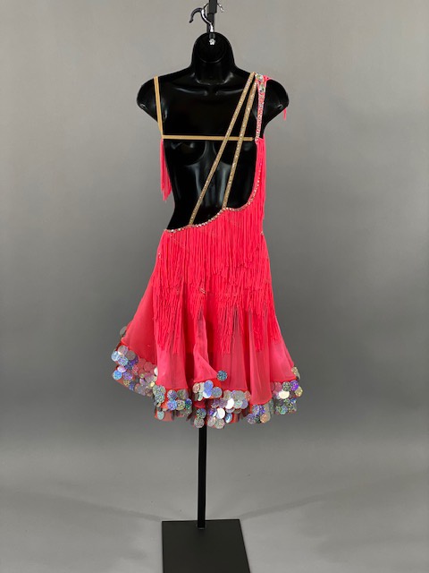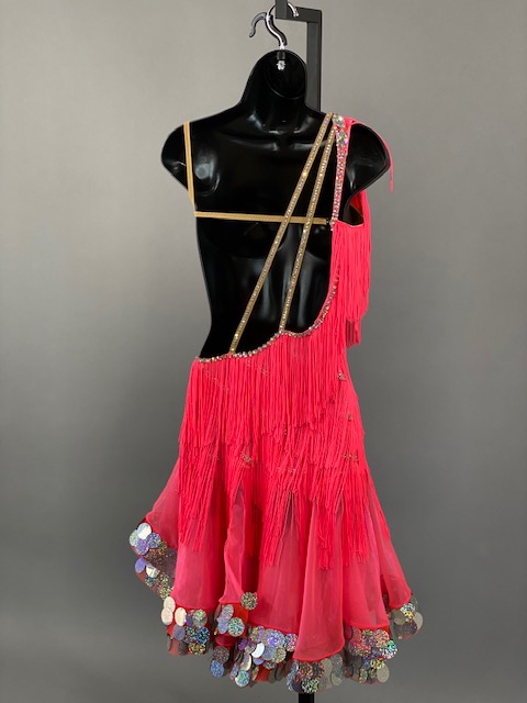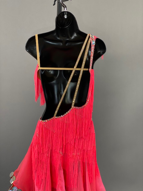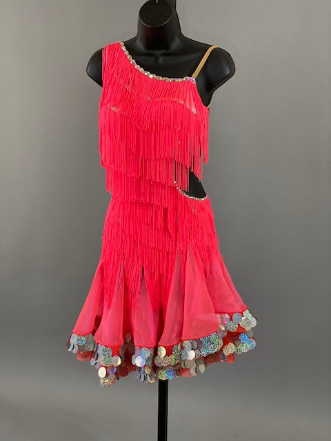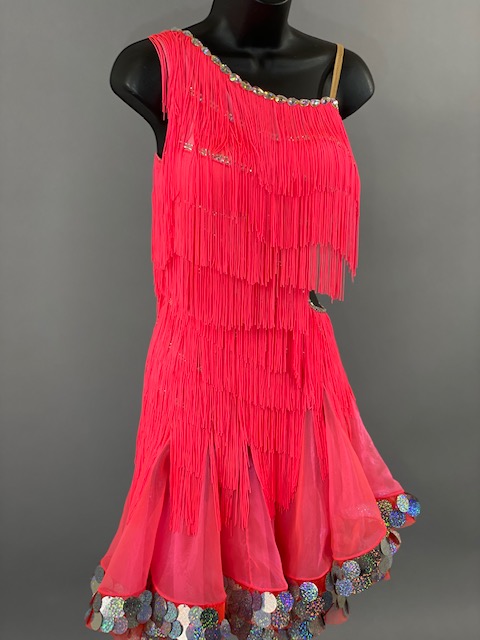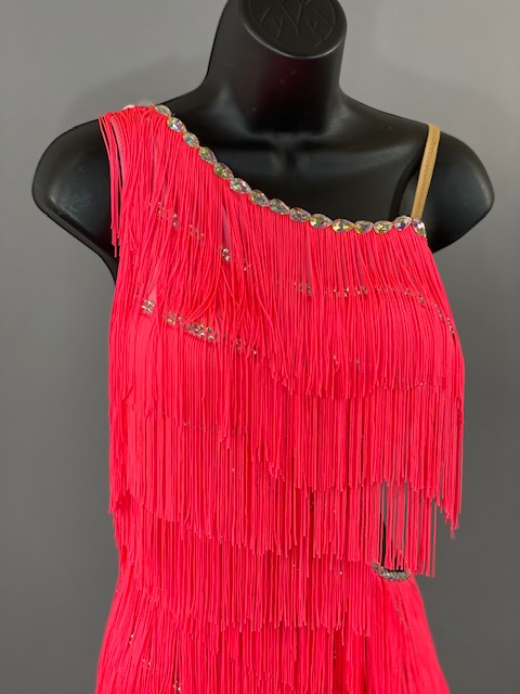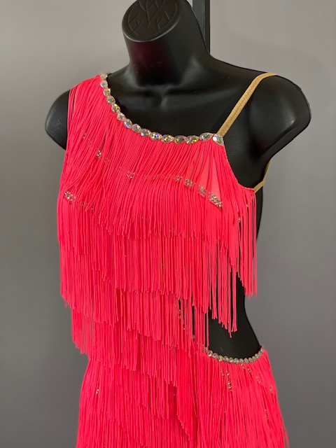 This bright pink rhythm/Latin dress is a beauty! Very unique dress, skirt with fringes creates a great effect on the dance floor. This dress is stoned with Austrian Crystals.