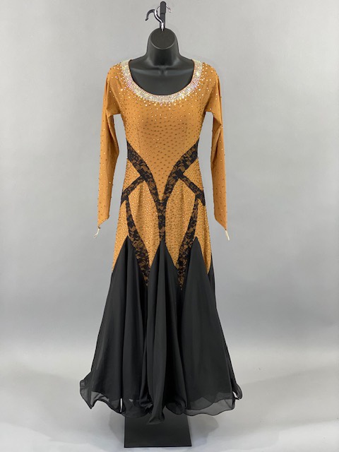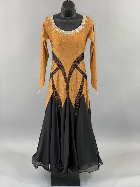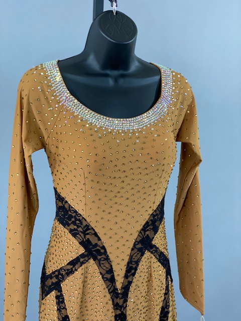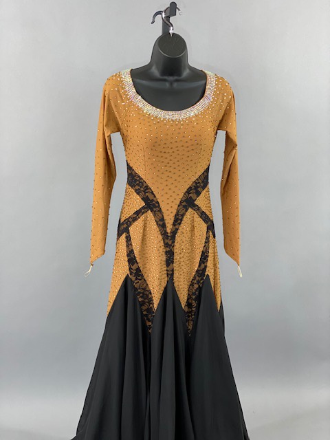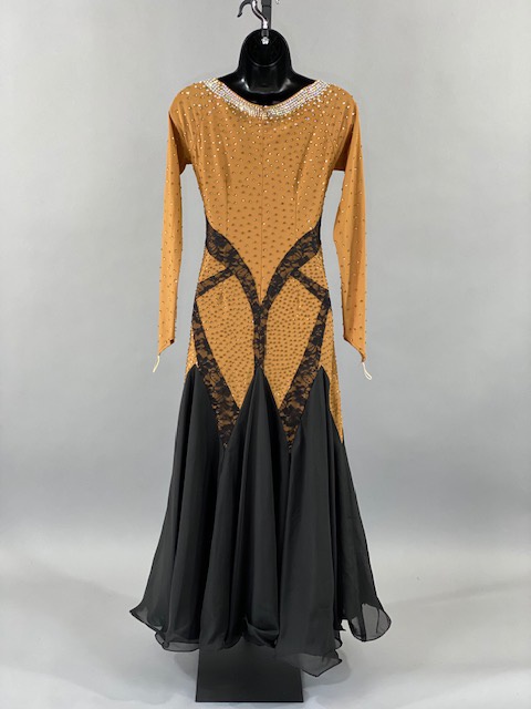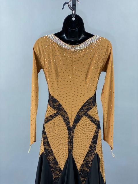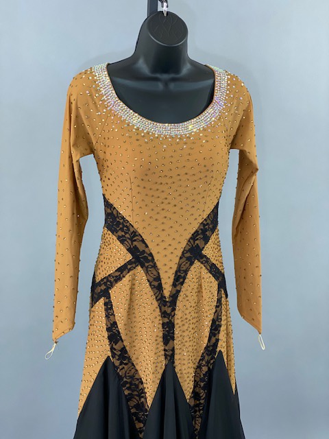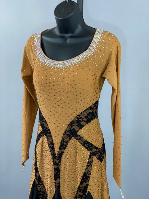 Beautiful black and tan smooth dress! Skirt creates a great effect on the dance floor. This dress is stoned with Austrian Crystals.