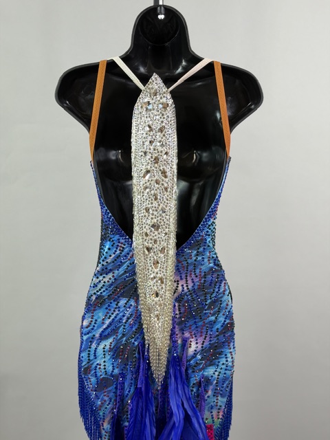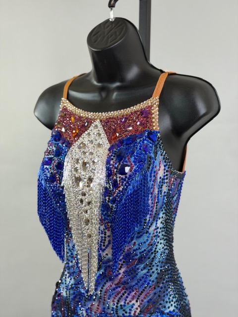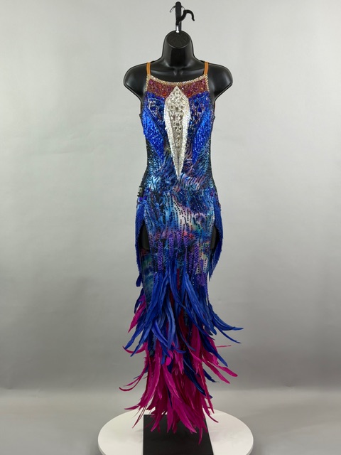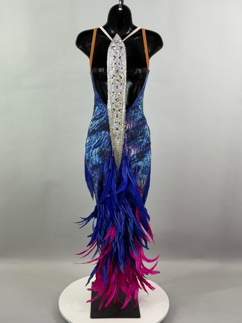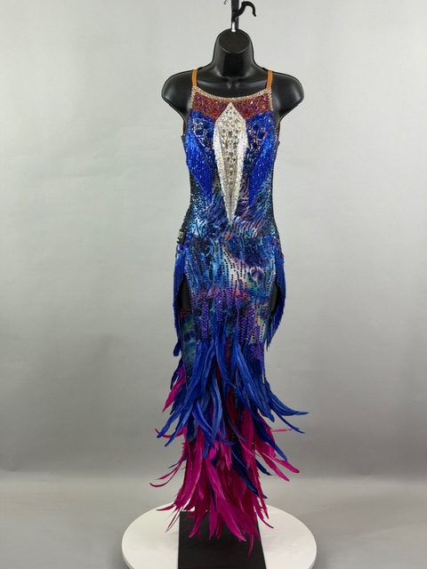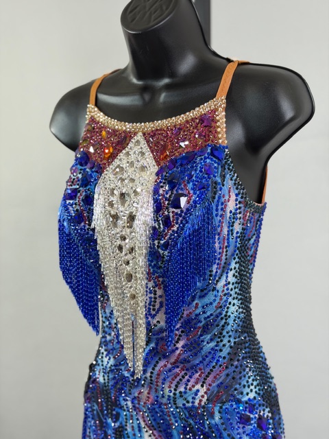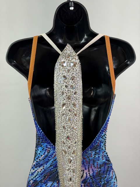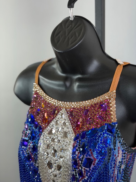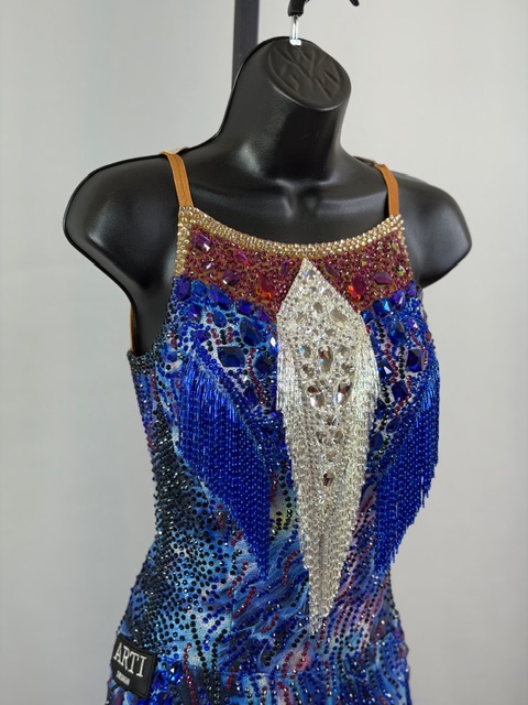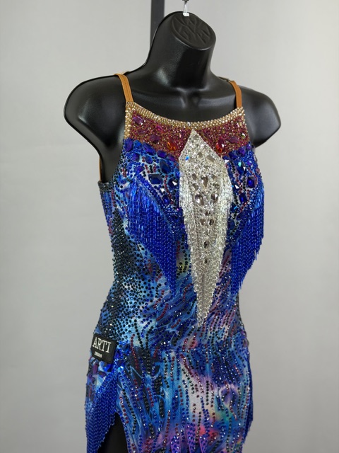 This is beautiful colorful bright blue, pink and white Rhythm/Latin Dress designed by ARTI. Very unique style, a fun dress. Ready to steal the show on the dance floor! Trimmed with Preciosa Crystals.
