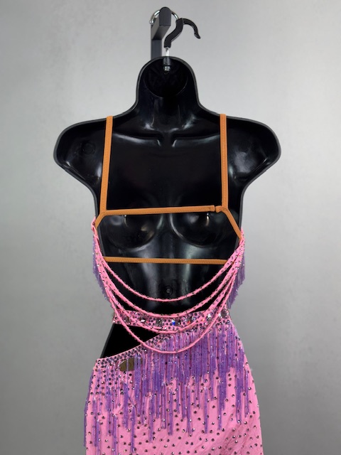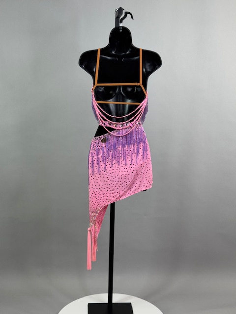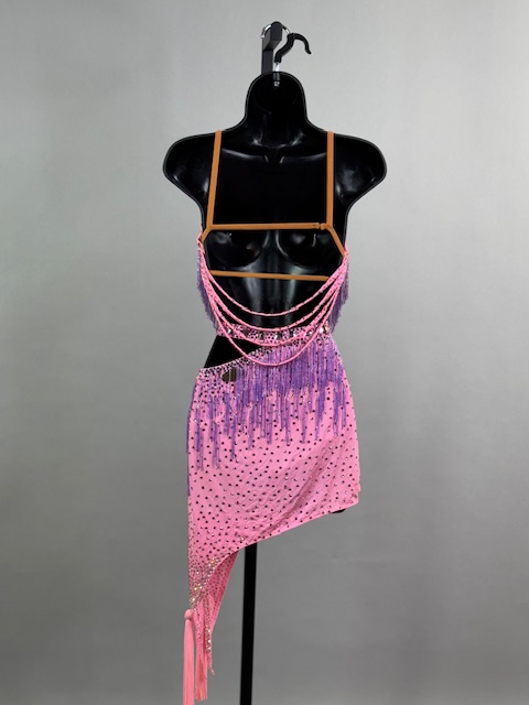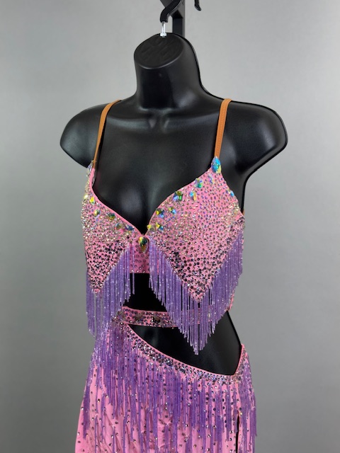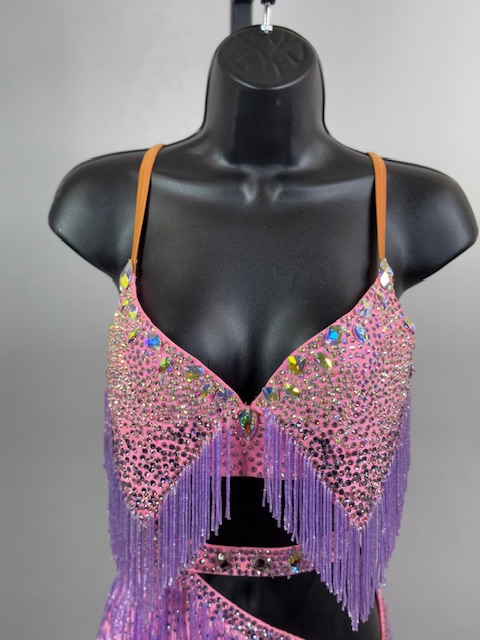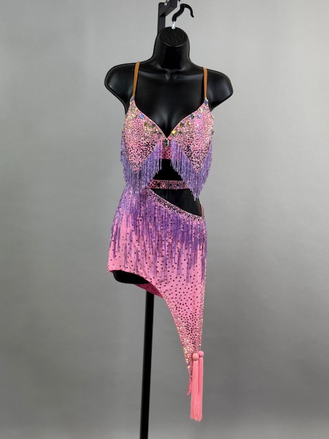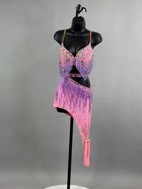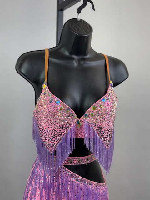 This is a beautiful two piece pink a lavender Rhythm/Latin dress. Gorgeous style on the dance floor. Trimmed with Austrian Crystals.