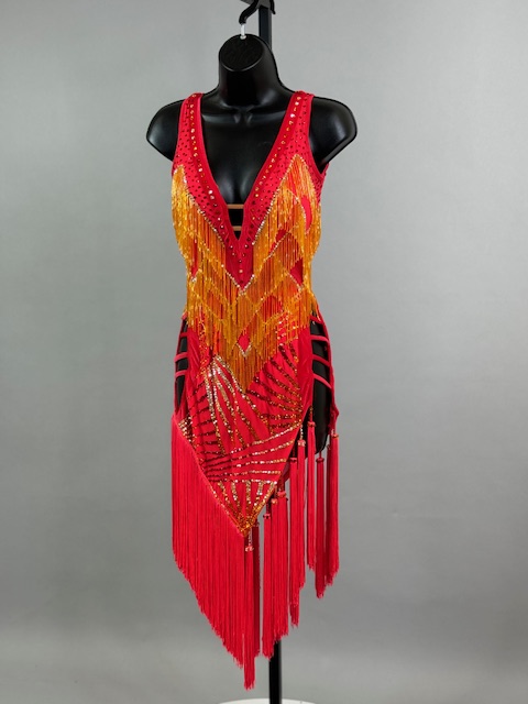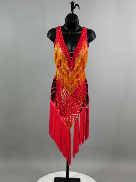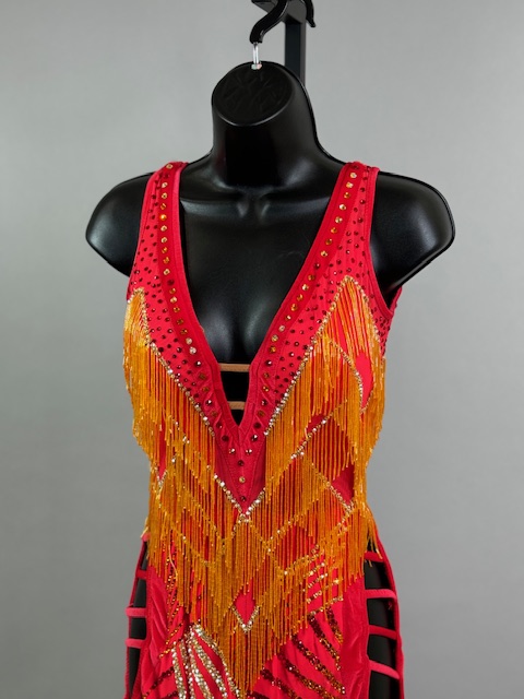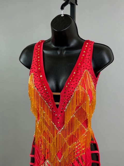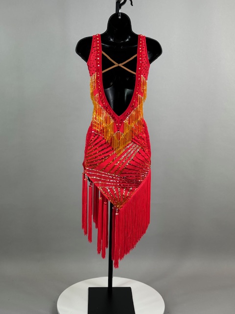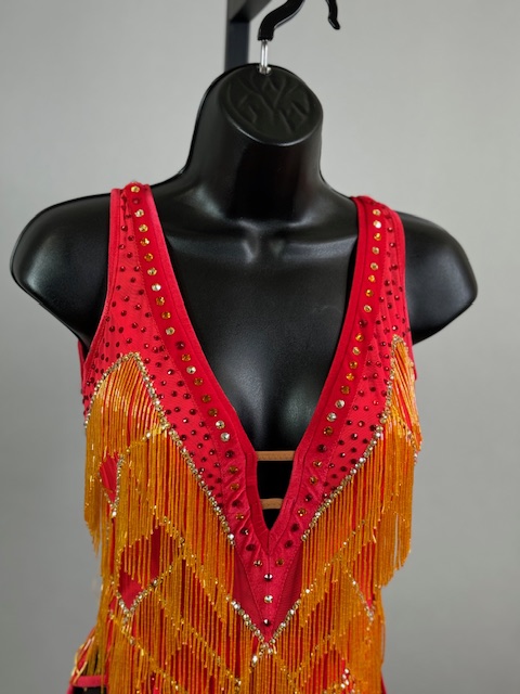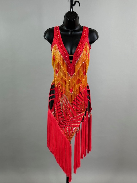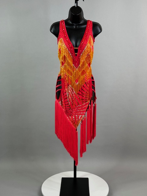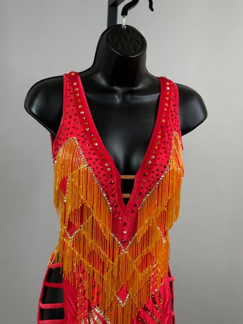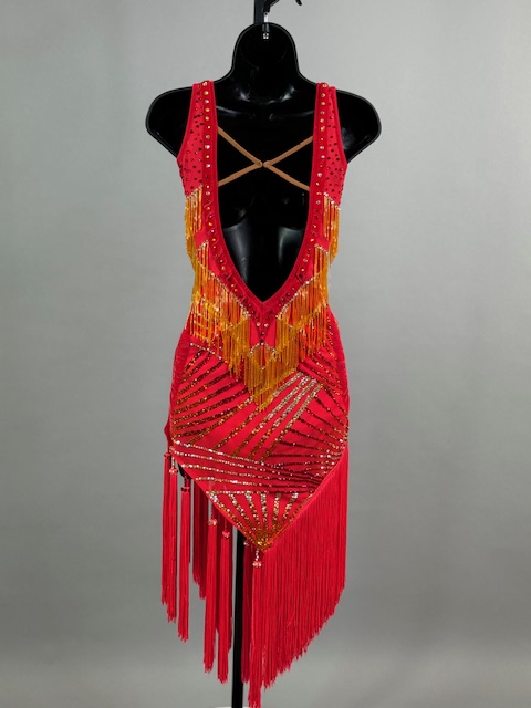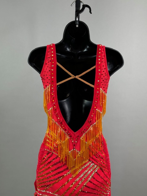 This is a beautiful bright coral red Rhythm/Latin dress designed by Dore Designs! It’s very unique style. Trimmed with Austrian Crystals.