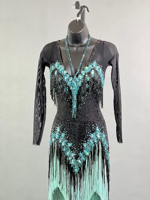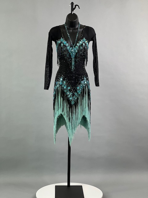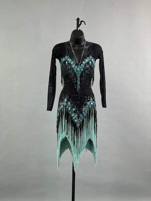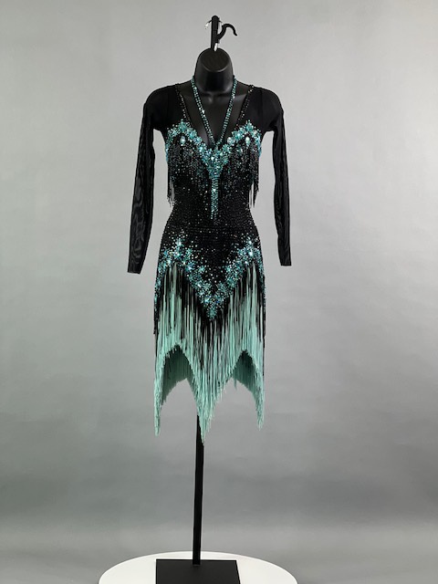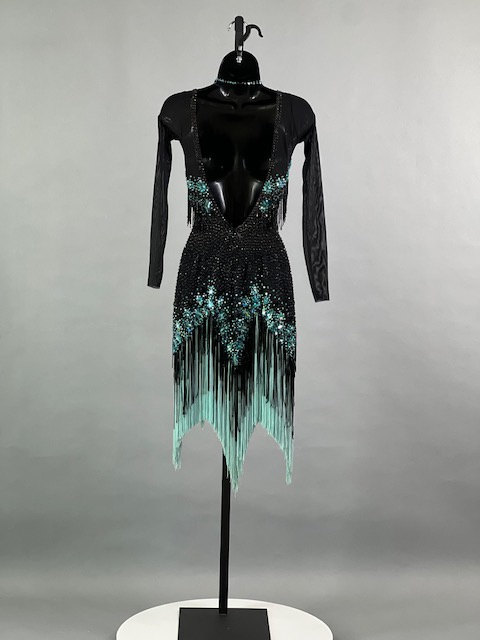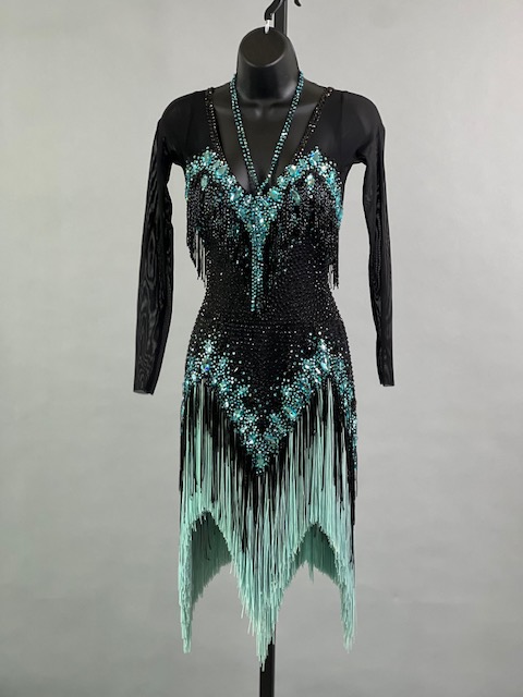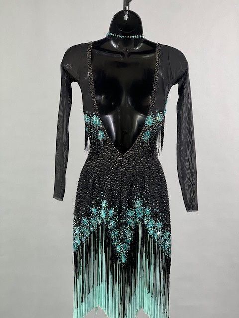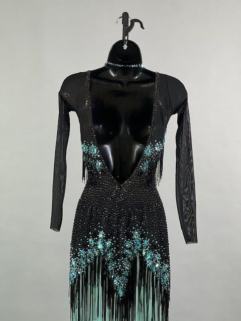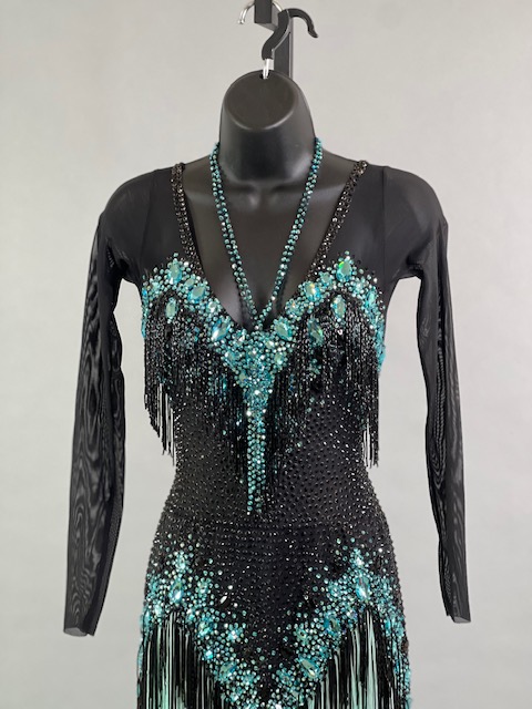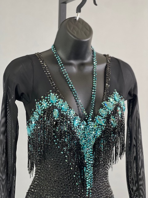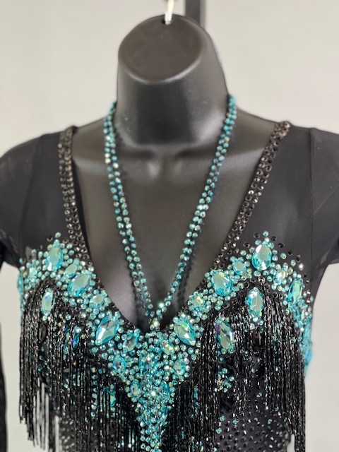 This a beautiful black and teal Rhythm/Latin dress! Fringes moves amazing on the dance floor, very unique! Trimmed with Austrian crystals.