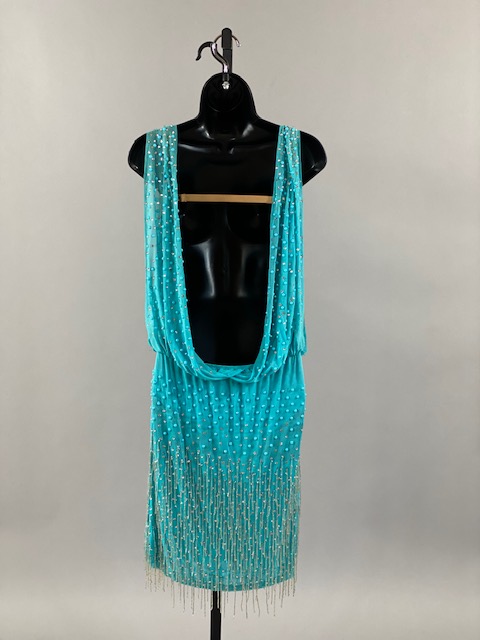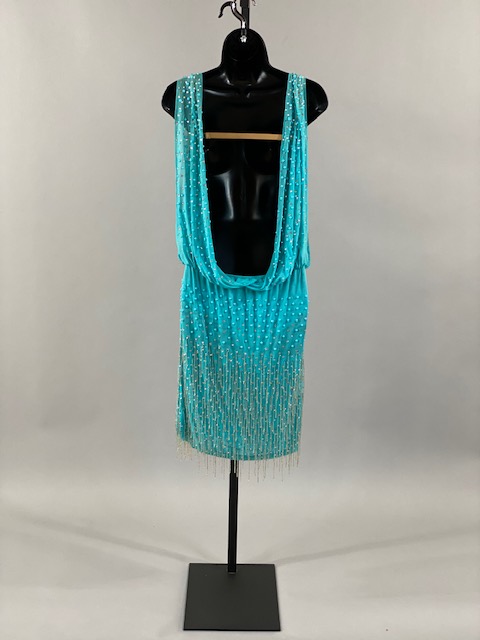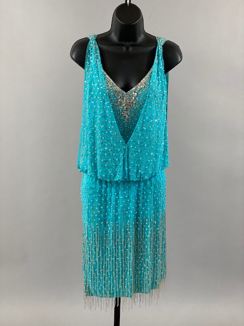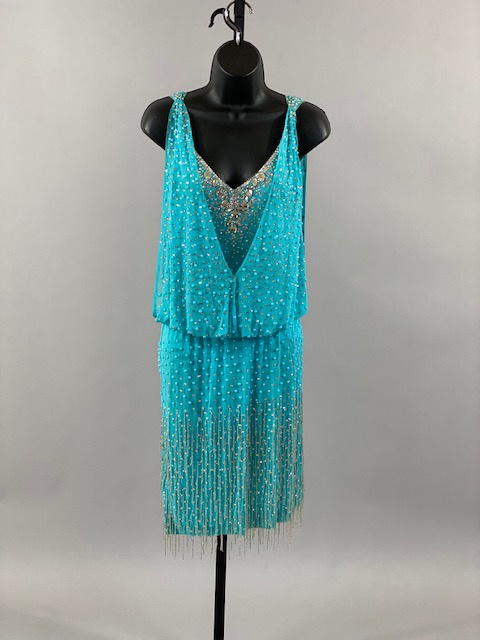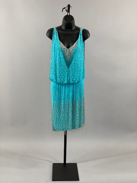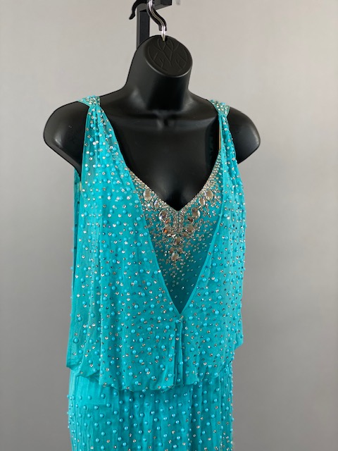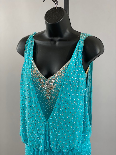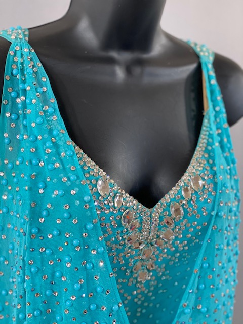 This is an amazing turquoise silver rhythm/latin dress. It moves fantastic on the dance floor. Great for competitions or your next showcase. Trimmed with Austrian Crystals.