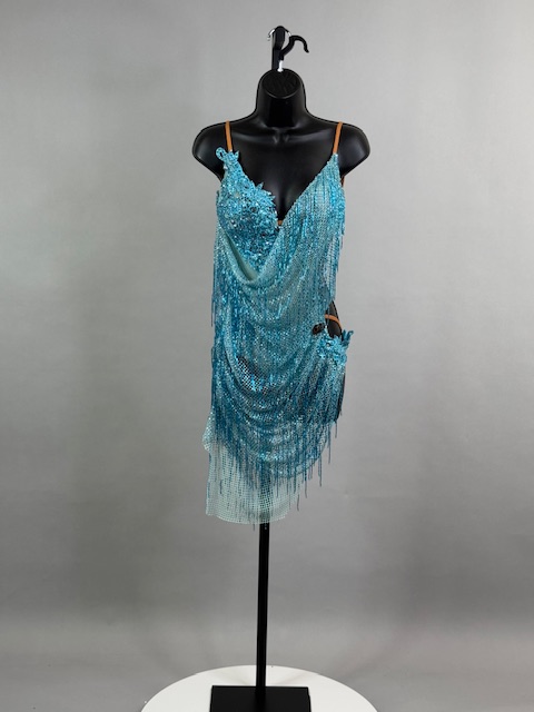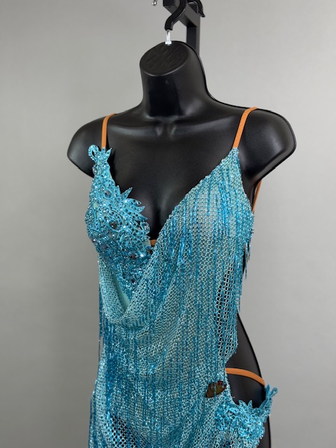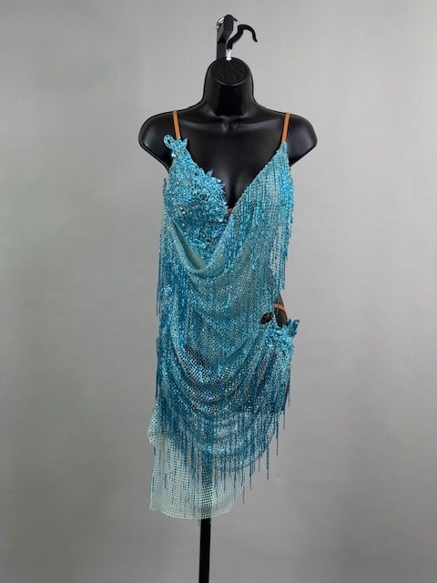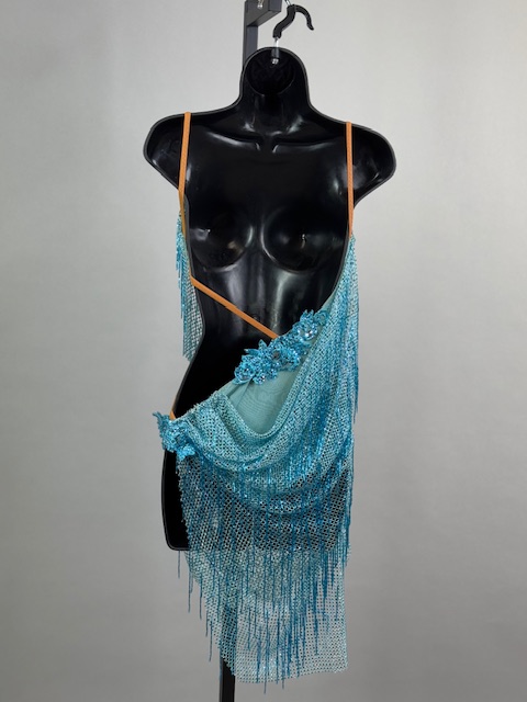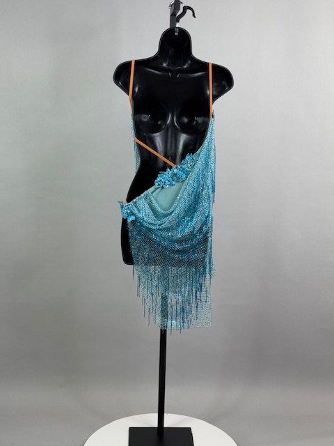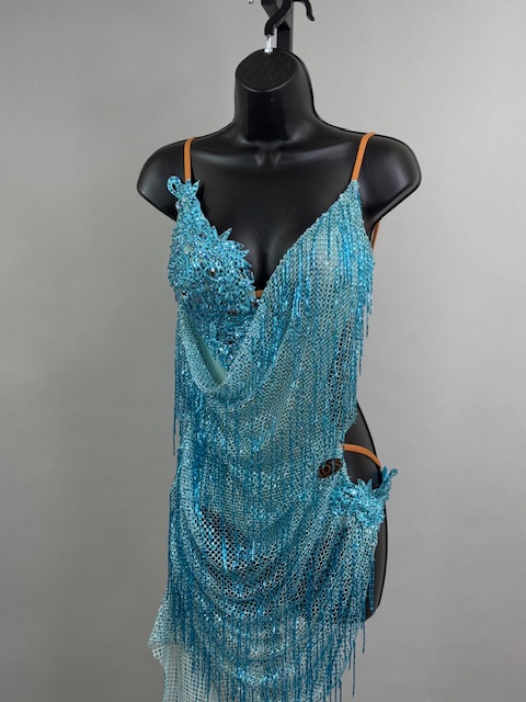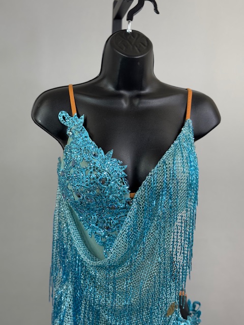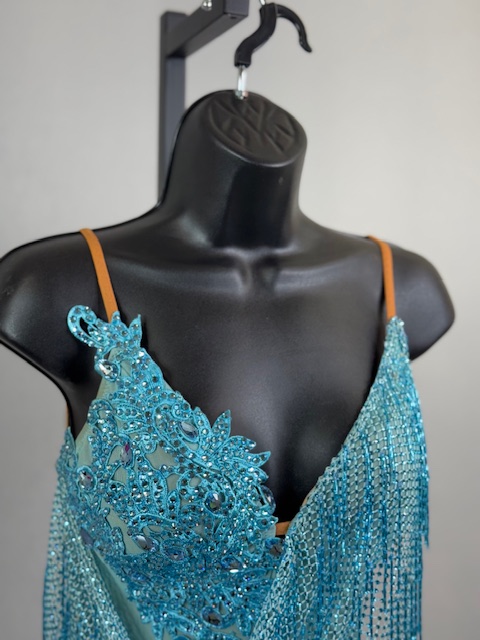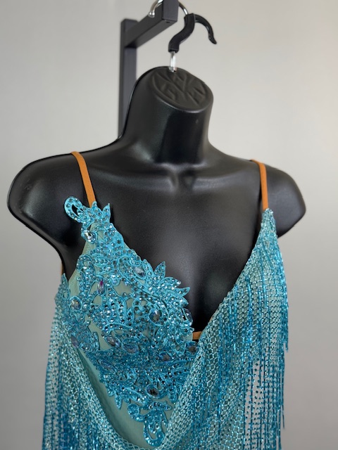This is a beautiful turquoise Rhythm/Latin dress. Gorgeous style on the dance floor. Trimmed with Austrian Crystals.