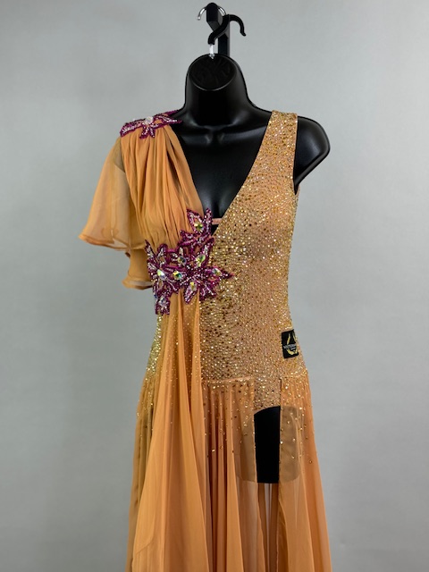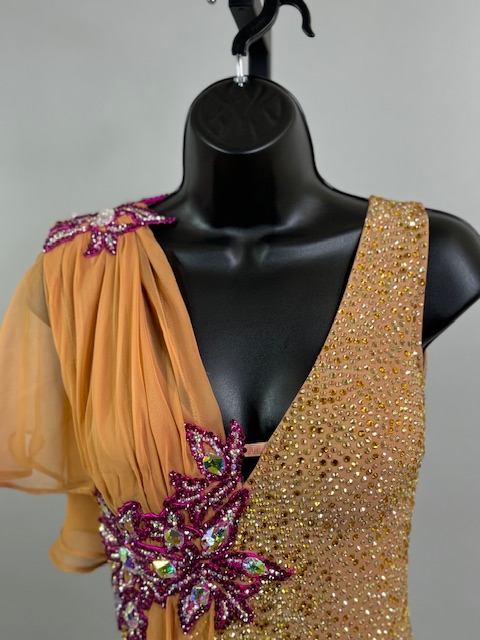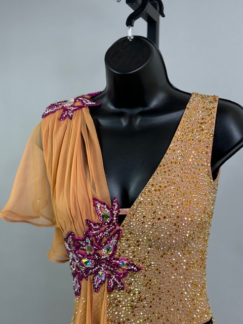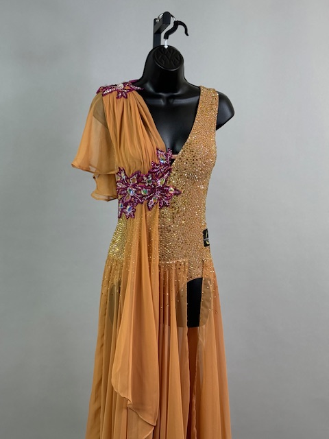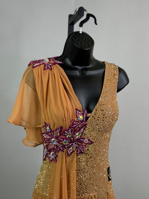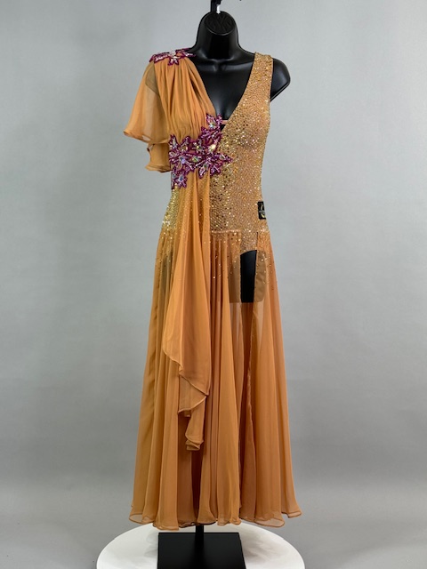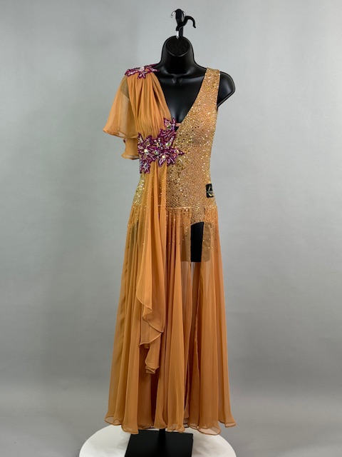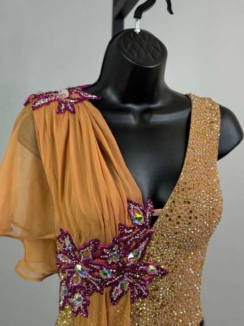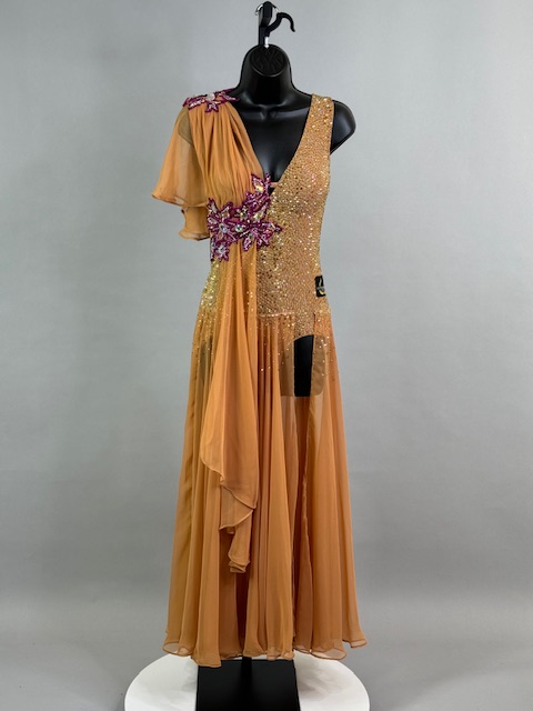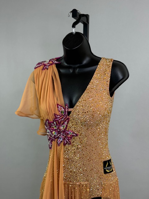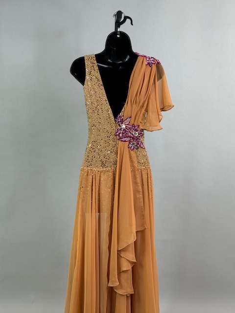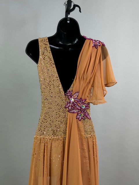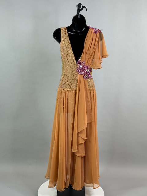 This is a stunning tan/brick smooth dress designed by Victoria Blitz! It’s a unique style. Stoned with Austrian Crystals.