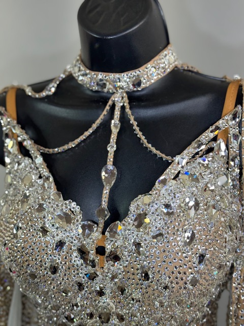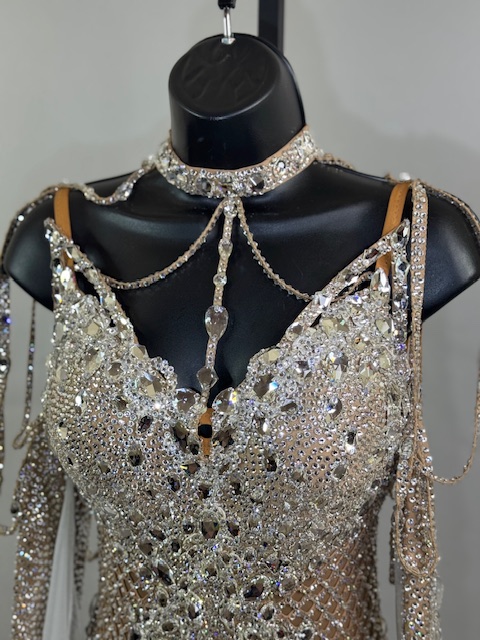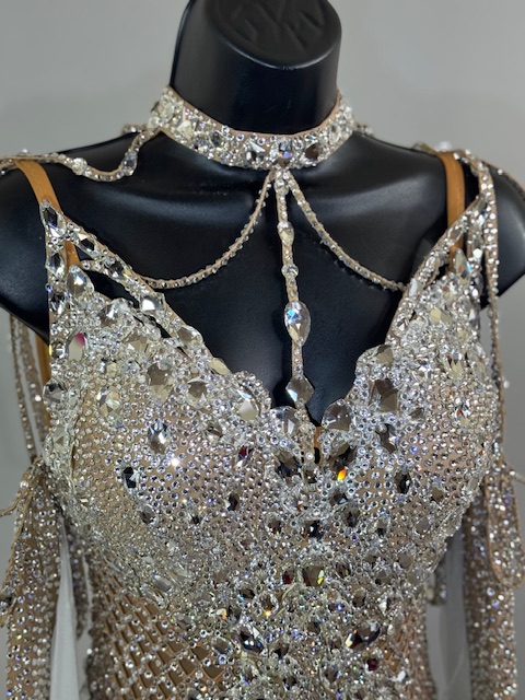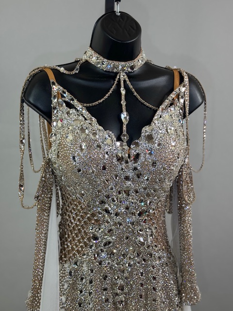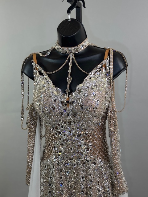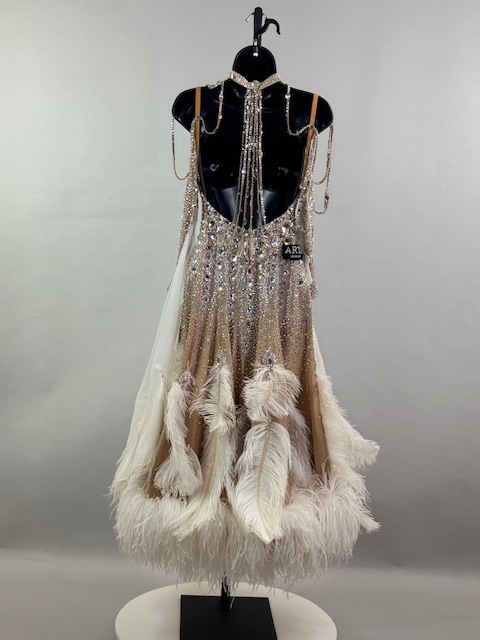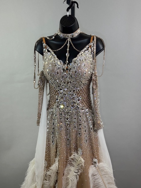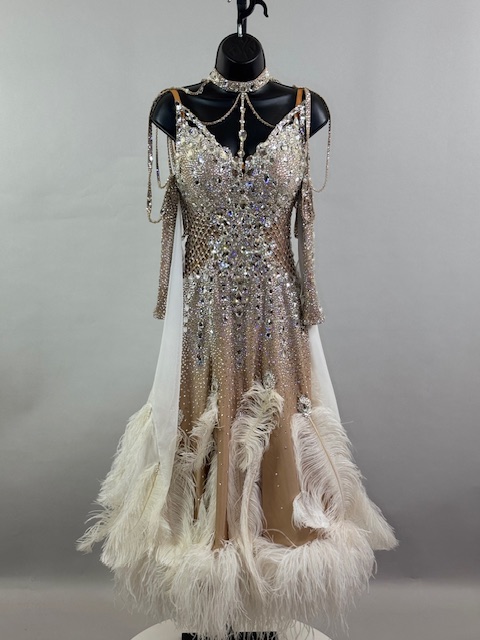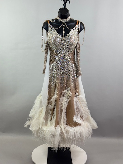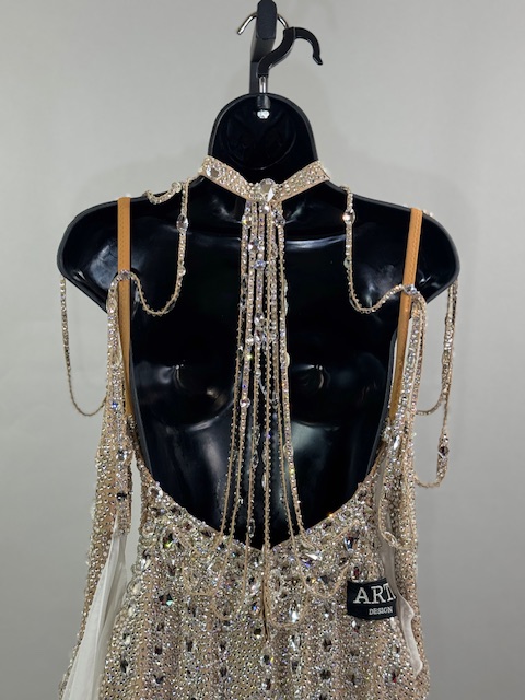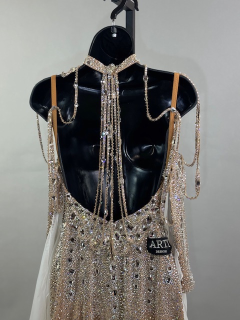 This is a stunning tan and white crystals standard dress designed by ARTI Designs! It moves gracefully around the dance floor. Very unique, an art piece. Trimmed with Austrian crystals.