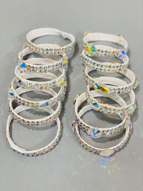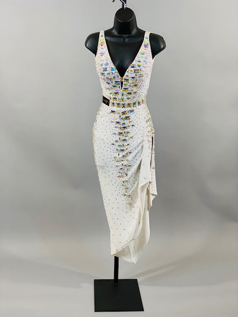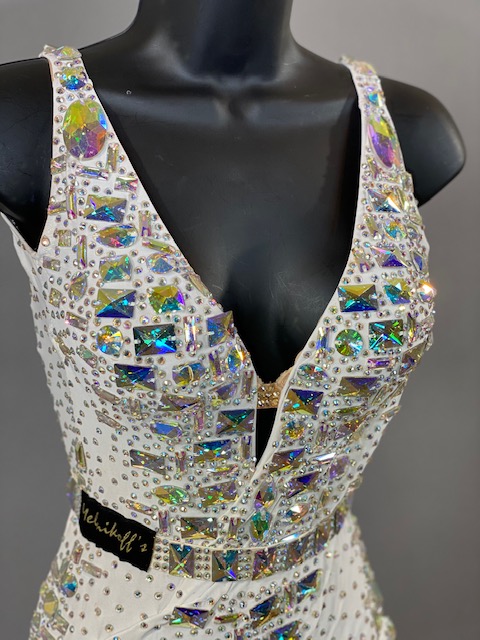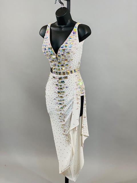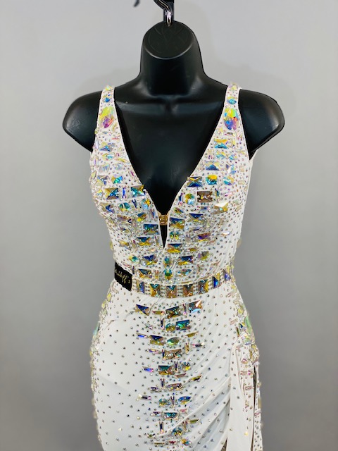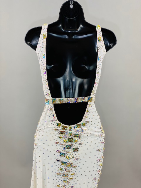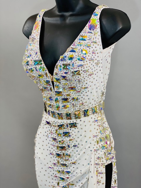 This white dress it’s simple stunning! Skirt creates a great effect on the dance floor. Dress designed by Melnikoff’s. Includes bracelets. This dress is stoned with Austrian Crystals.
