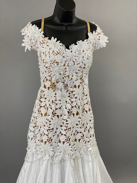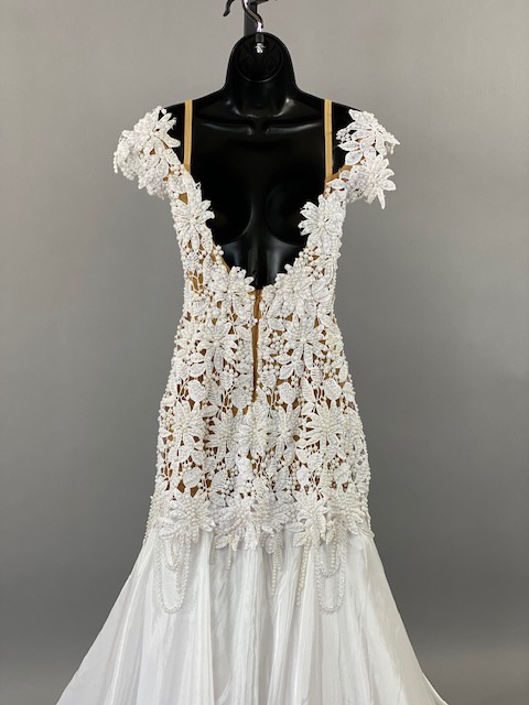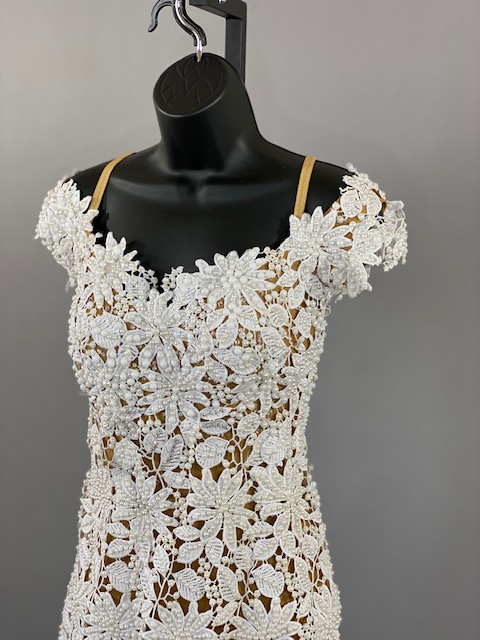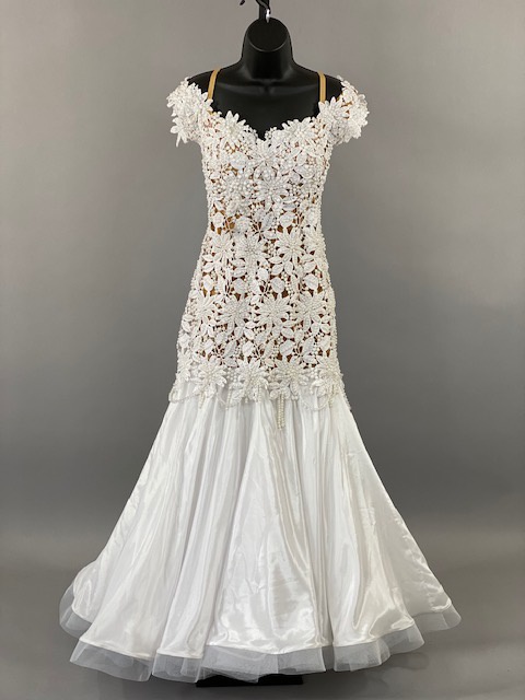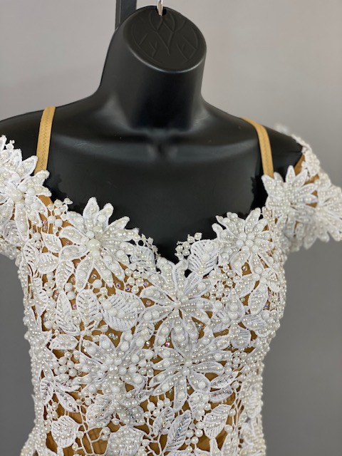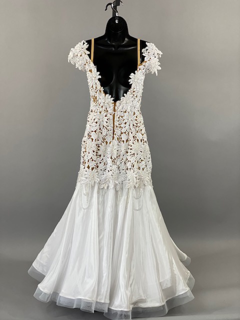 Beautiful white smooth dress! Very unique style. Skirt creates a great effect on the dance floor. This dress is stoned with Austrian Crystals.