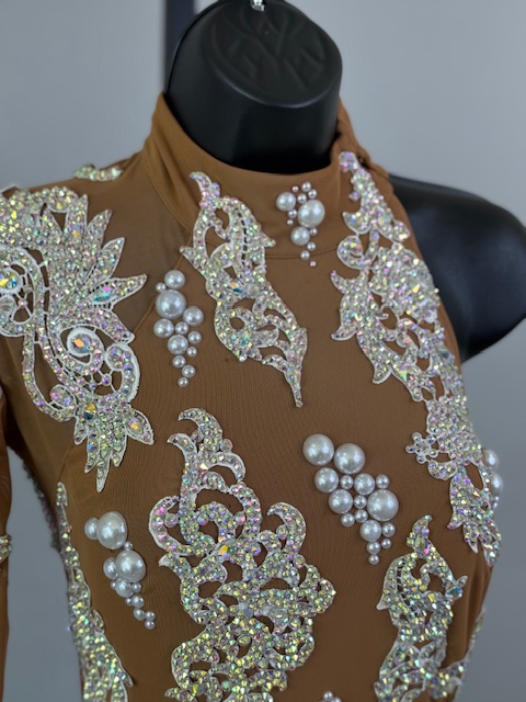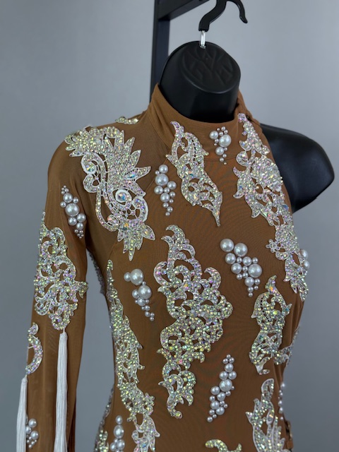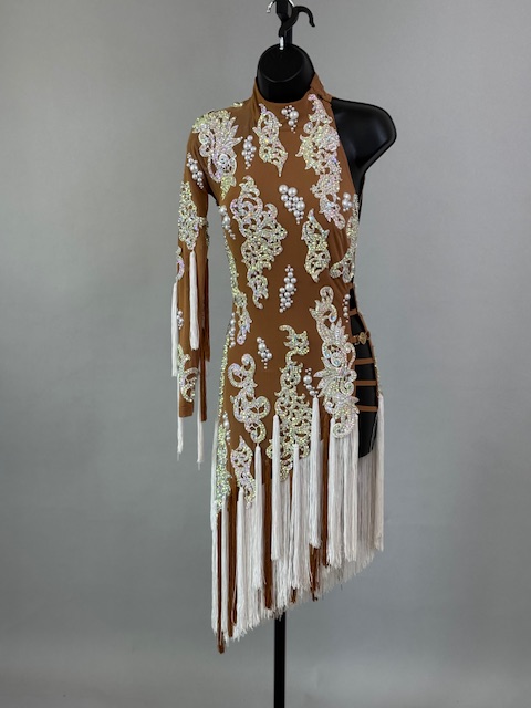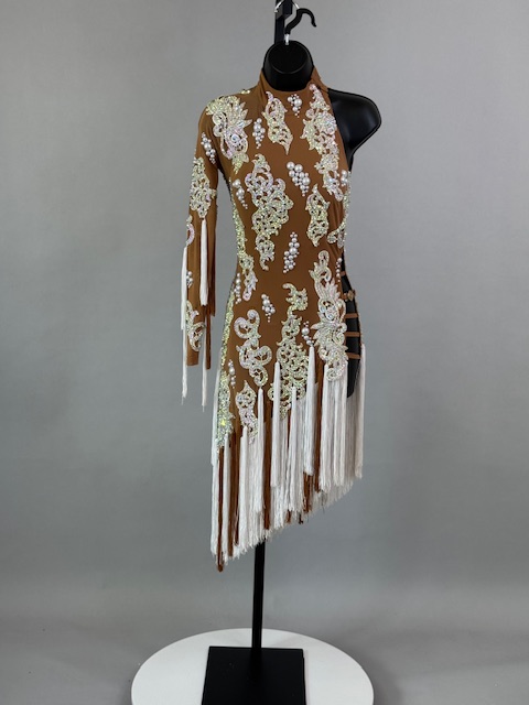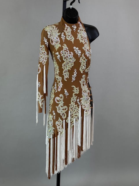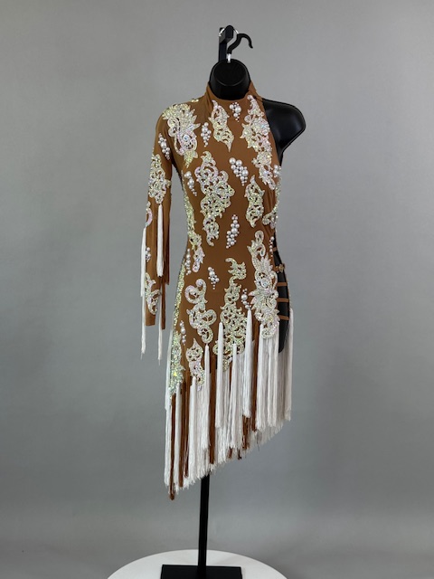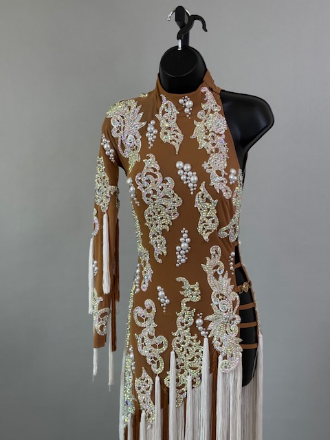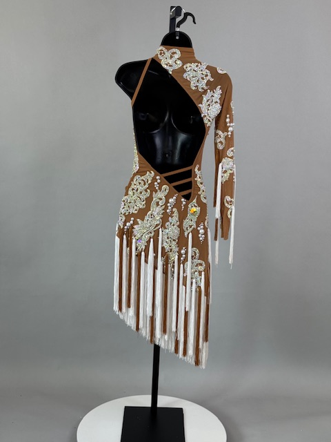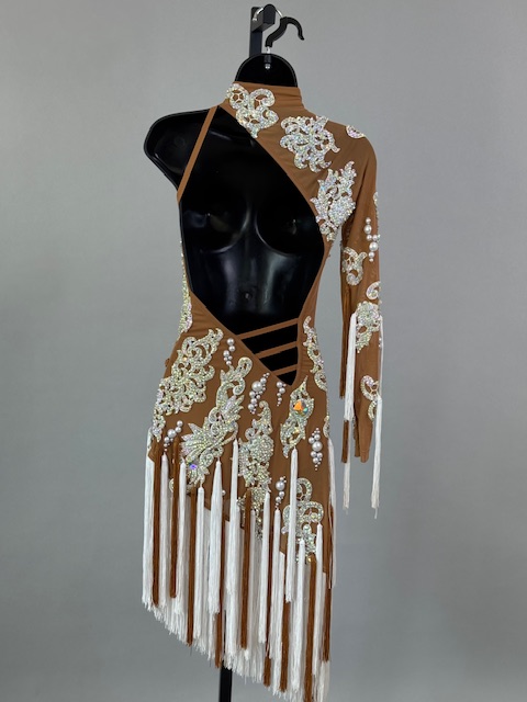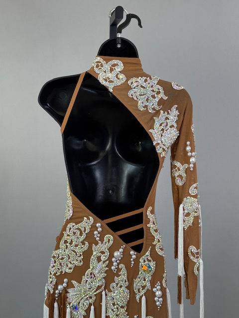 This is a gorgeous white and tan Rhythm/Latin dress! It moves amazing on the dance floor. Unique style. Trimmed with Austrian Crystals.