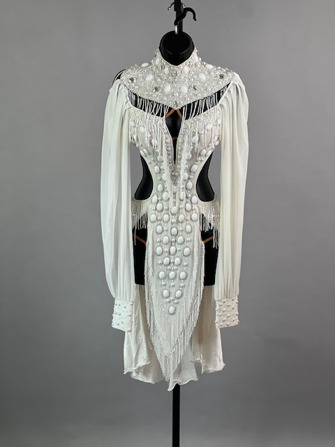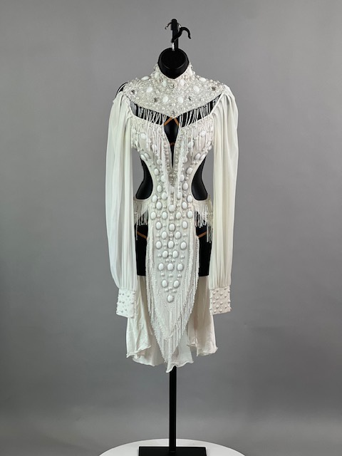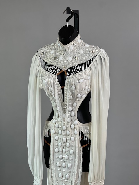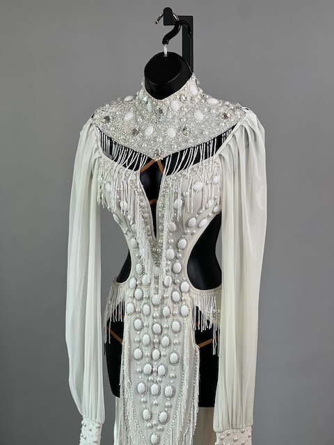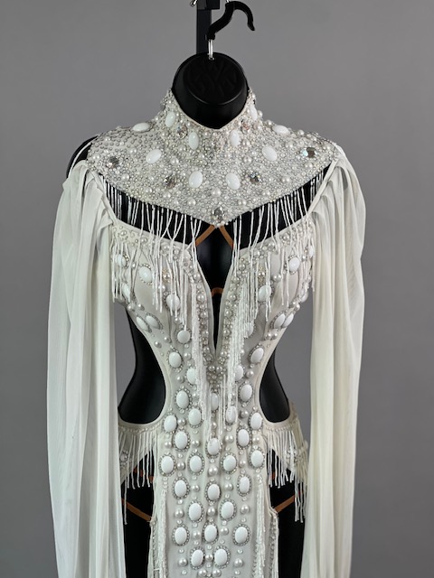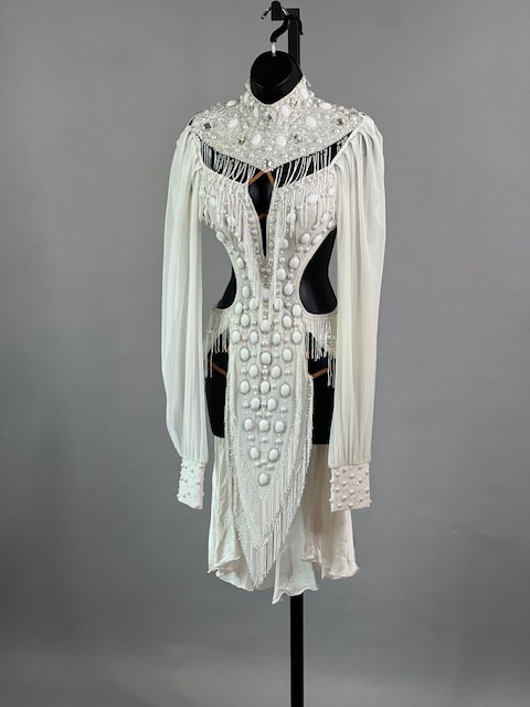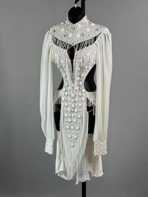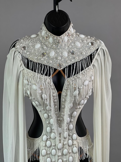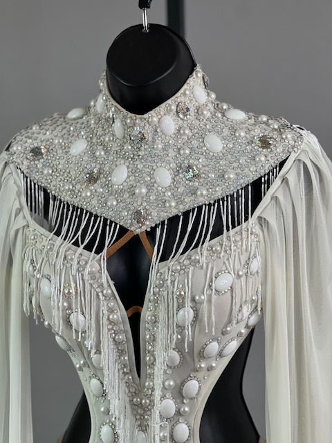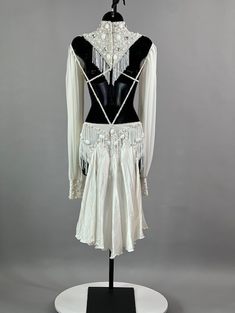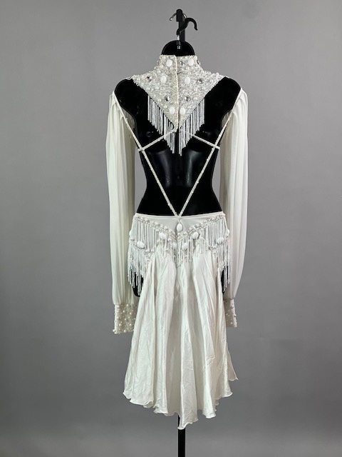 This is a beautiful off white Rhythm/Latin dress with a designed by Dore Designs! It moves amazing on the dance floor. Trimmed with Austrian Crystals!