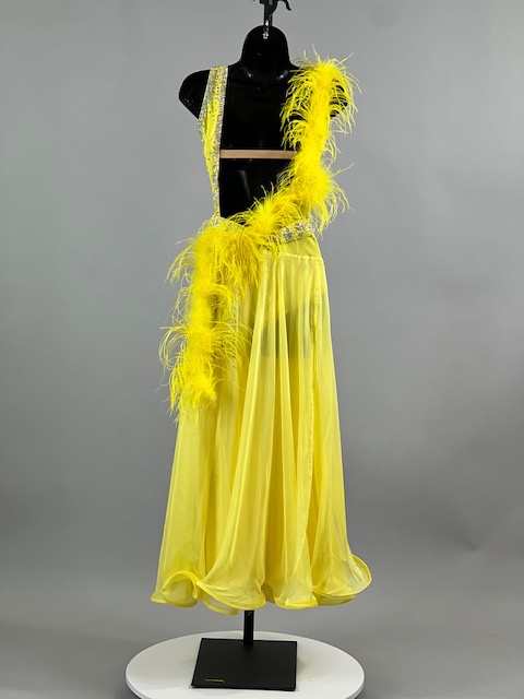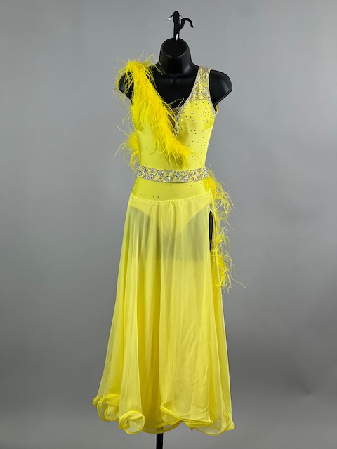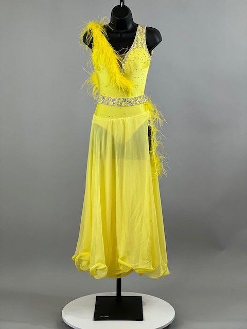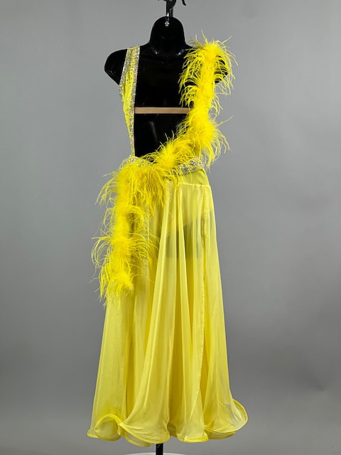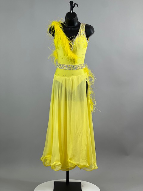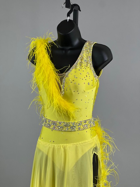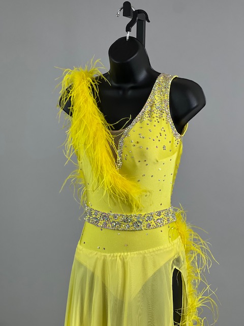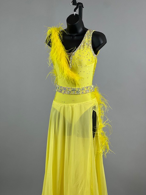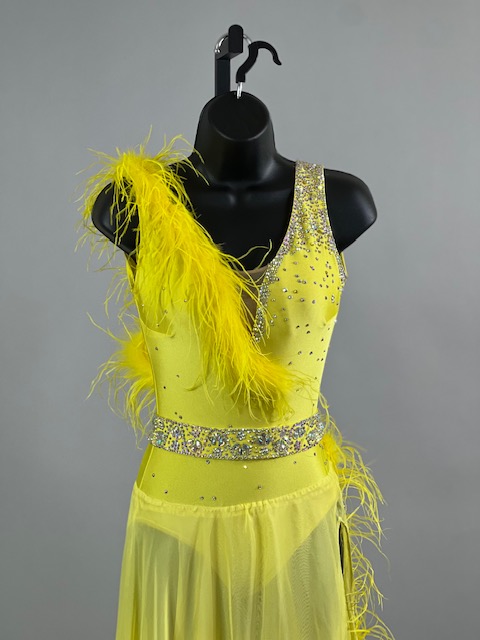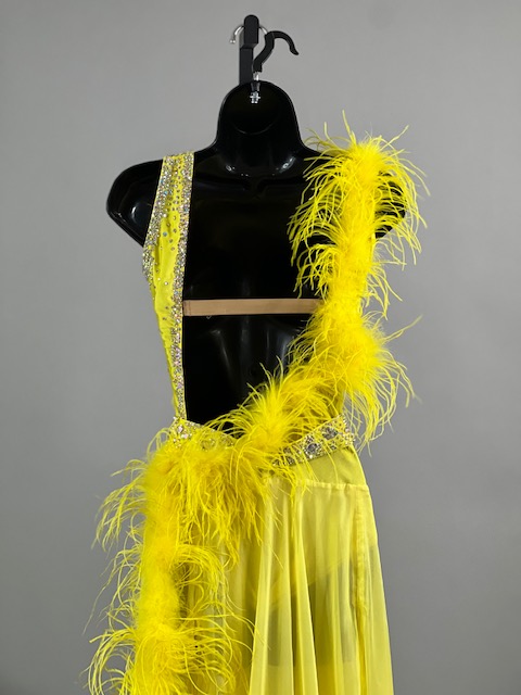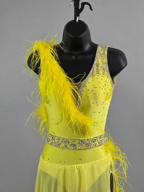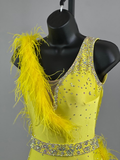 This is a beautiful bright yellow smooth dress. It’s a unique style, it moves amazing on the dance floor. Stoned with Austrian Crystals.