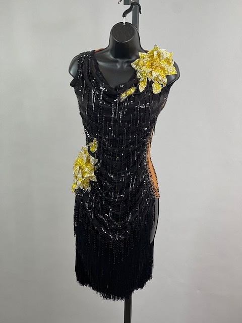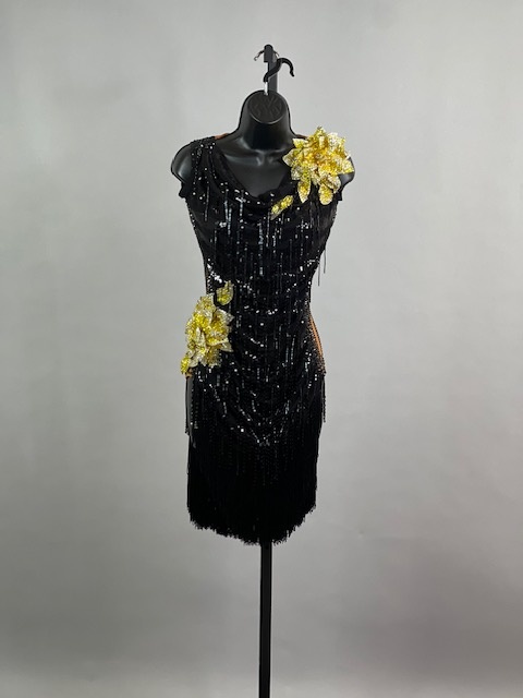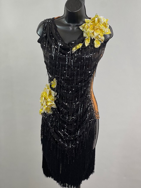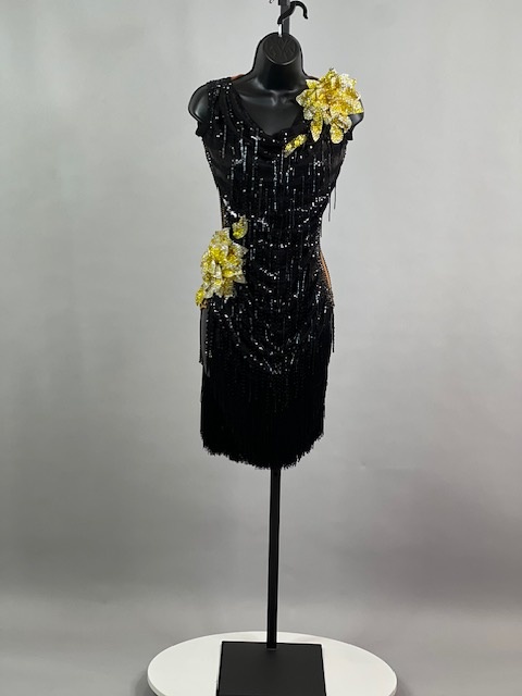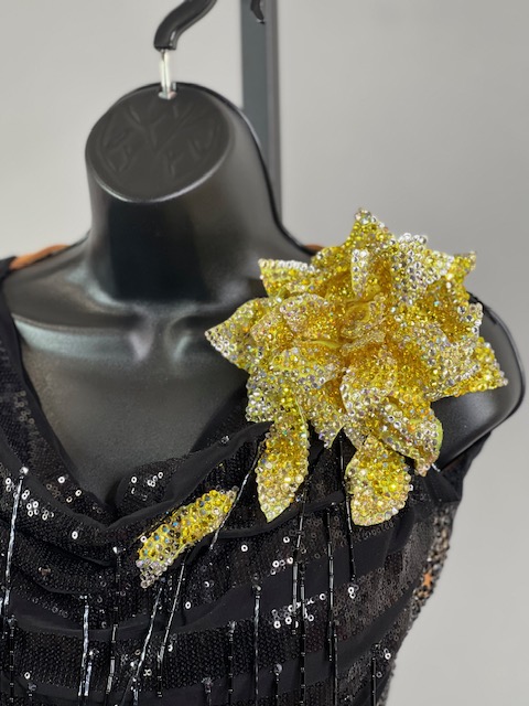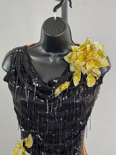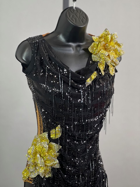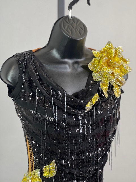 This is a stunning black and yellow Rhythm/Latin dress! Skirt moves amazing on the dance floor, a true beauty! It’s Trimmed with Austrian crystals.