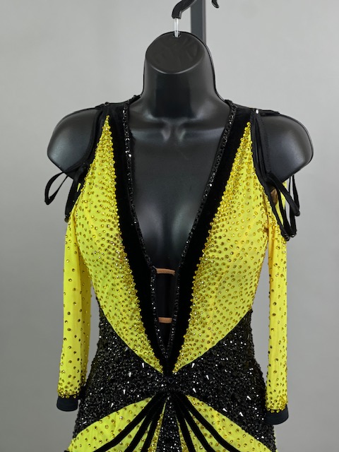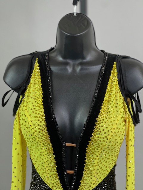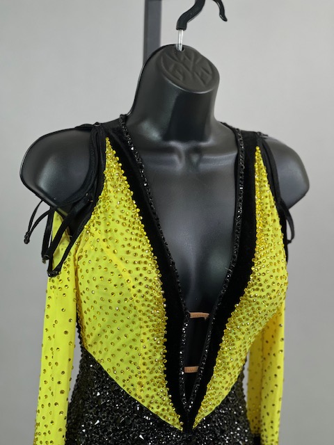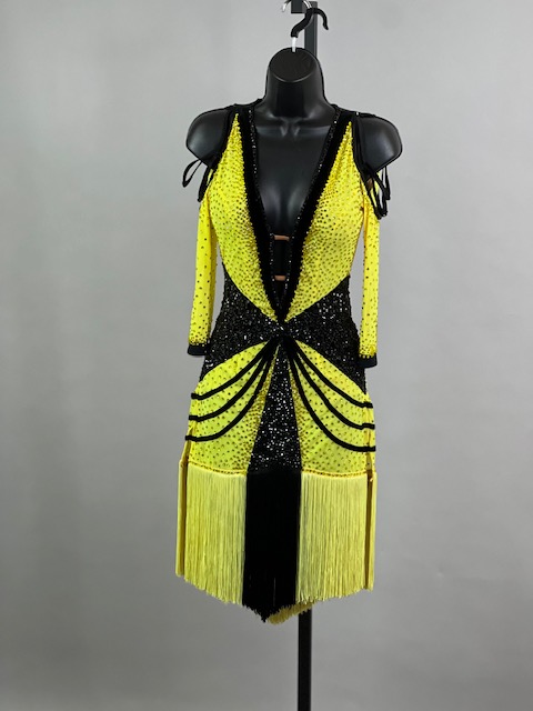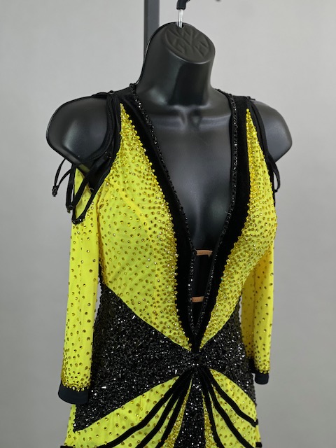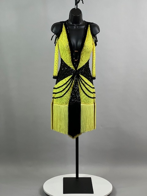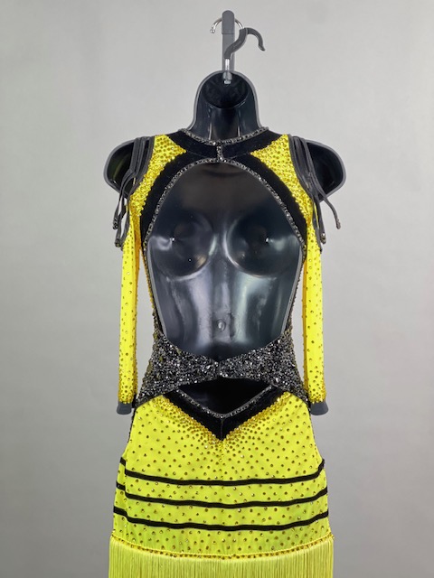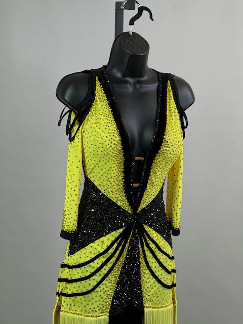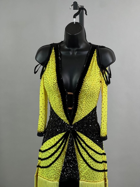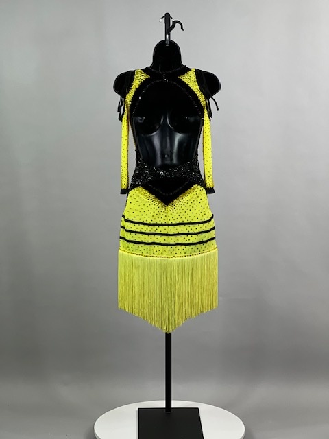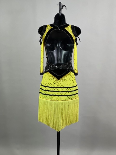 This is a beautiful bright yellow neon and black Rhythm/Latin dress designed by Dore Designs! Fringes skirt creates a great effect on the dance floor. Trimmed with Austrian Crystals.
