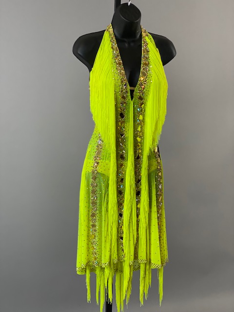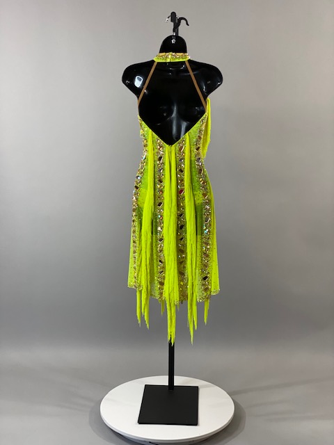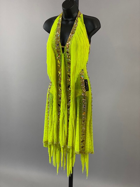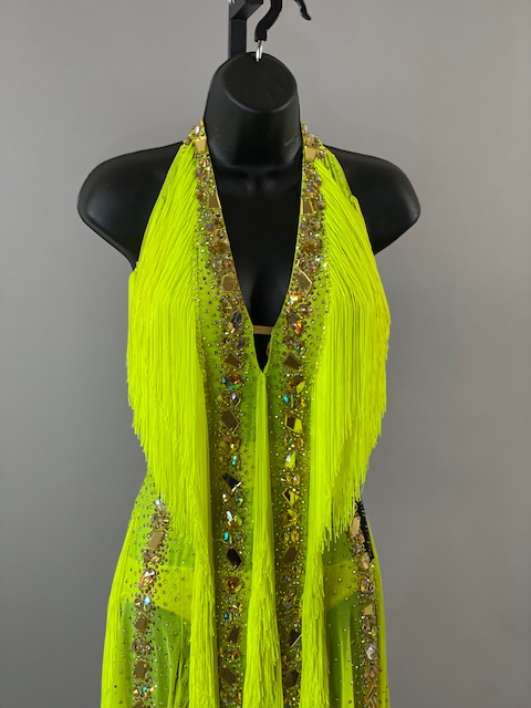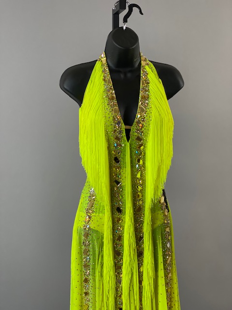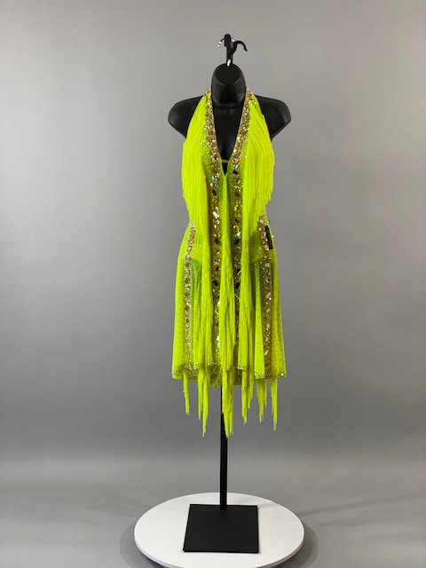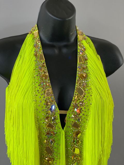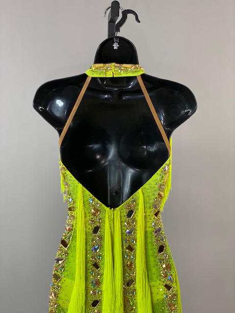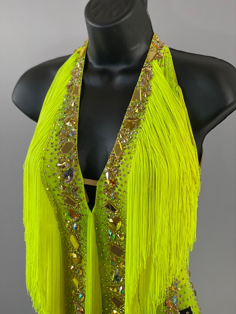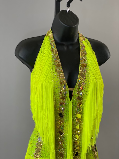 This is a beautiful bright yellow Rhythm/Latin dress! It’s an absolute stunning dress on the dance floor. Very unique style! Dress designed by Melnikoff’s. Trimmed with Austrian crystals.