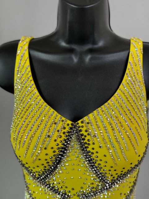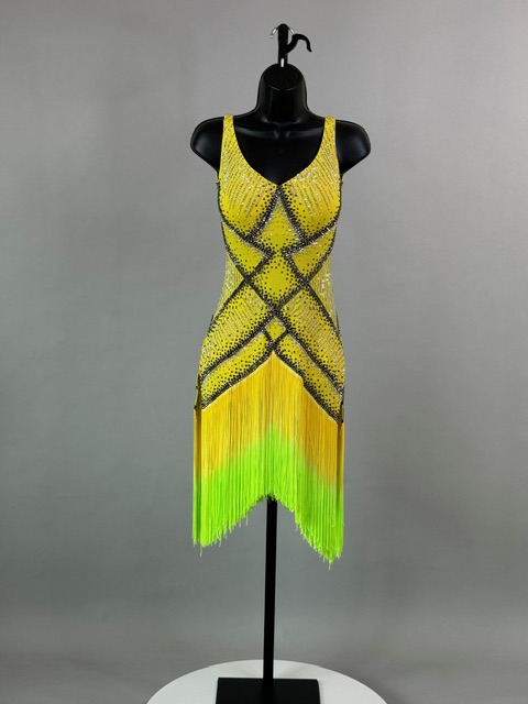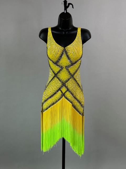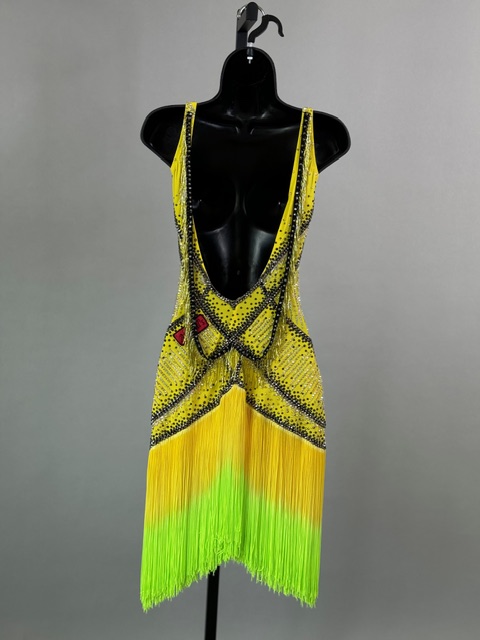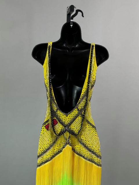 This is a beautiful yellow ombre Rhythm/Latin dress designed by Anabells Designs. Fringes moves amazing on the dance floor. Trimmed with Austrian Crystals.
